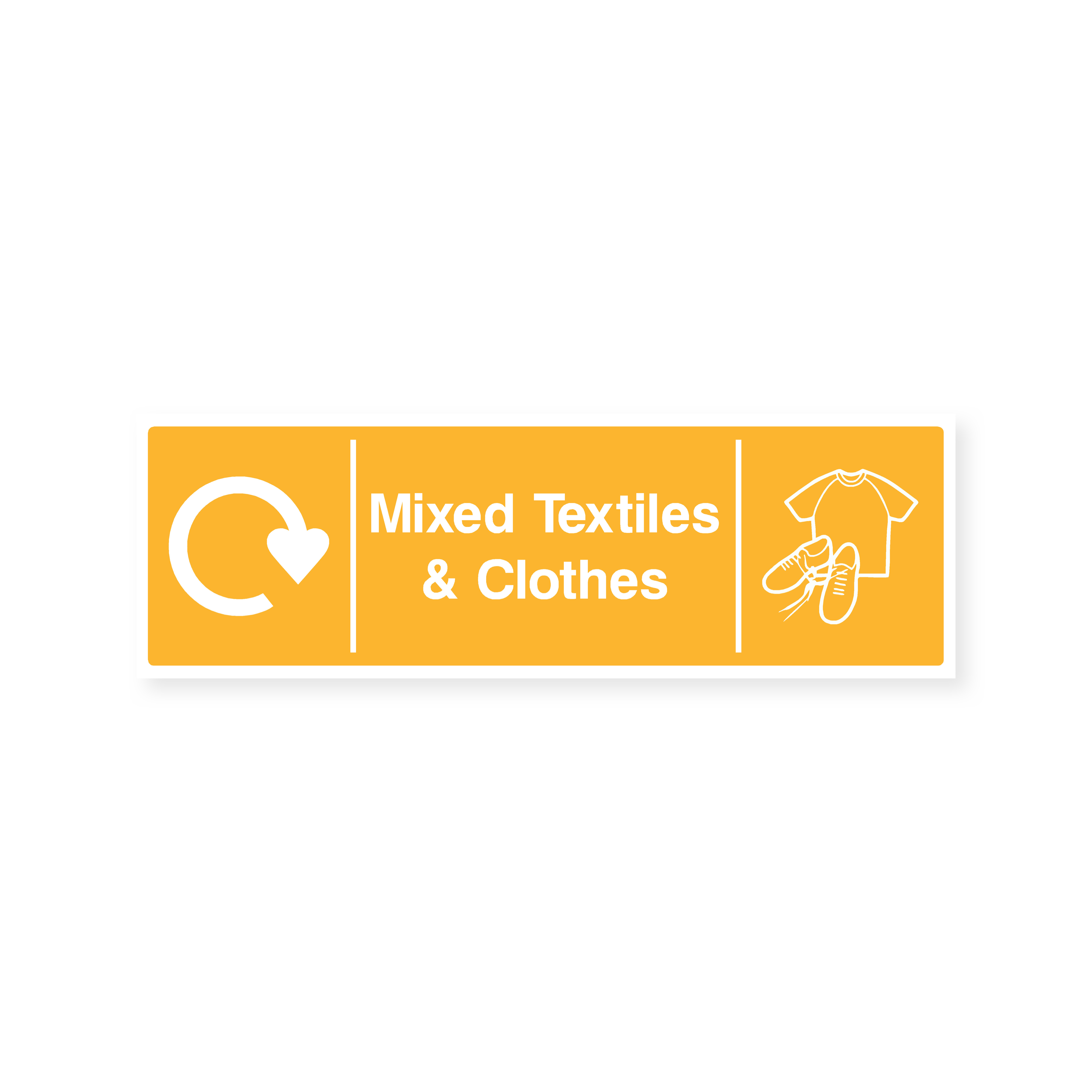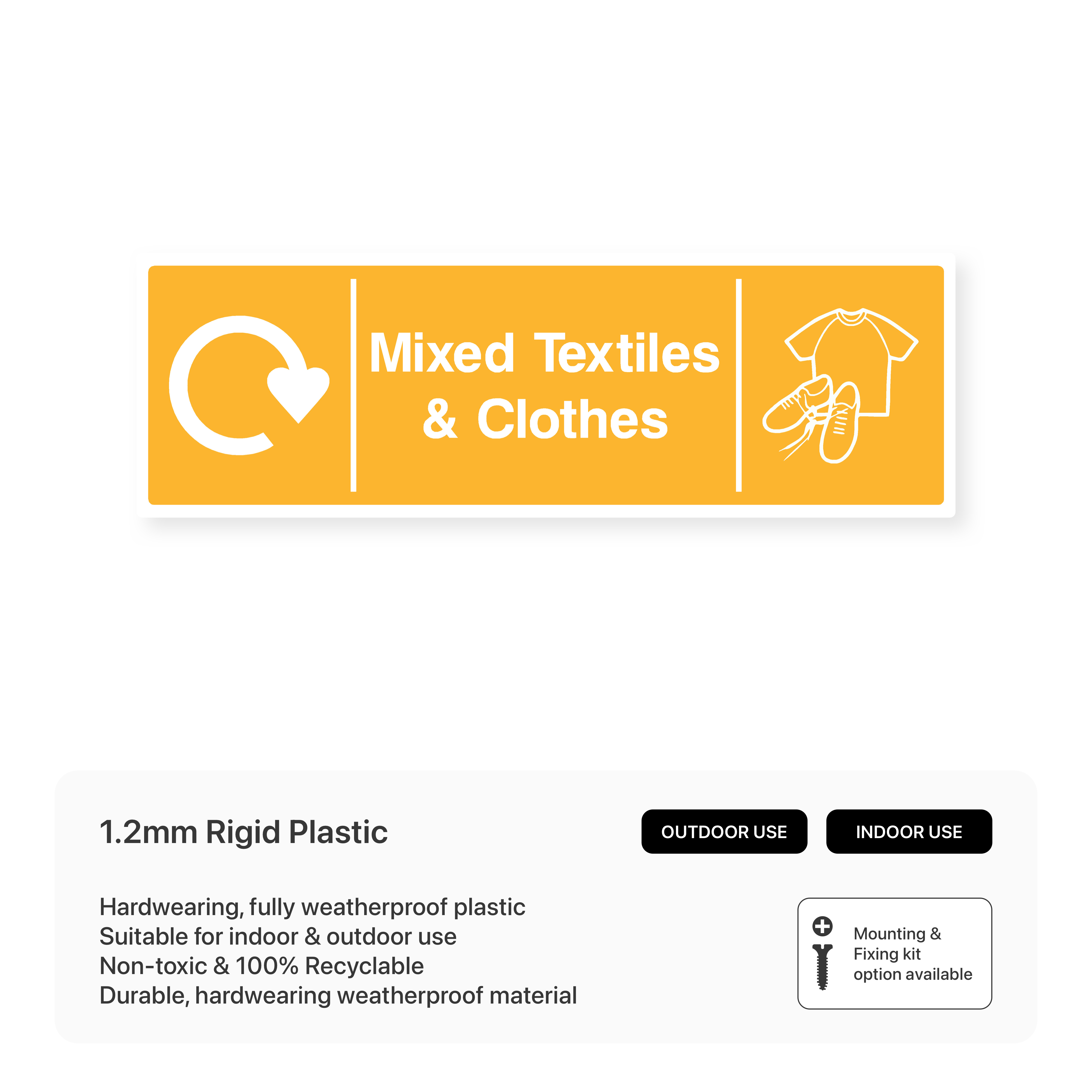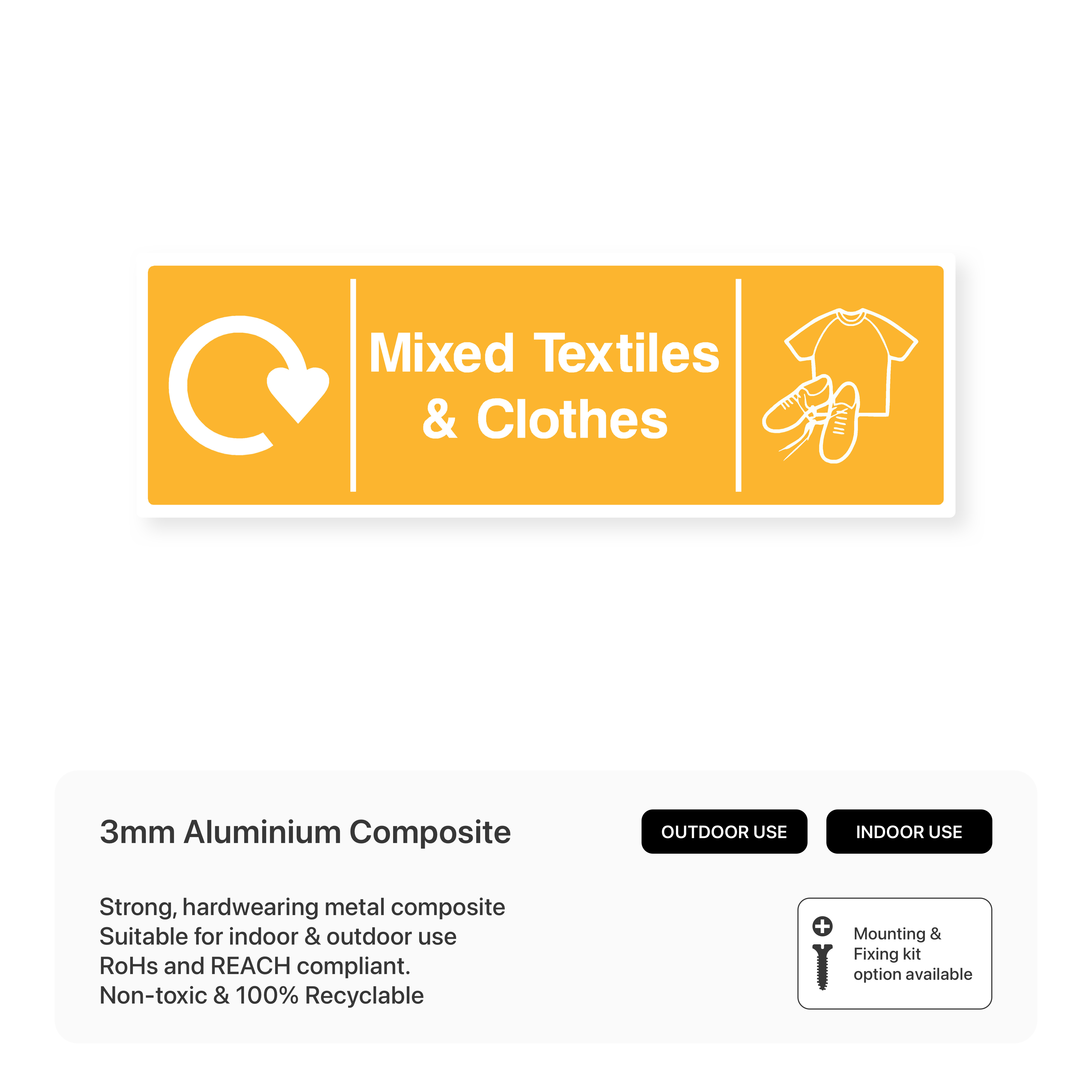 Mixed Textiles & Clothing - Recycling: Encourage recycling or donation of textiles and clothing with this informative sign. Help reduce waste and support charitable causes by directing these items to designated recycling bins or collection points.