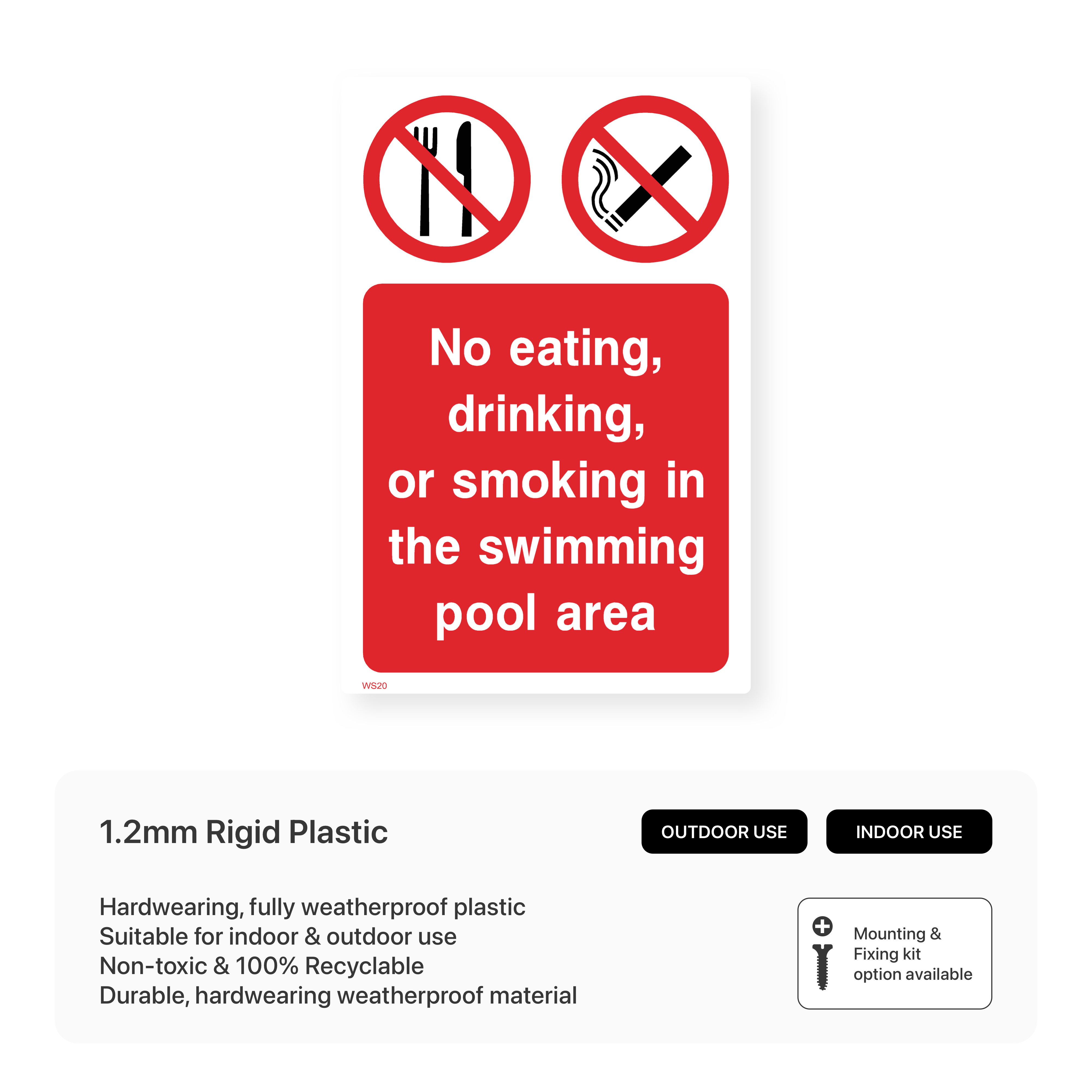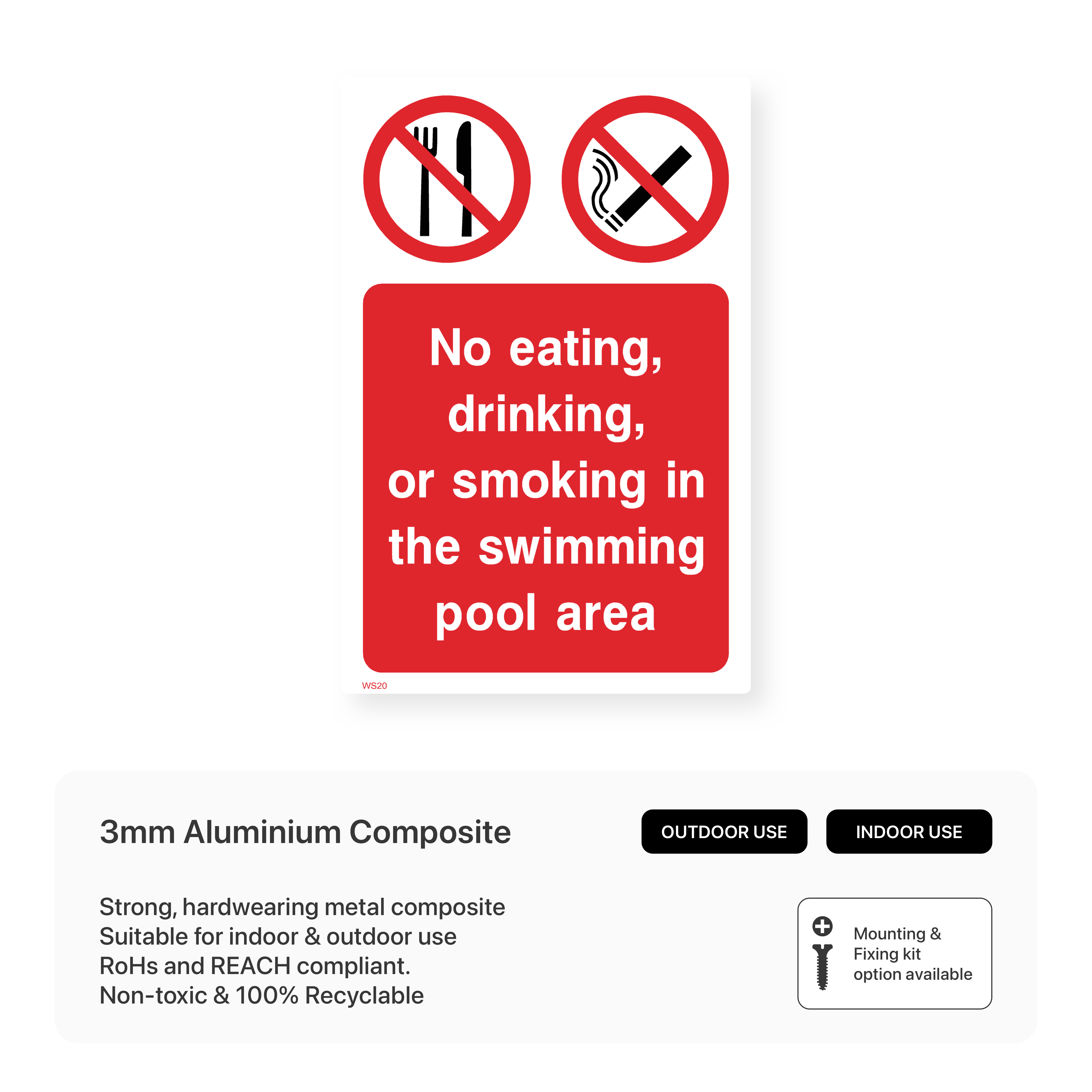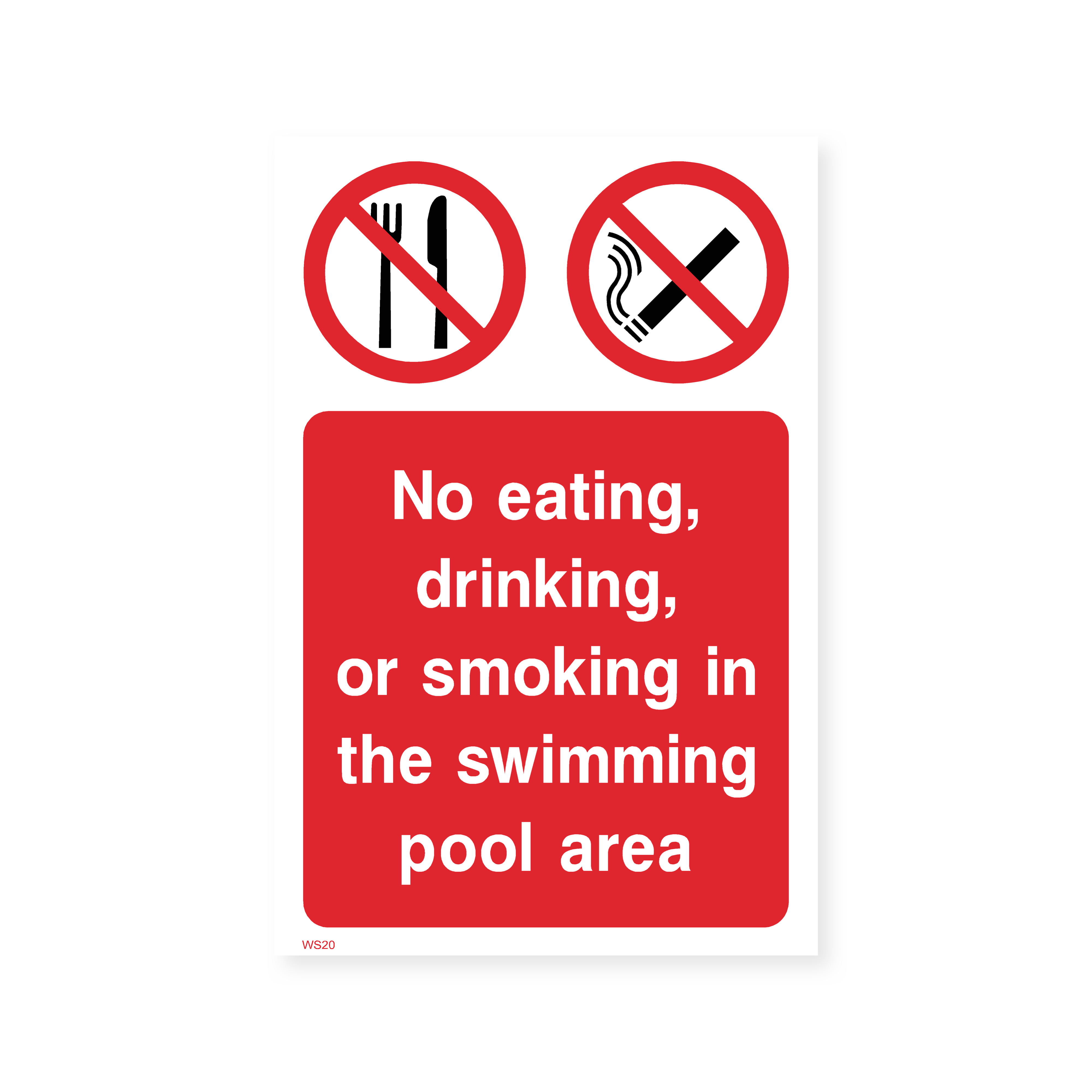 Maintain a clean and hygienic pool environment with our "No Eating, Drinking, or Smoking" sign. Clearly communicates the rules to ensure the safety and enjoyment of all pool users. Prevent accidents and keep the water clean with this essential safety sign. Available in various sizes to suit your pool area.