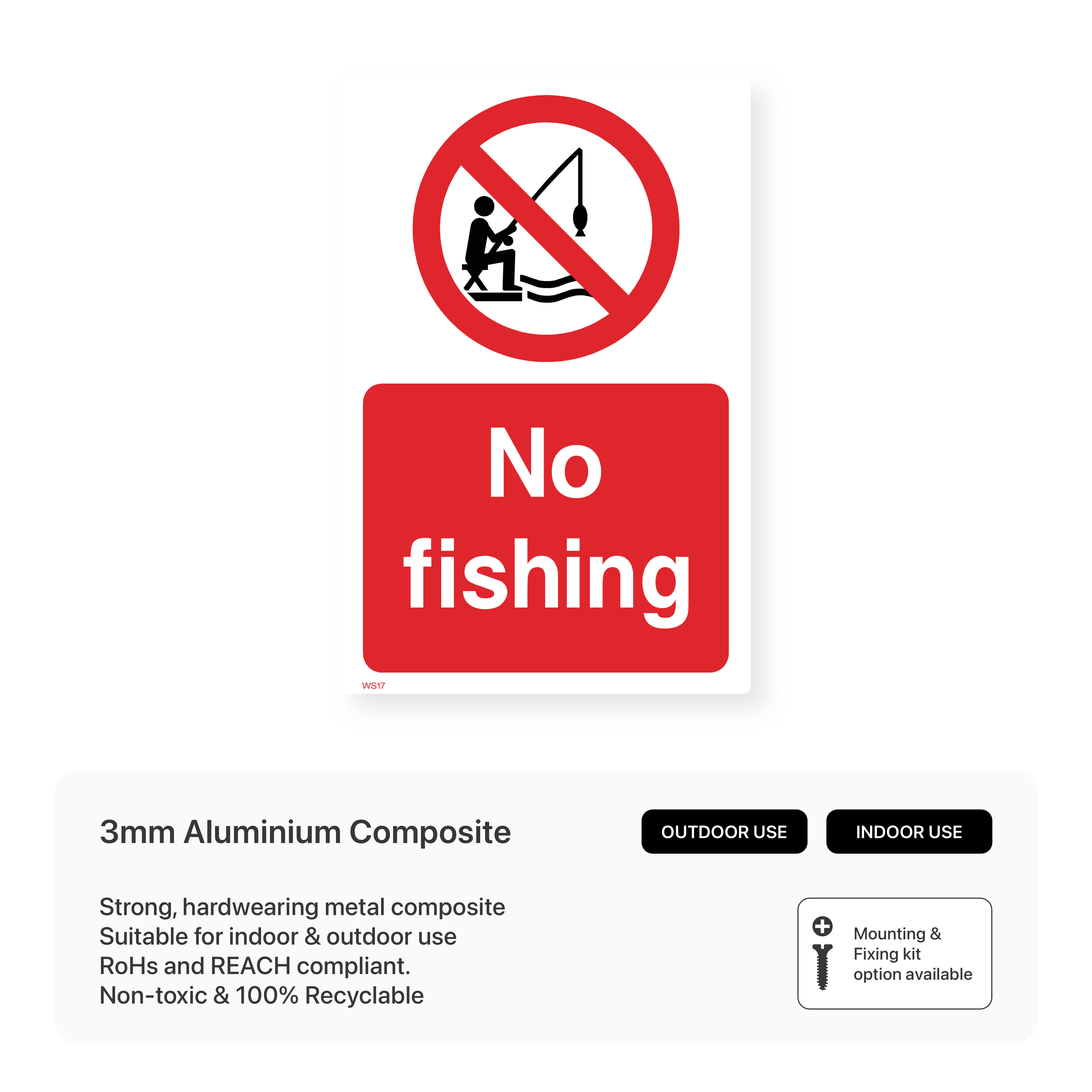 Clearly define fishing zones with our "No Fishing" sign. Helps to prevent conflicts between anglers and other water users, ensuring a safe and enjoyable experience for everyone. Available in a range of sizes to suit different locations.