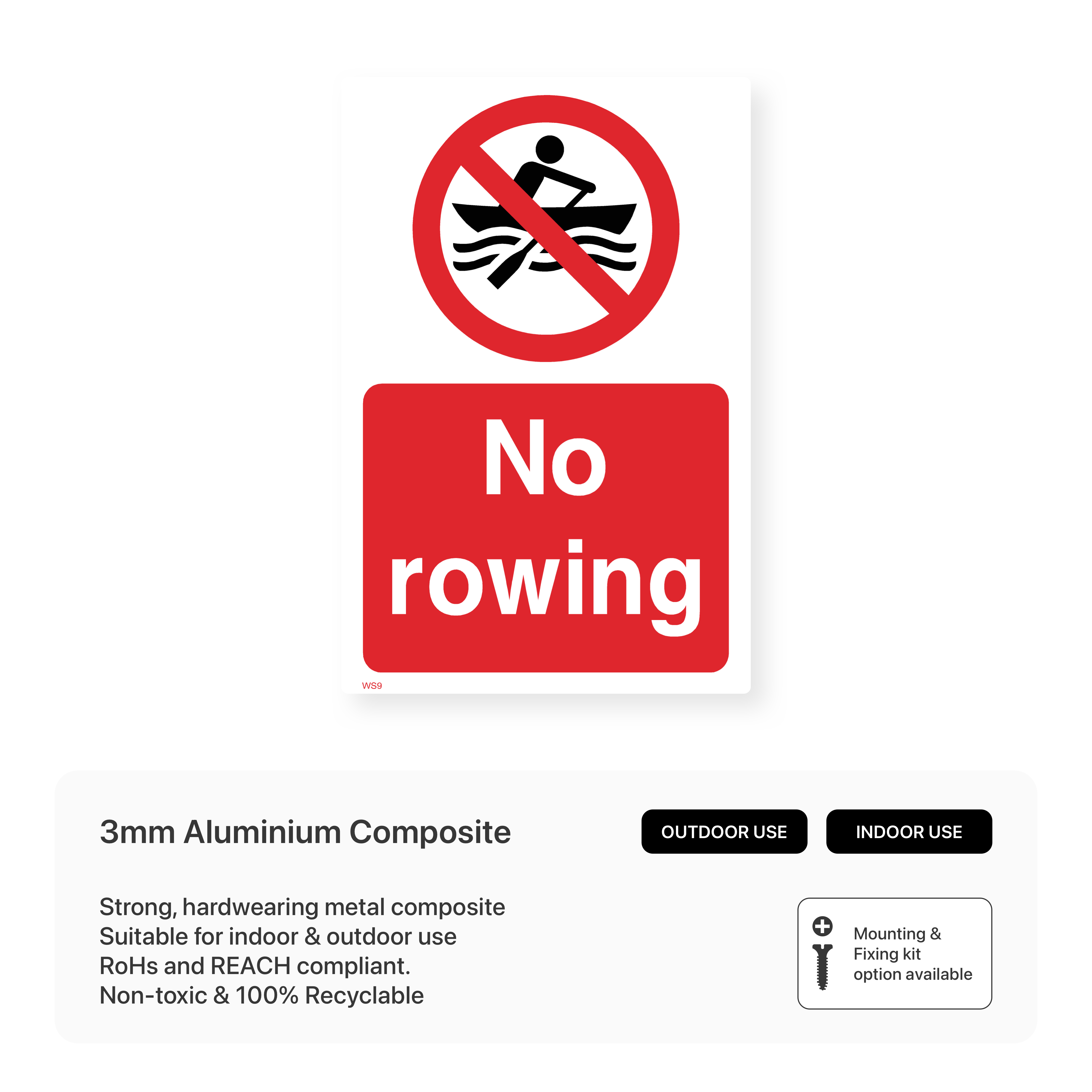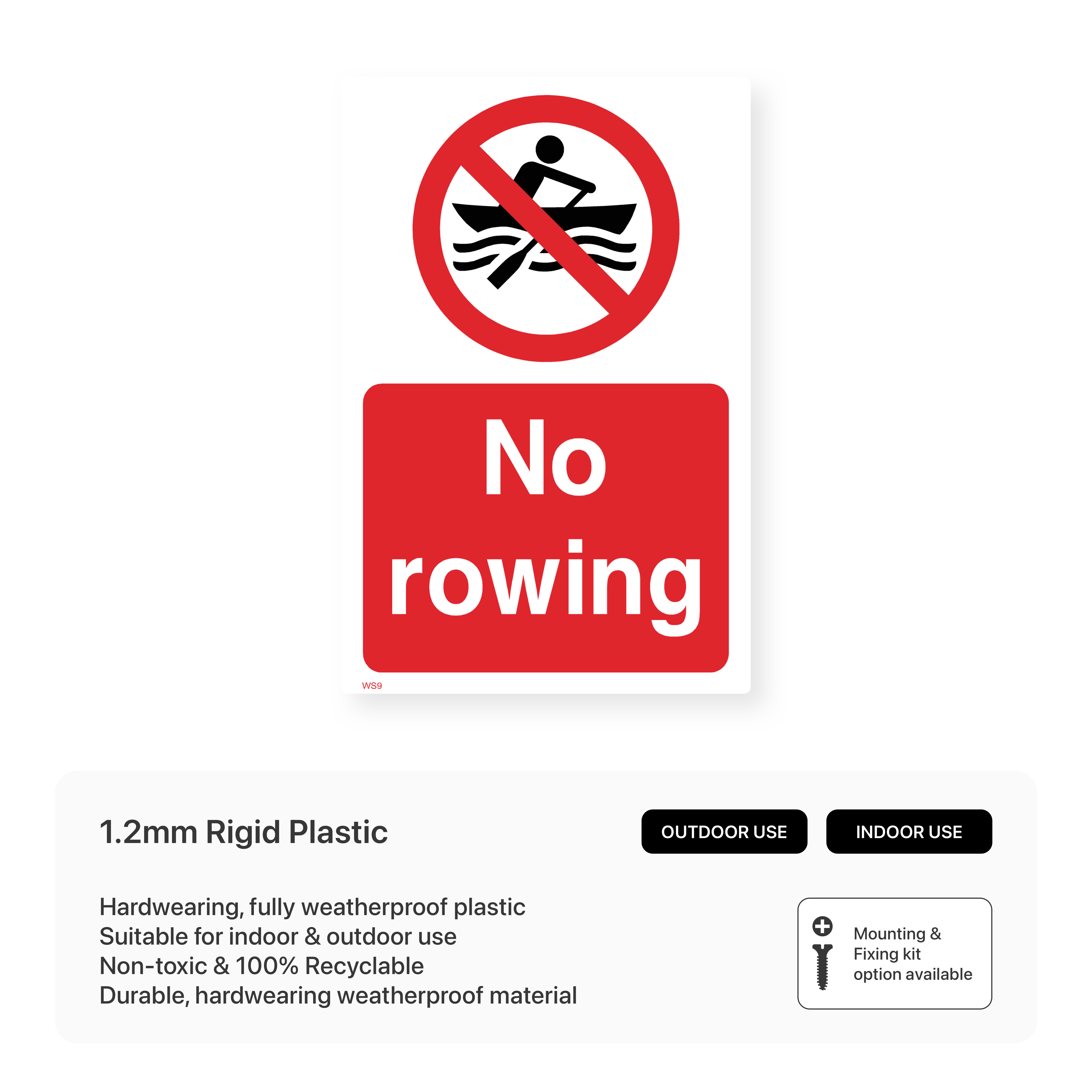 Clearly mark areas where rowing is prohibited with our "No Rowing" sign. This sign helps prevent accidents and conflicts between different water activities. Ideal for swimming areas, restricted zones, and other locations where rowing is not allowed.