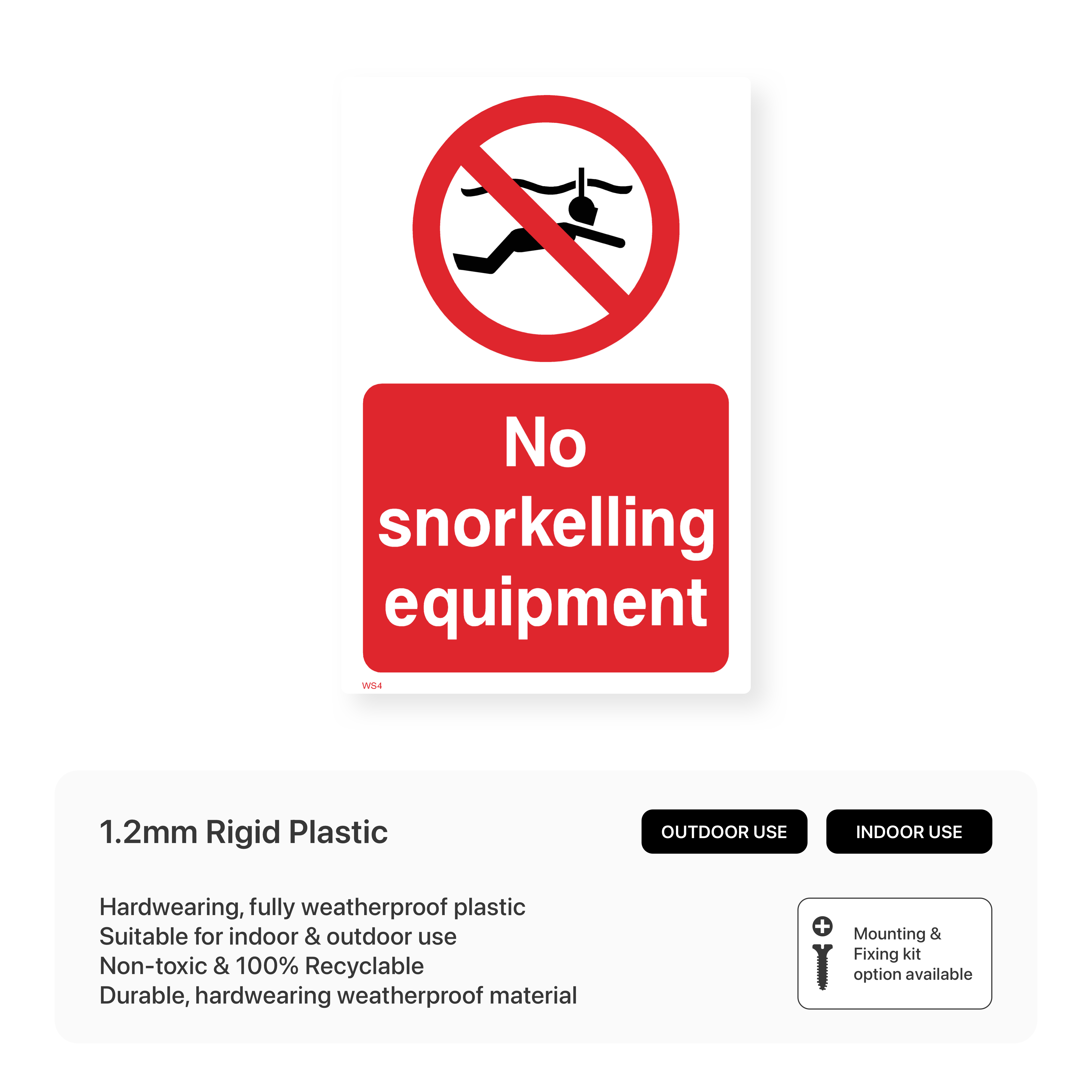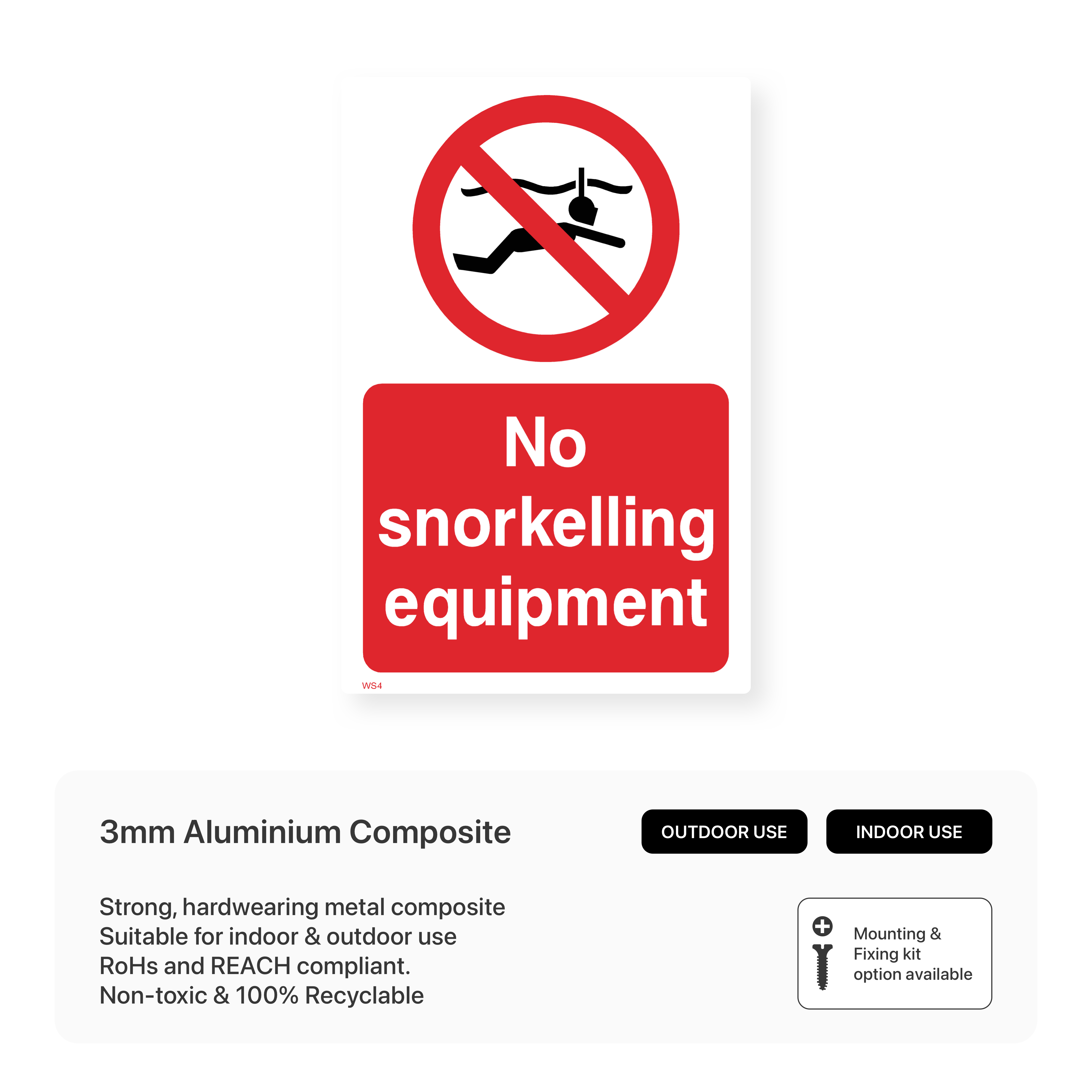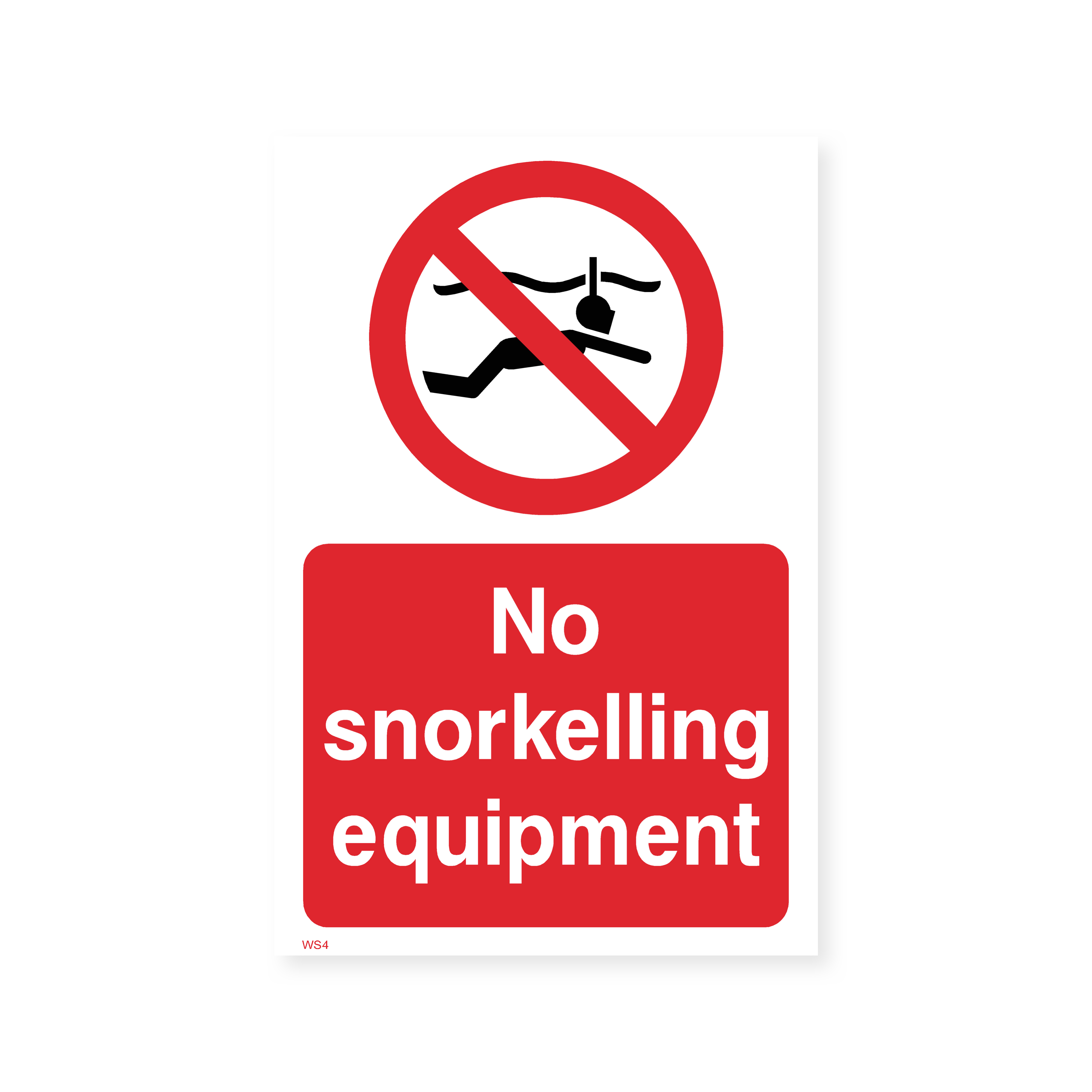 Ensure safety and order with our "No Snorkelling Equipment" sign. This sign clearly indicates areas where the use of snorkelling equipment is prohibited, helping to prevent accidents and maintain a safe environment. Ideal for swimming pools, beaches, and other water areas.