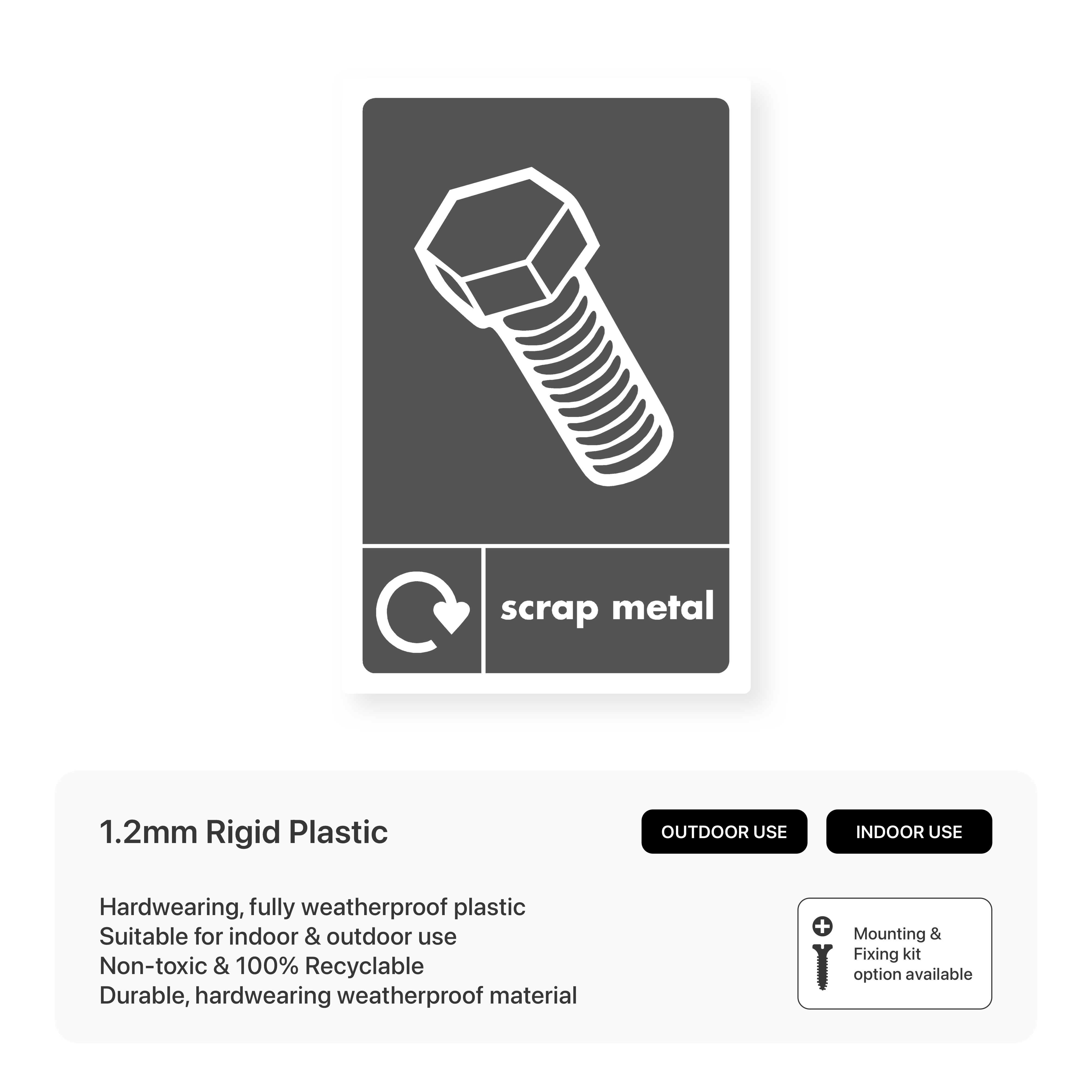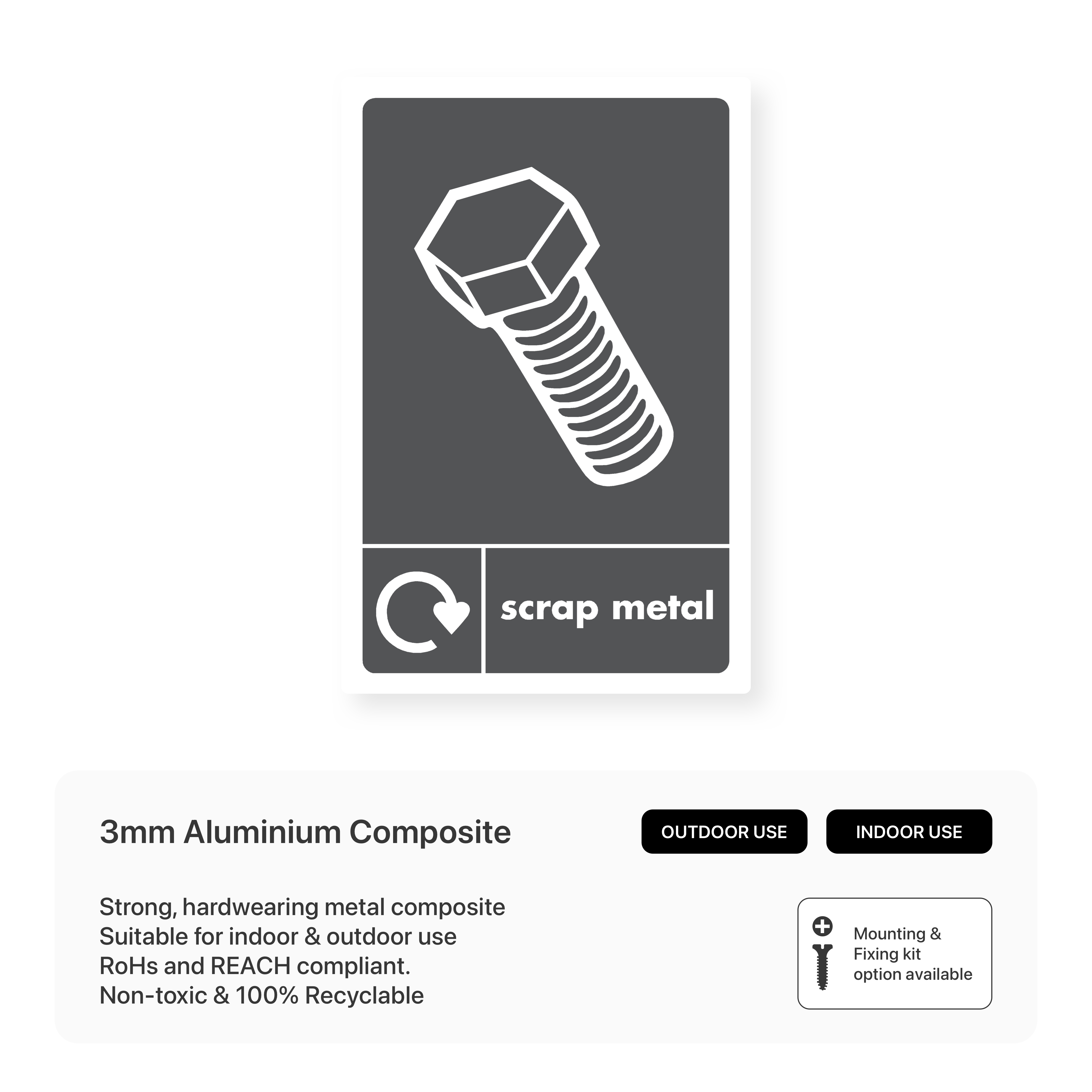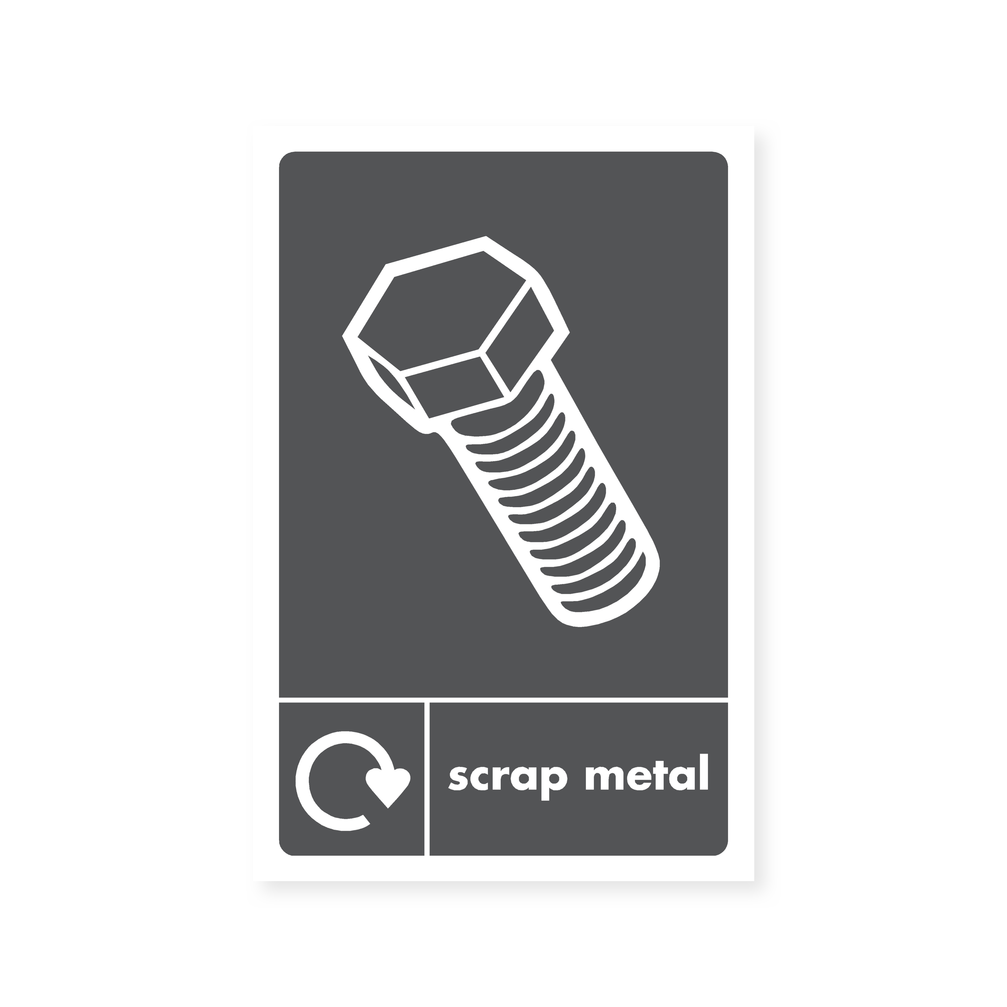 Scrap Metal - Portrait - Recycling: Encourage recycling of scrap metal with this portrait-oriented informative sign. Help reduce waste and conserve resources by directing scrap metal to designated recycling points or collection bins.