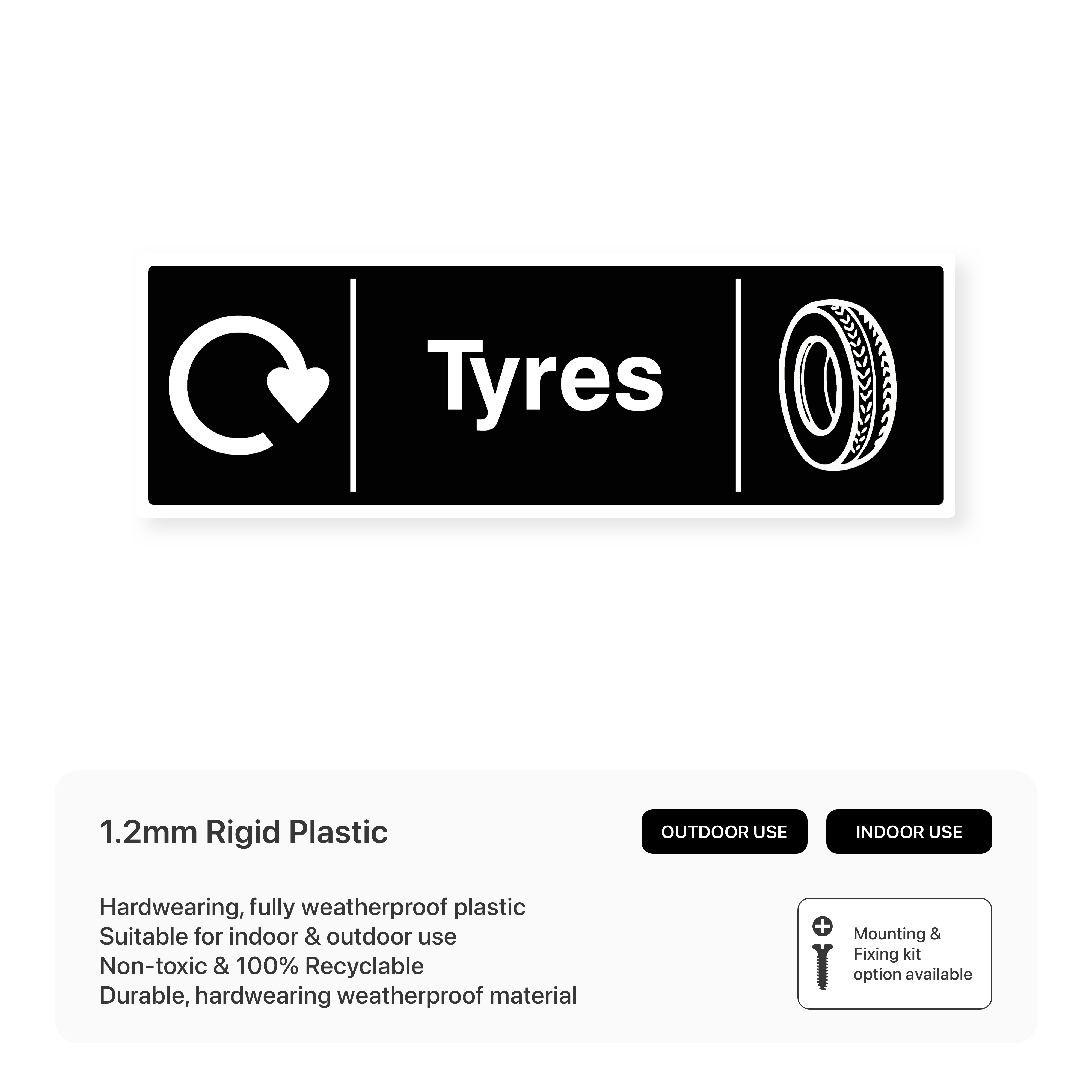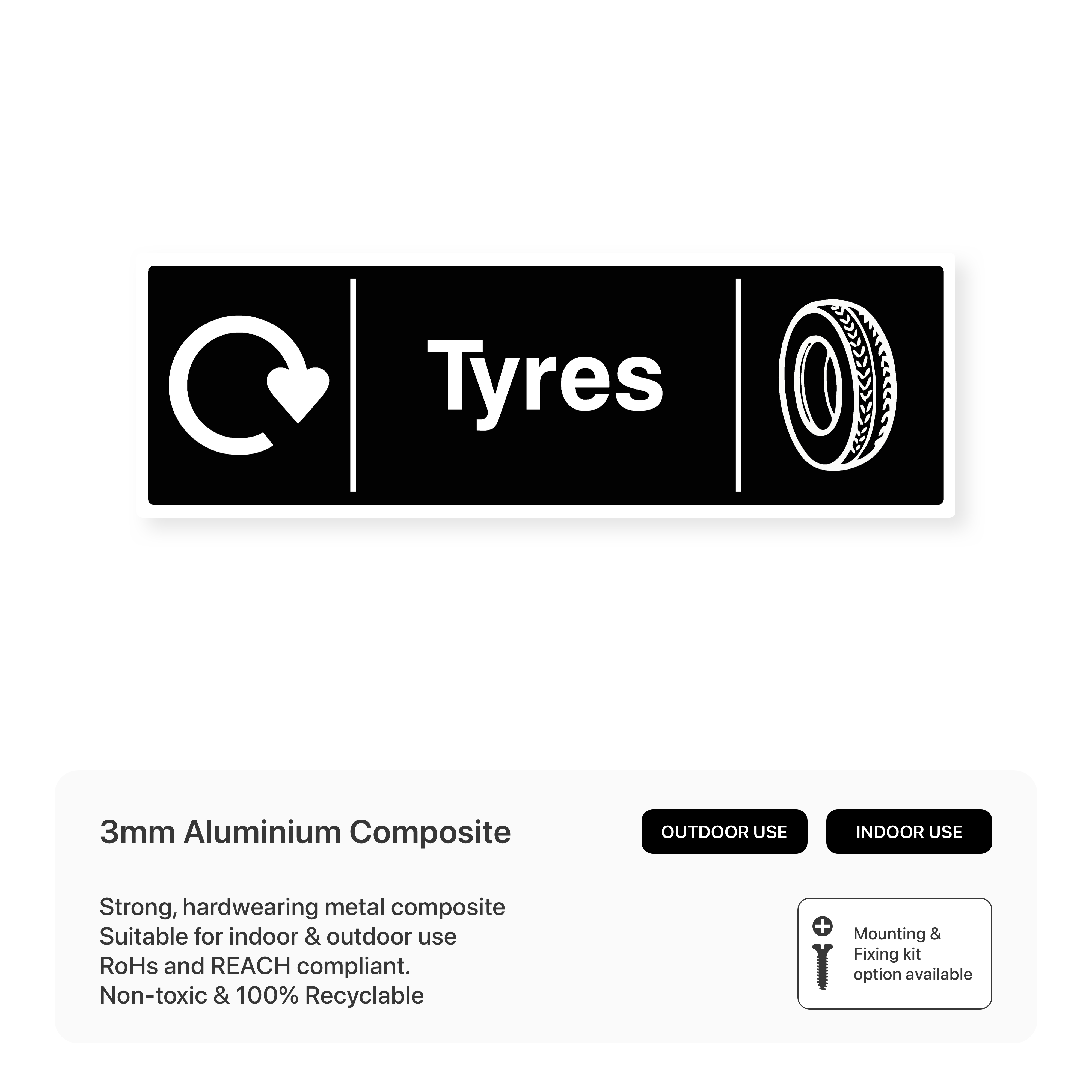 Tyres - Recycling: Inform about the proper disposal or recycling of tyres with this sign. Direct tyres to designated collection points or recycling centers, ensuring safe and responsible disposal of this bulky waste.