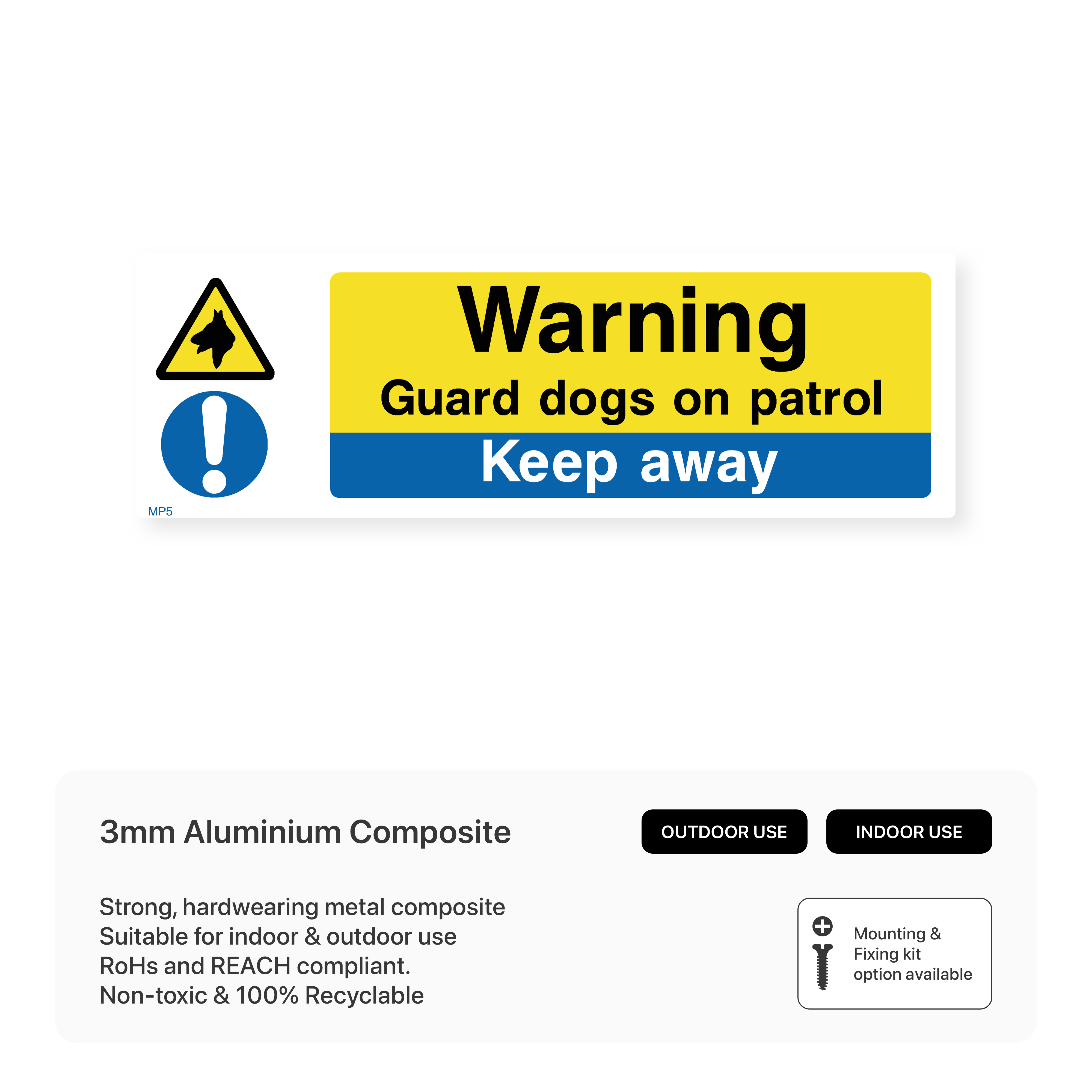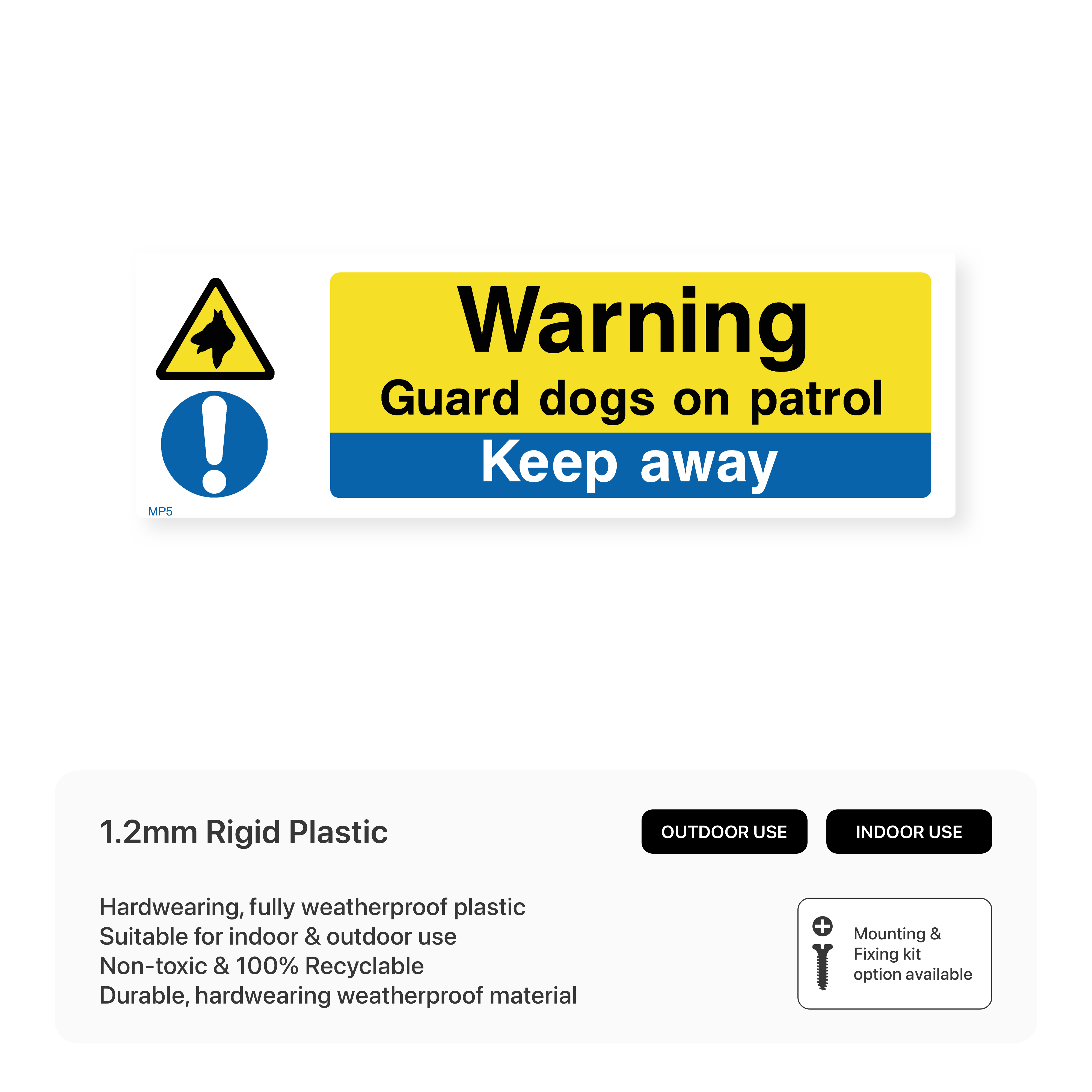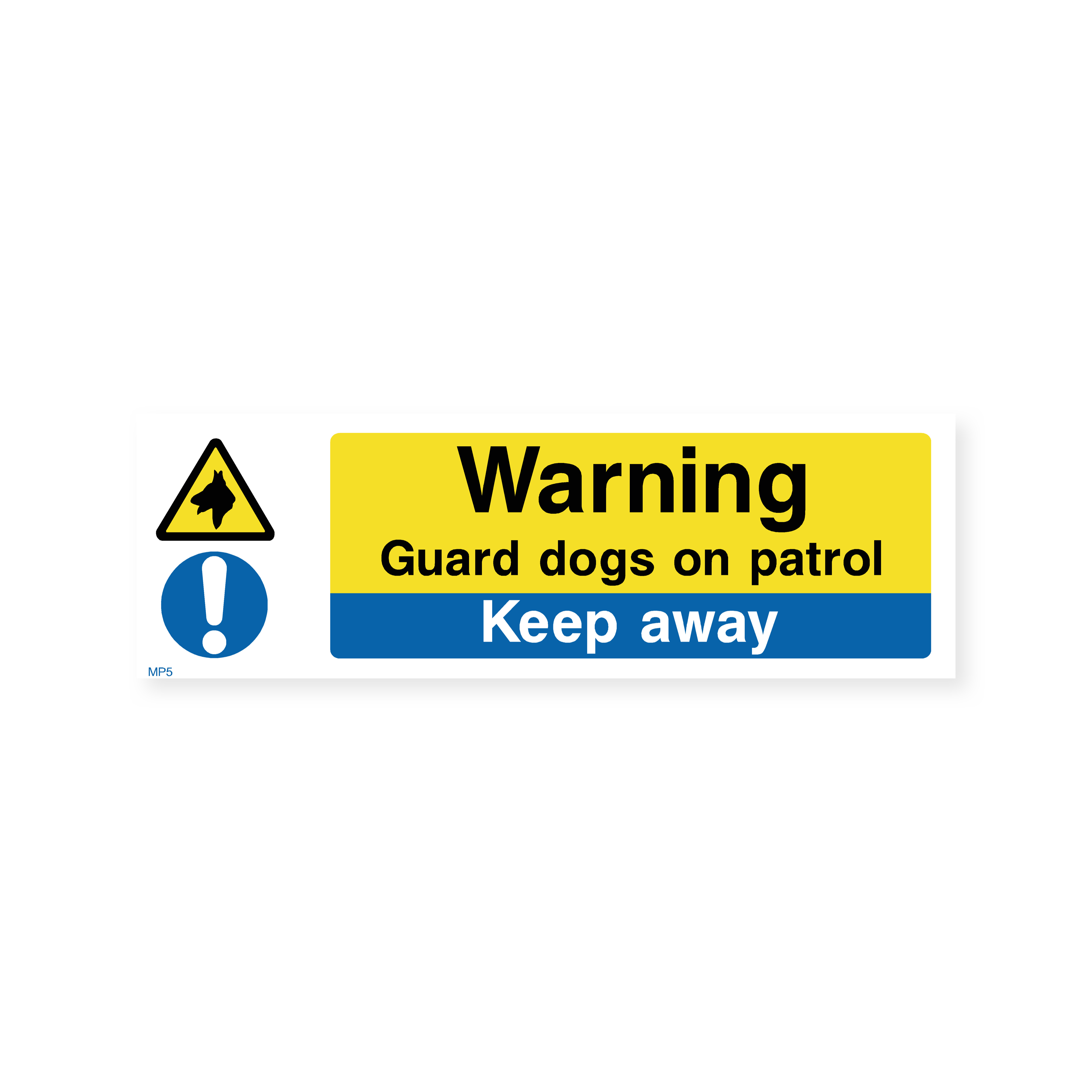 Deter unauthorized access and prevent encounters with guard dogs with this clear warning sign. It alerts individuals to the presence of guard dogs and advises them to keep away for their safety. Ideal for properties with guard dog security, construction sites, and other areas where guard dogs are on patrol.