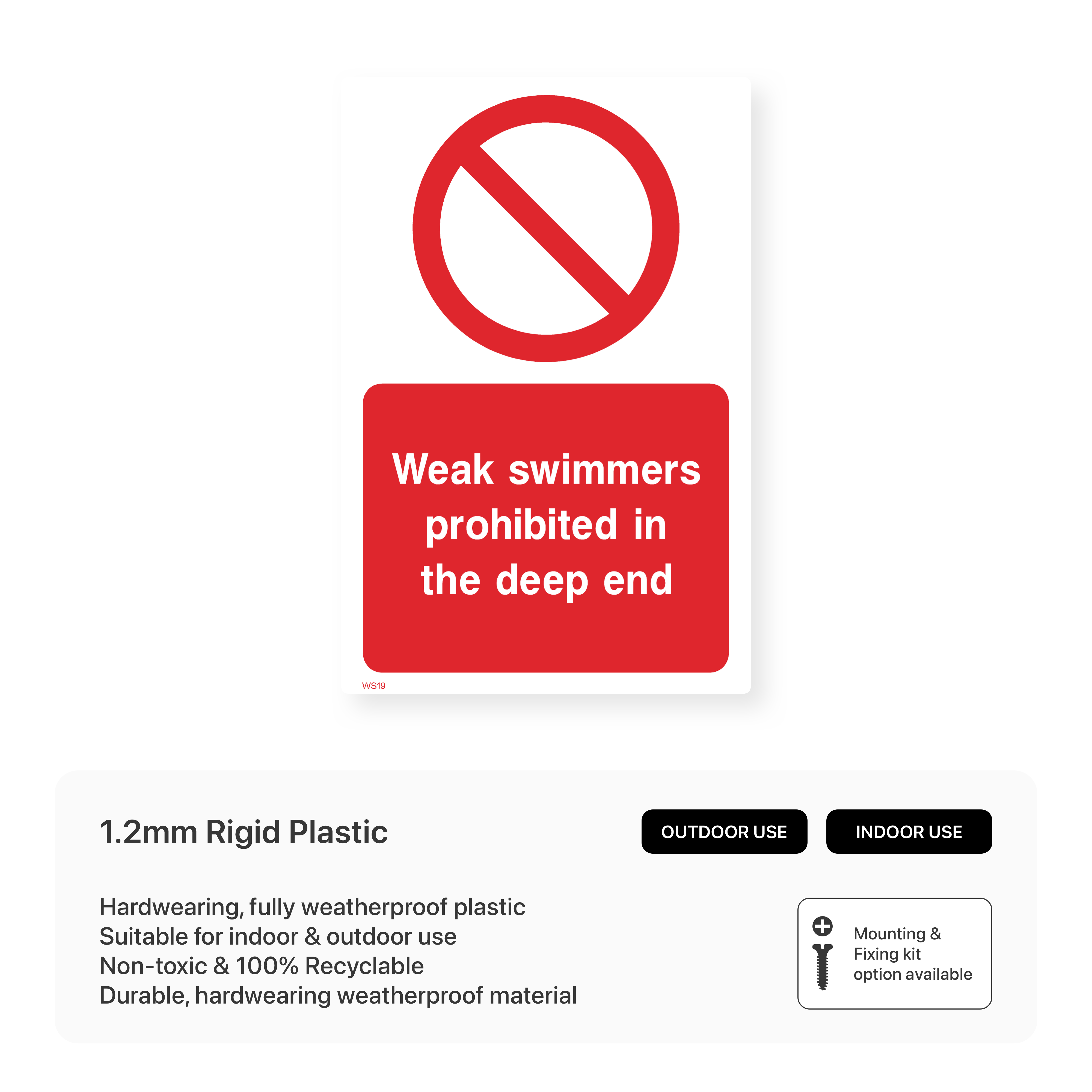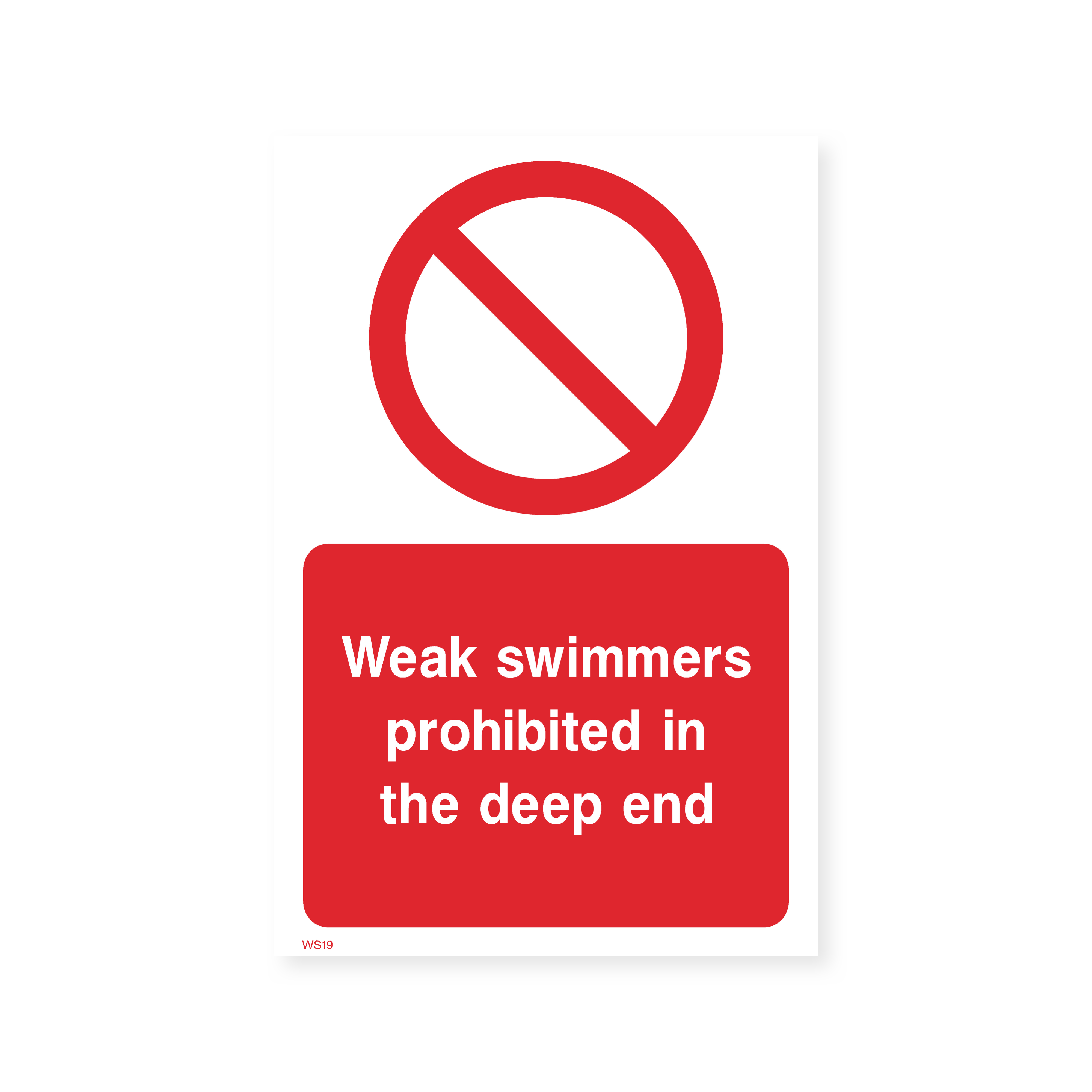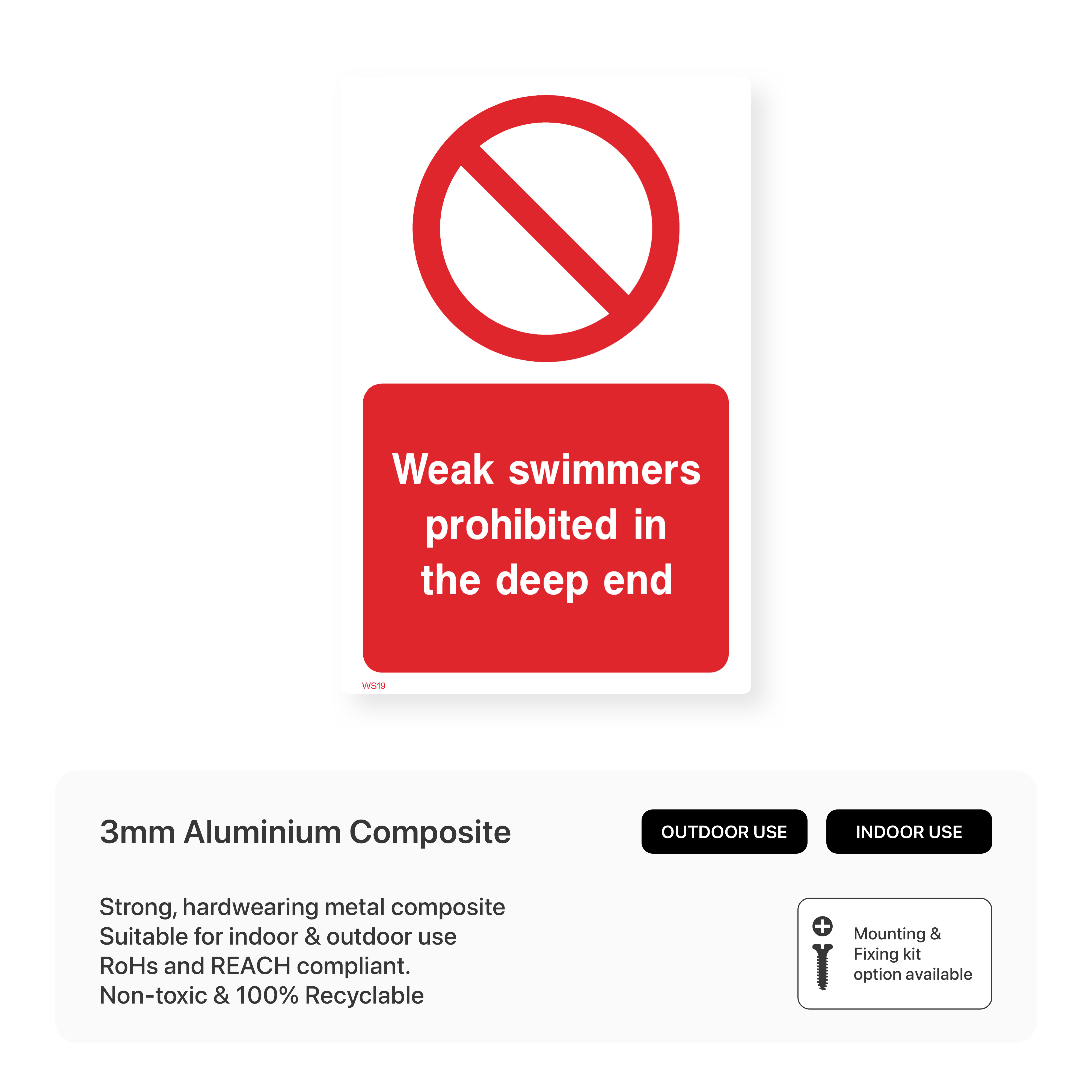 Prioritise safety in the deep end with our "Weak Swimmers Prohibited" sign. Clearly communicates the restriction for less confident swimmers, reducing the risk of accidents. Ideal for swimming pools with varying depths. Choose from a variety of sizes to suit your pool area.