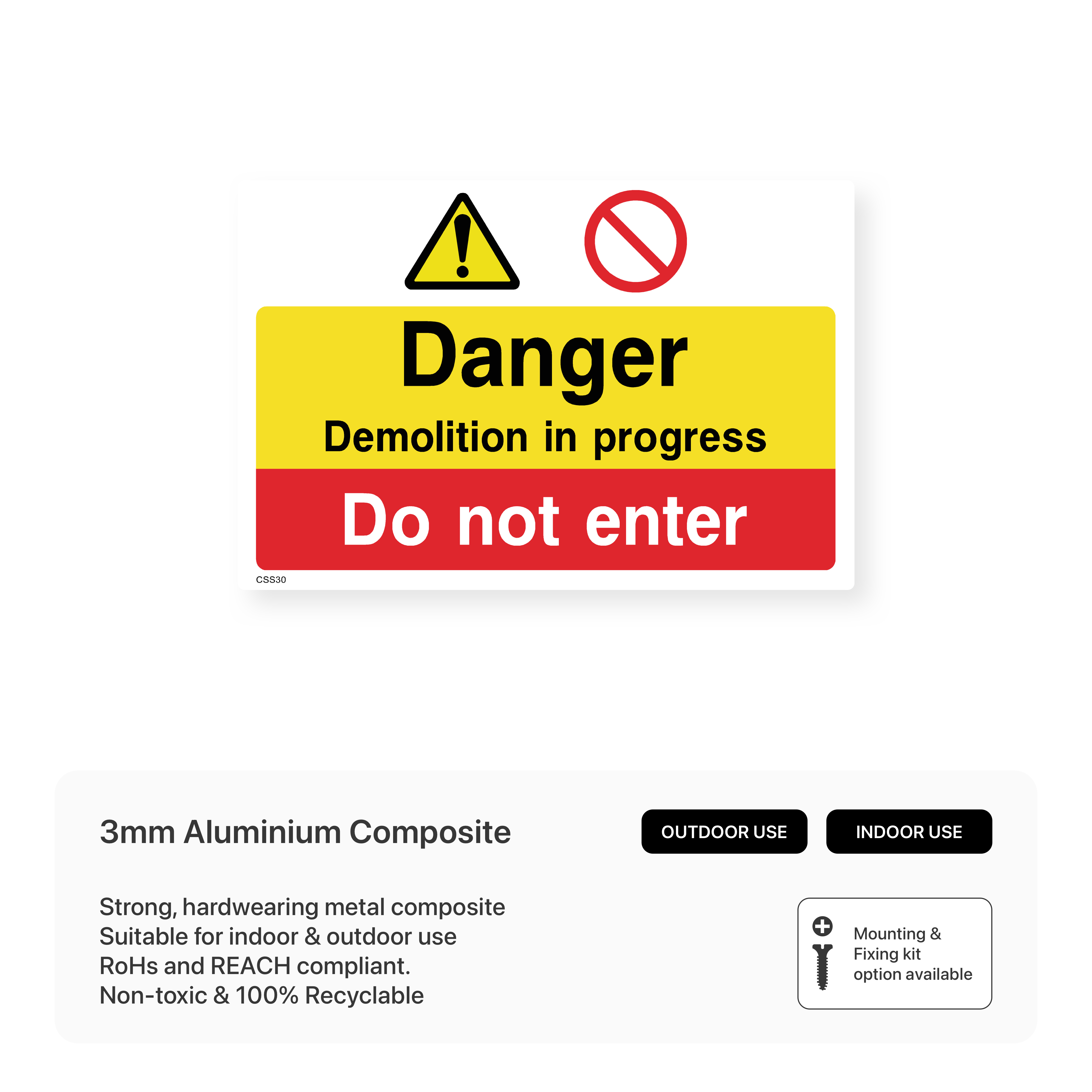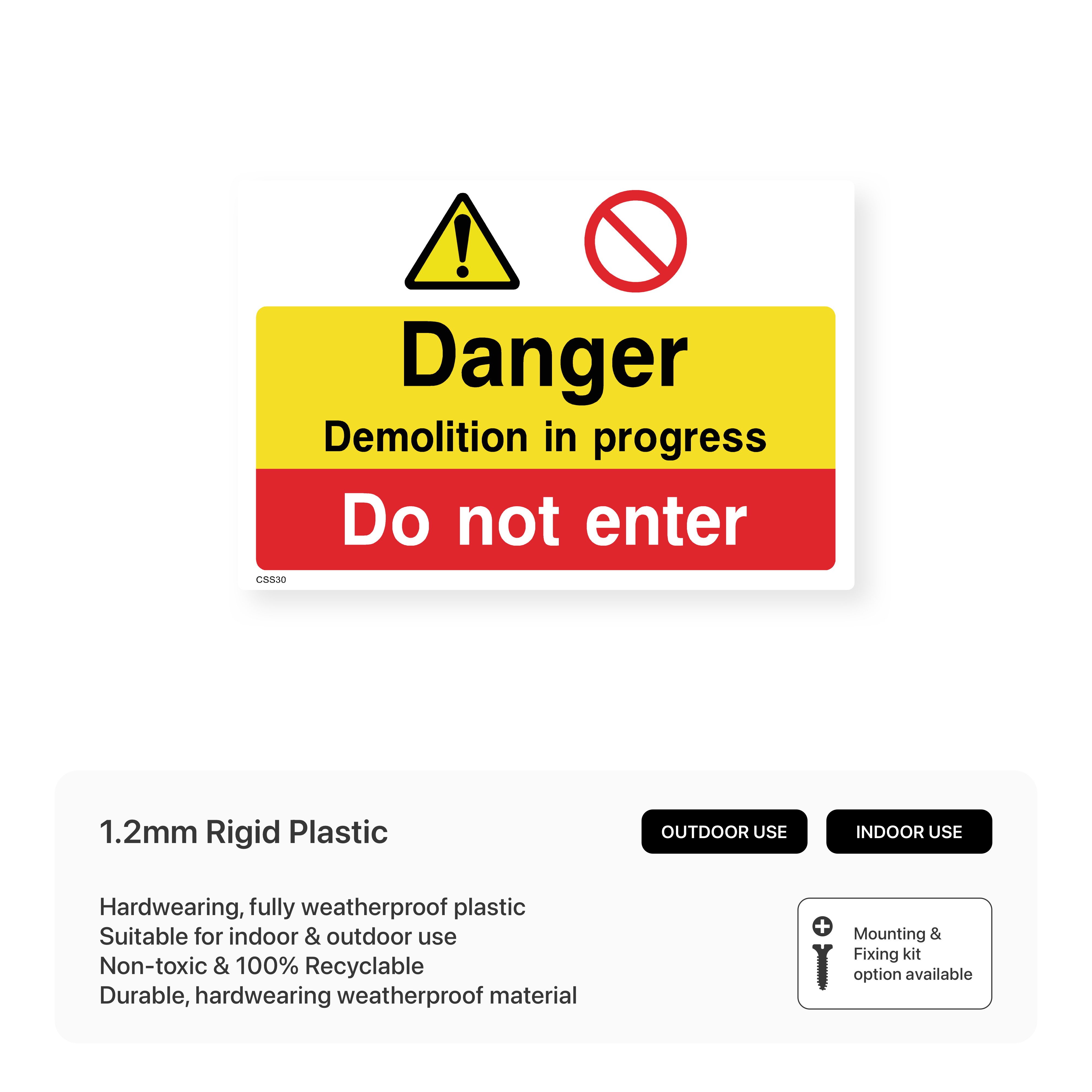 Alert workers and visitors to ongoing demolition activities with our "Danger demolition in progress" sign. Clearly mark demolition zones to prevent unauthorised entry and ensure the safety of everyone on site.