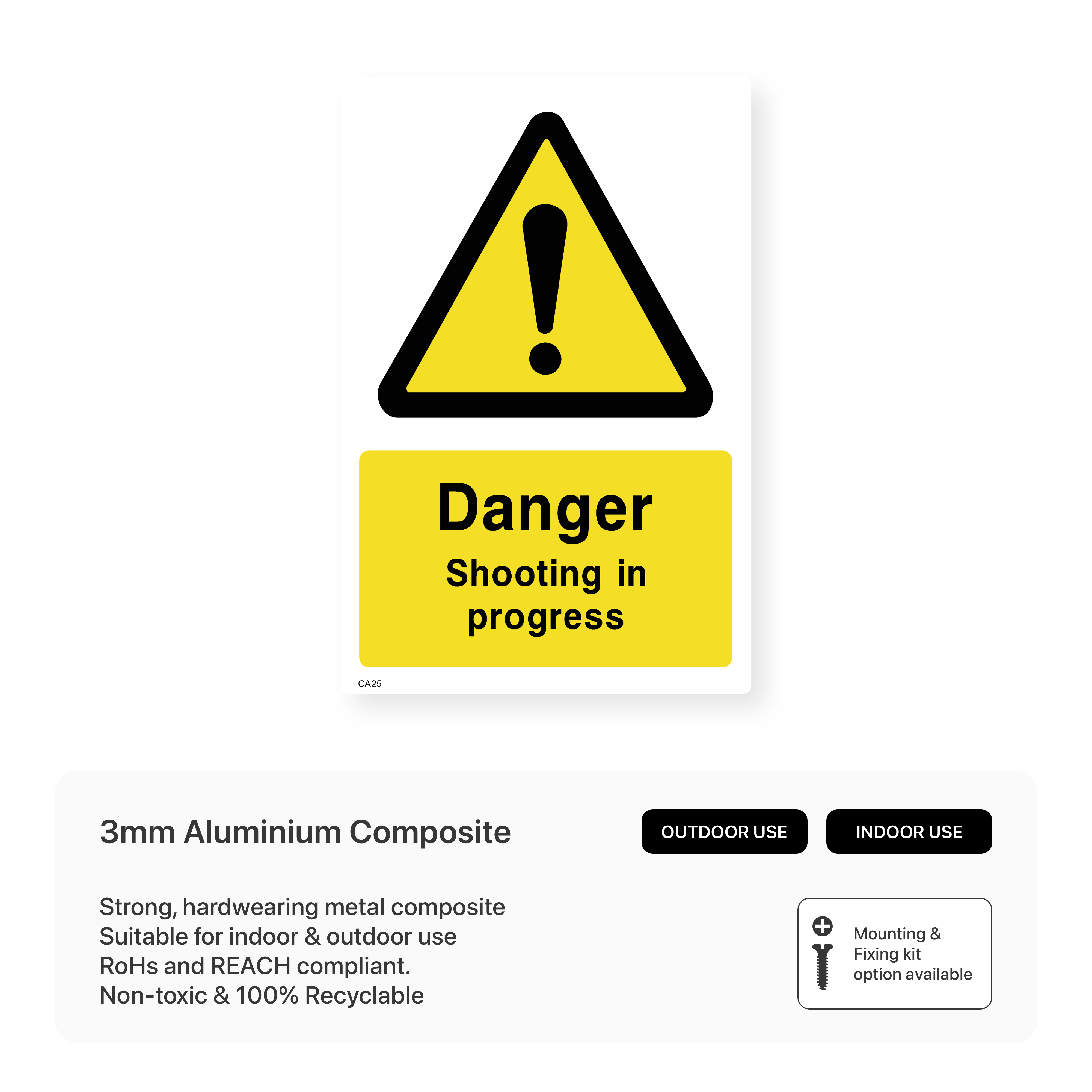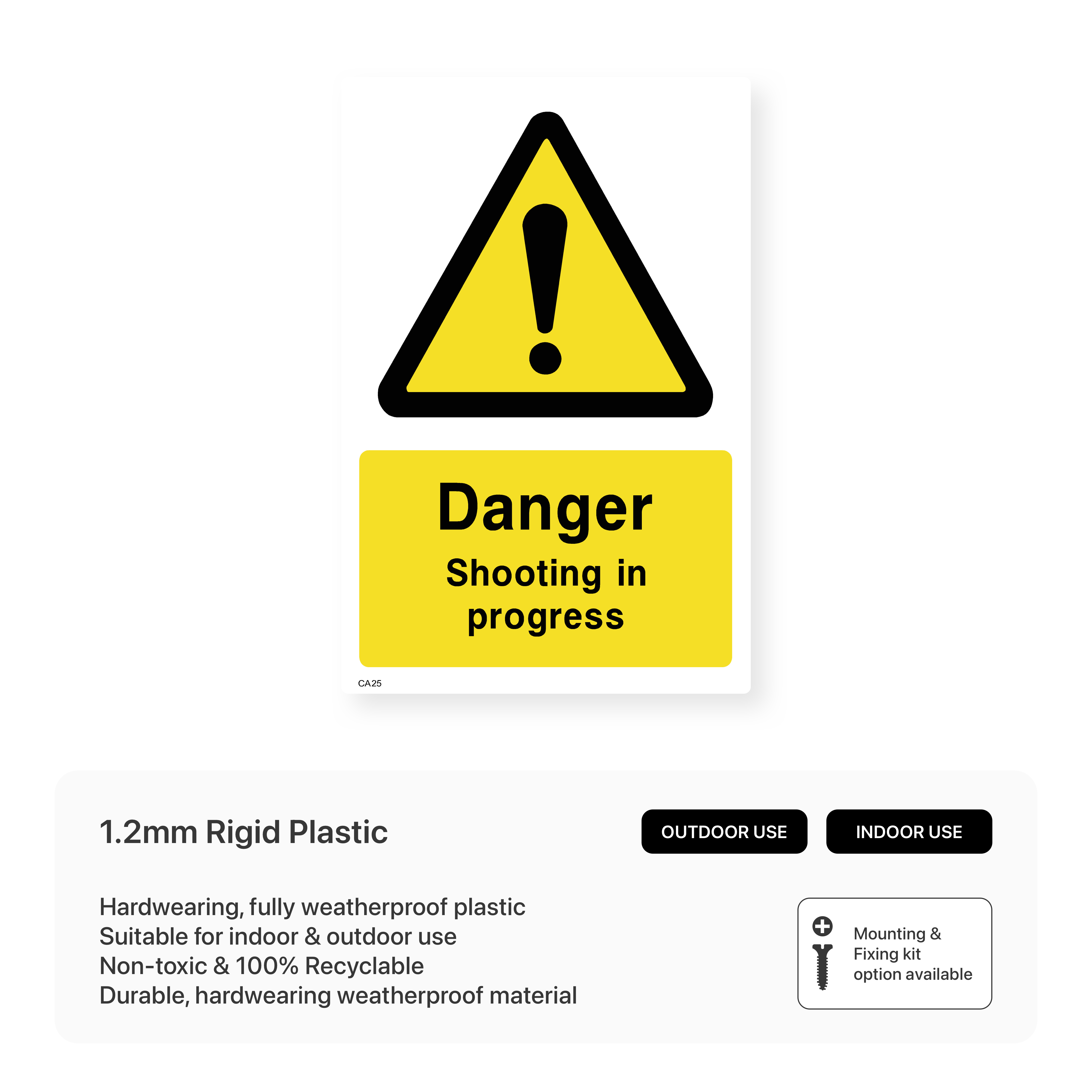 Alert individuals to ongoing shooting activities in the area. Available in various sizes and materials, these signs help prevent accidents by warning people to stay clear of the shooting zone.