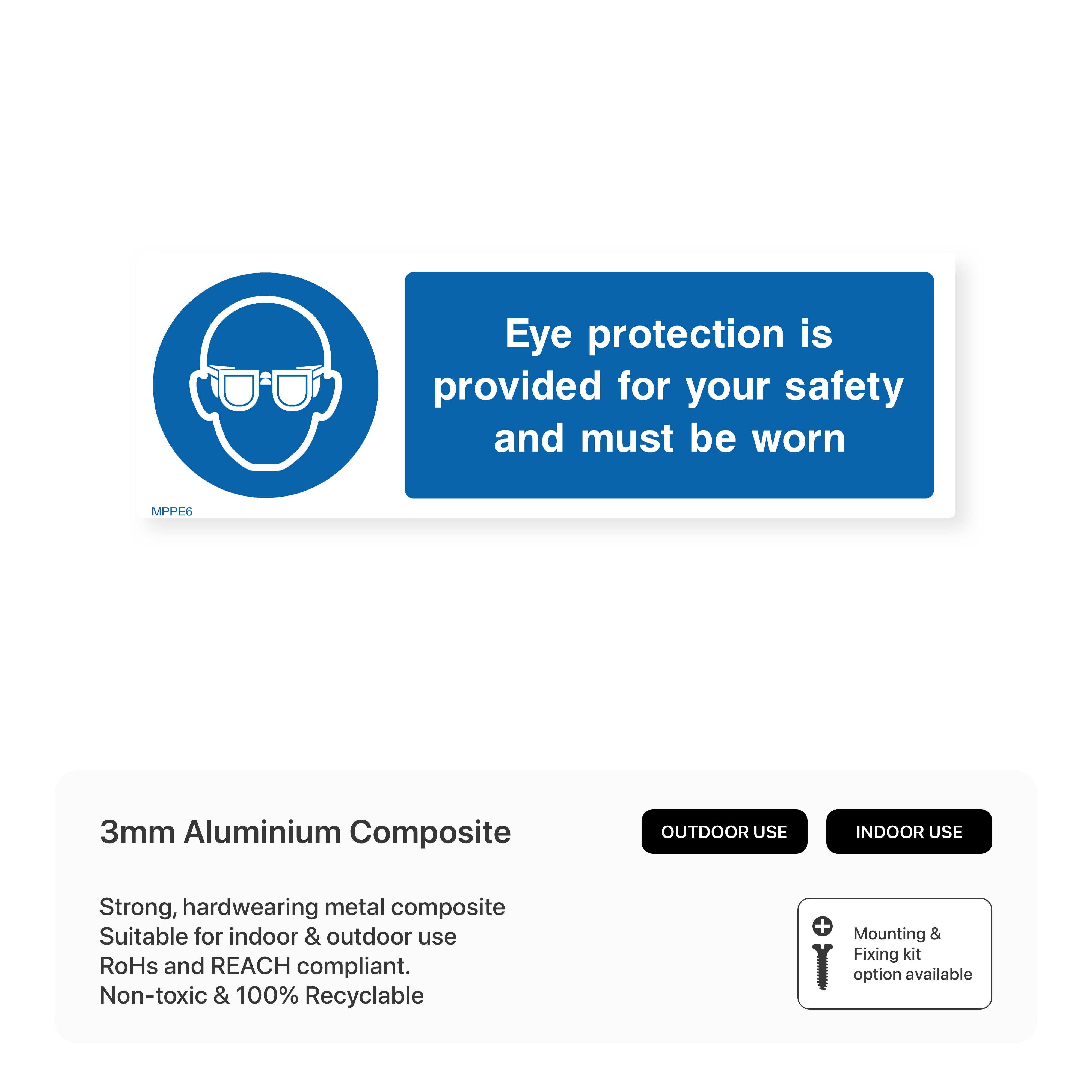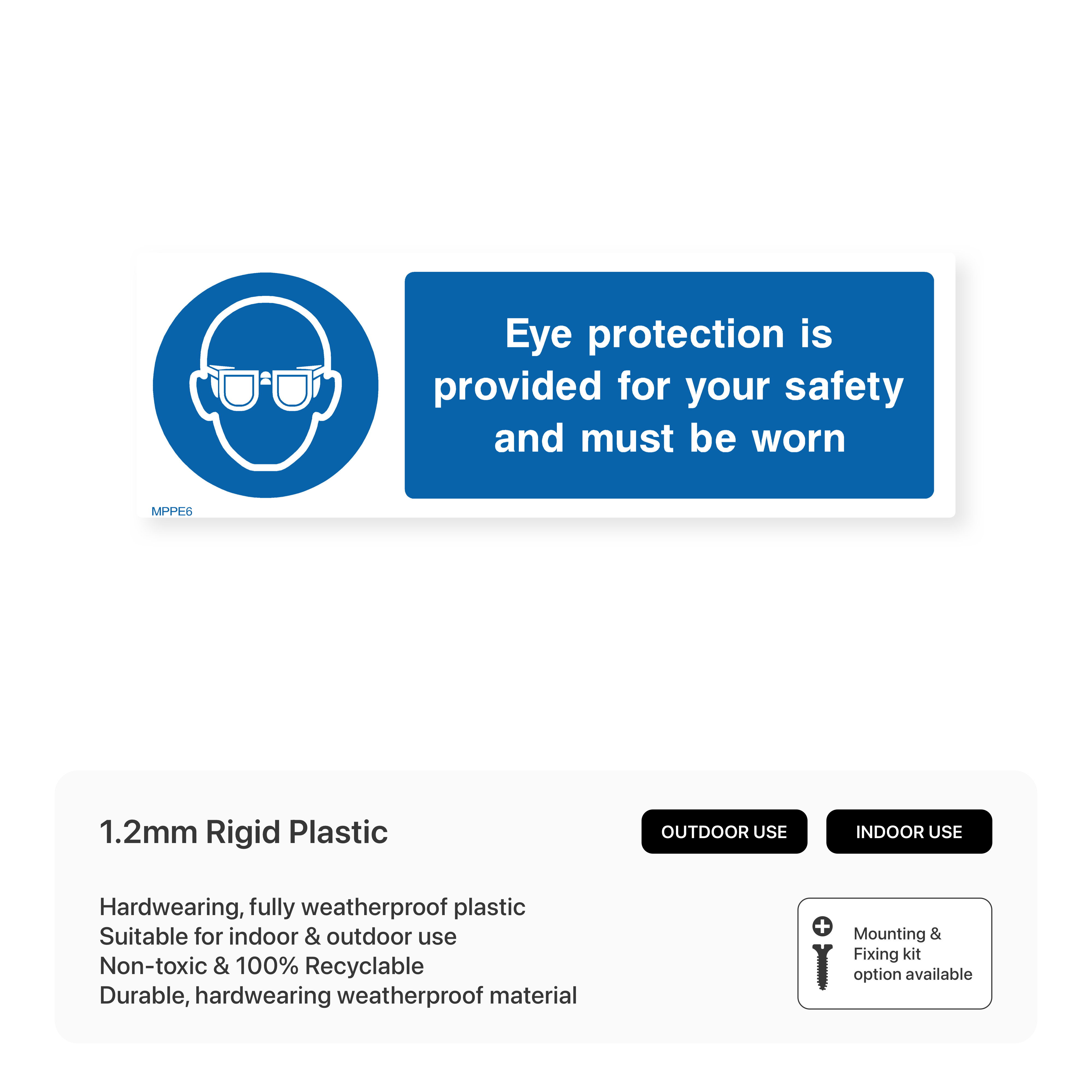Inform and protect your employees with our "Eye Protection is Provided for Your Safety and Must Be Worn" sign. This sign clearly communicates the availability of eye protection and the mandatory requirement to wear it in designated areas. Ensure a safe workplace and demonstrate your commitment to employee well-being with our clear and durable safety signage.