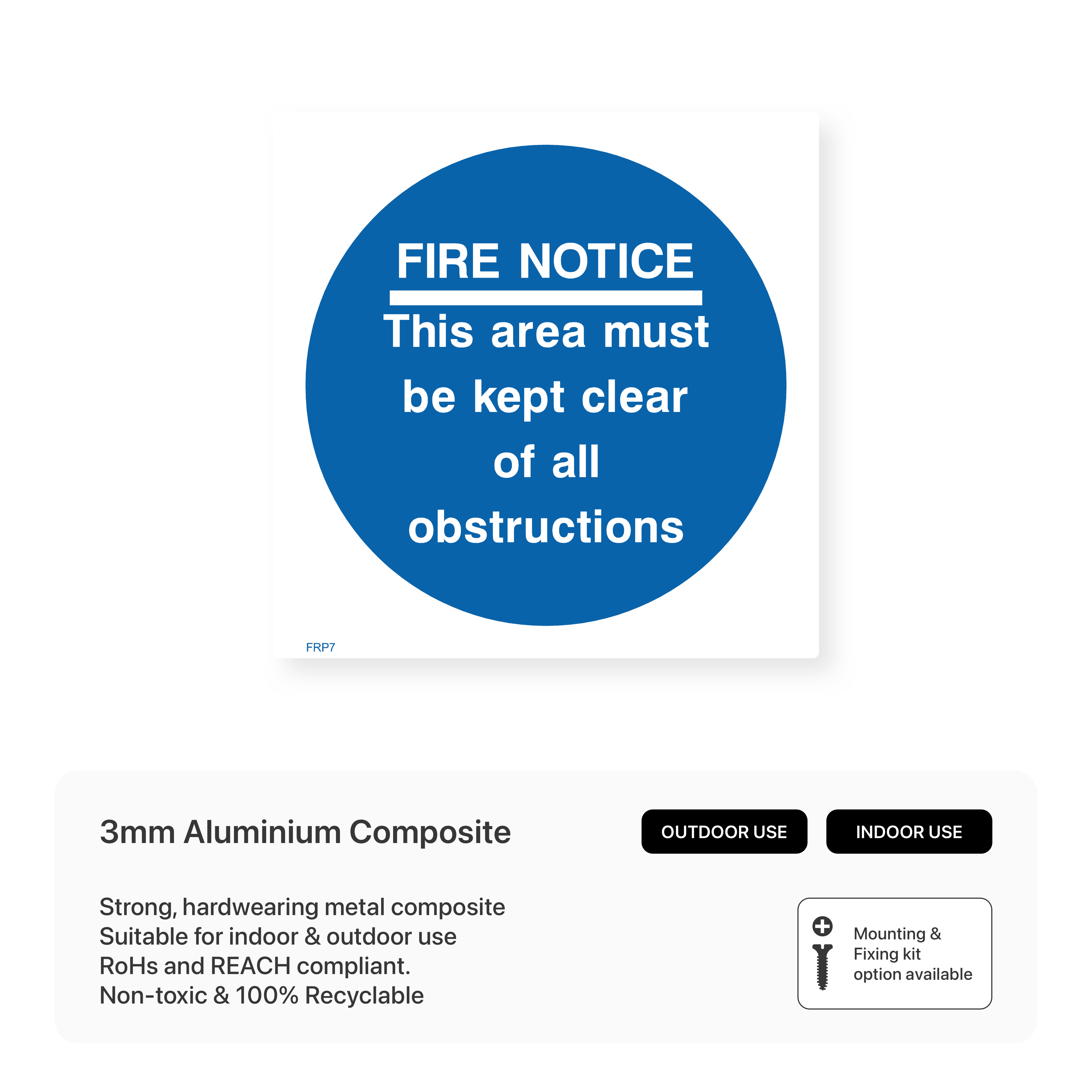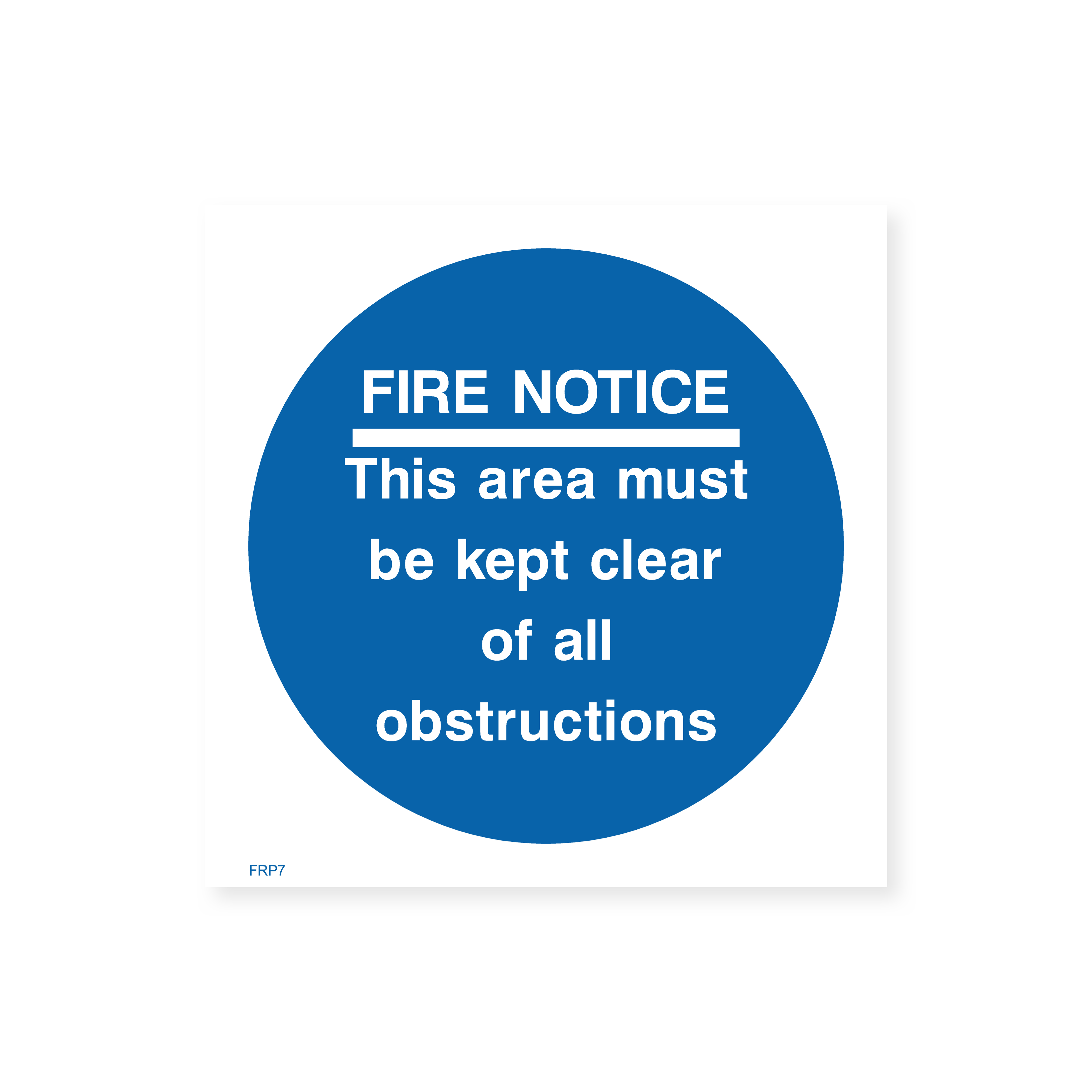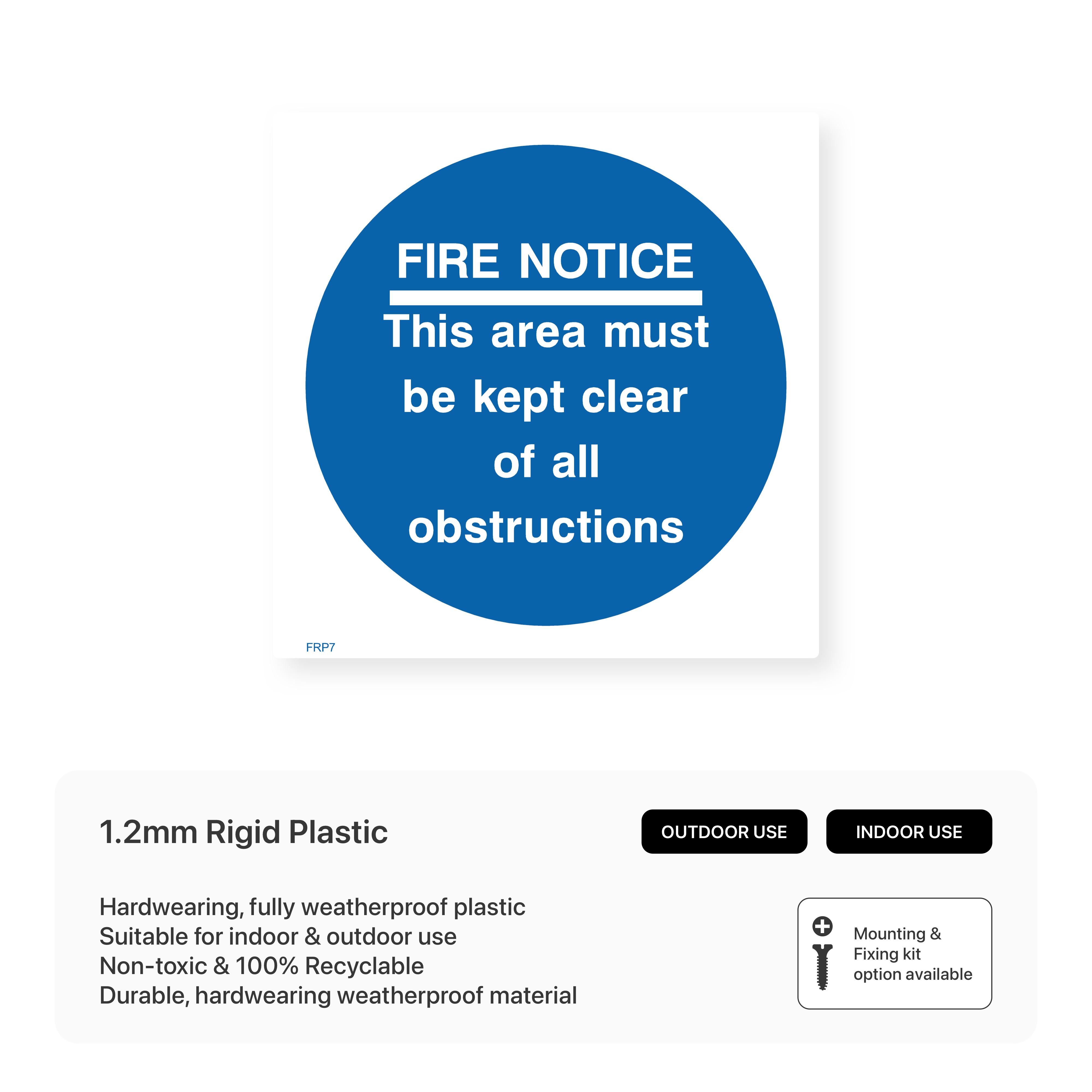 Maintain clear escape routes and access to fire safety equipment with our "Fire notice - This area must be kept clear of all obstructions" sign. This sign ensures that fire exits, fire extinguishers, and other equipment remain accessible in case of fire.