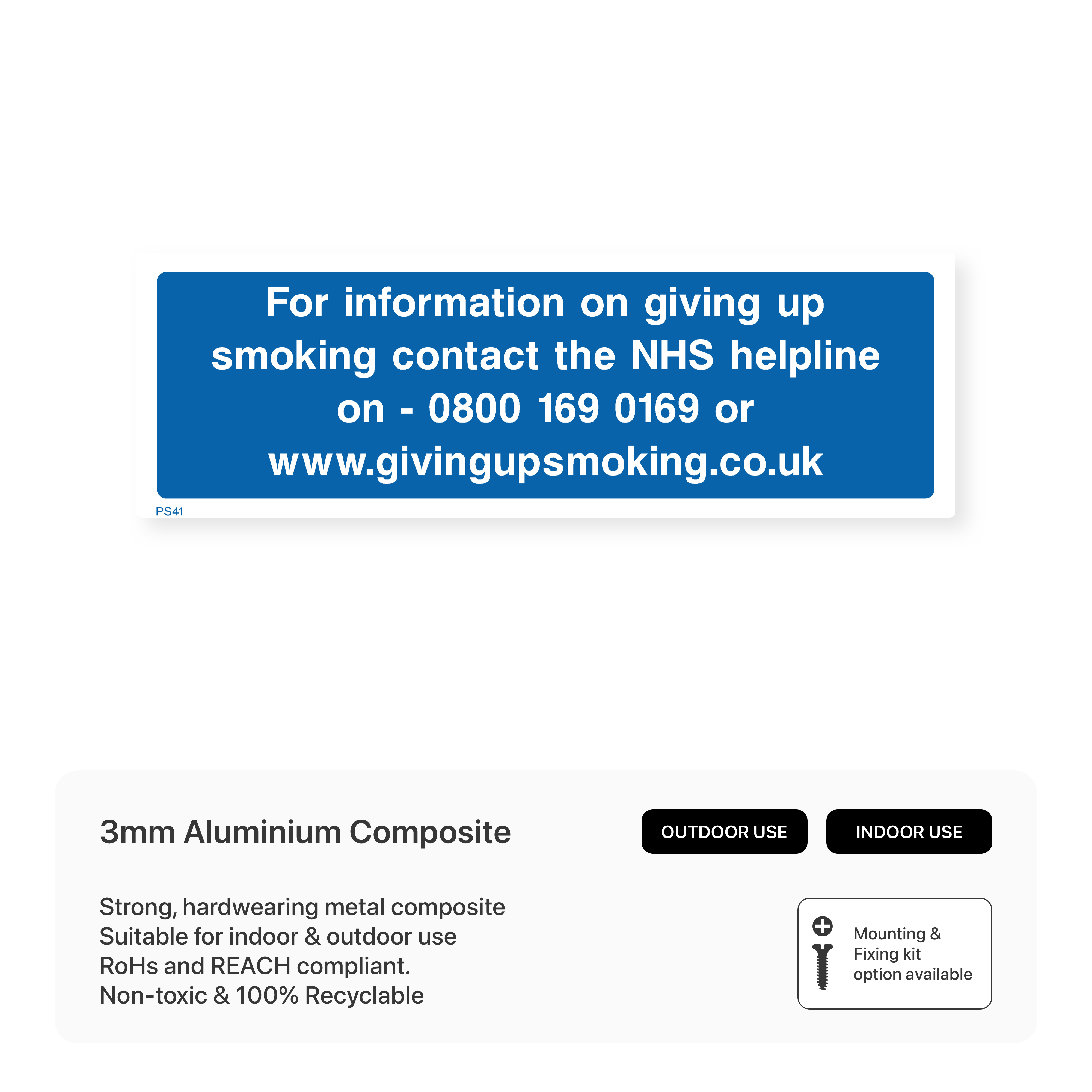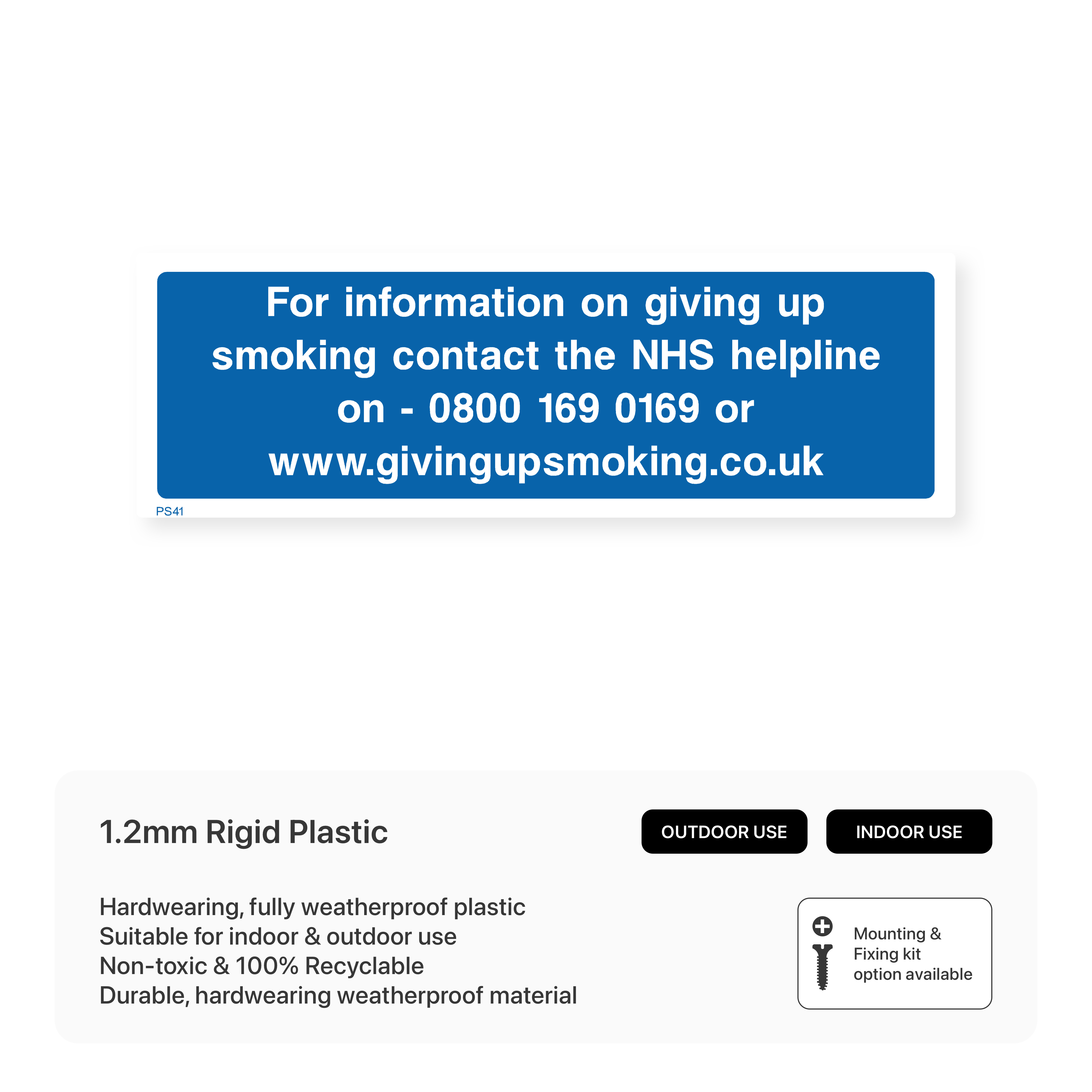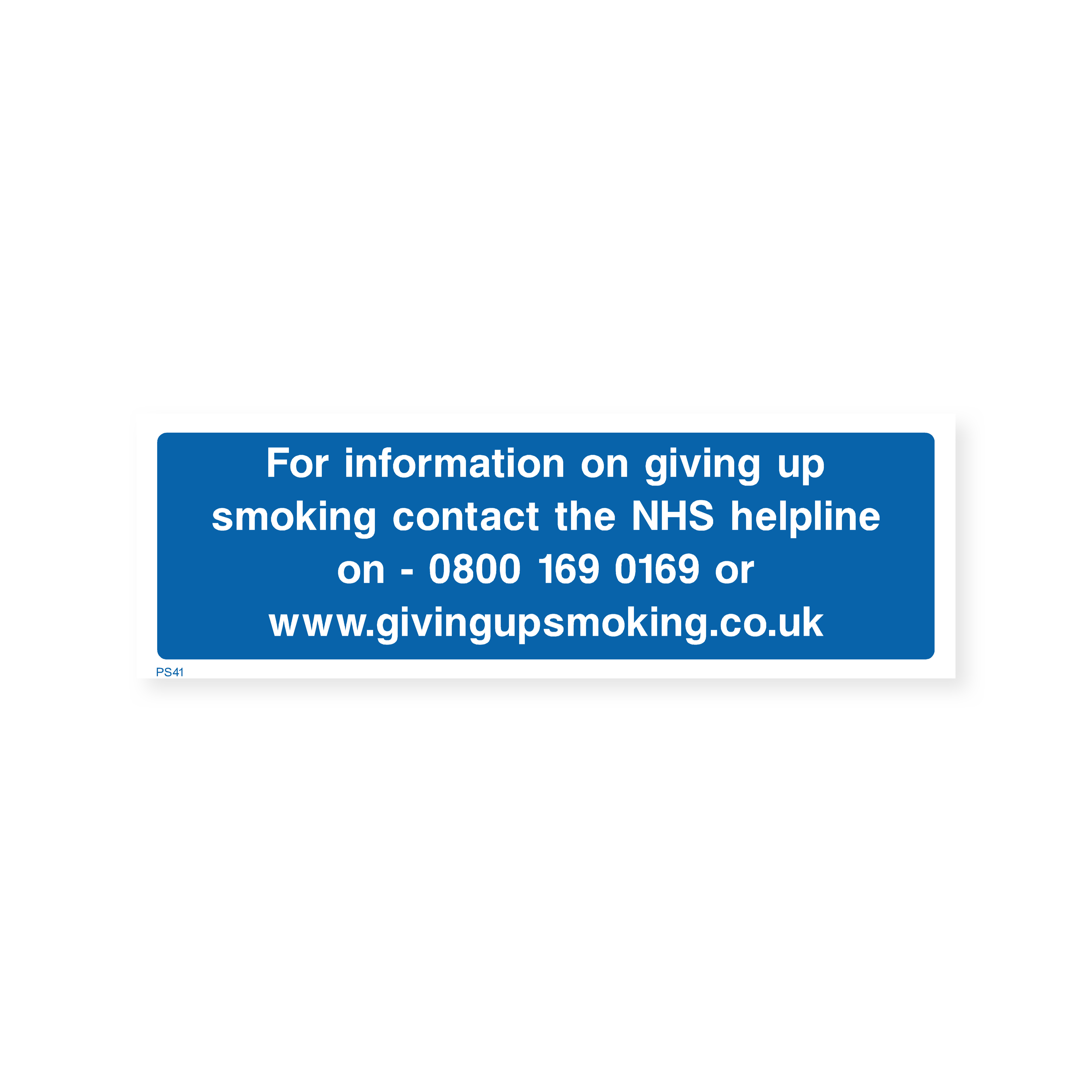 For information on giving up smoking contact the NHS helpline on - 0800 169 0169 or www.givingupsmoking.co.uk. Offer support to those who want to quit smoking with this informative safety sign. Provide essential contact information for the NHS helpline and website, empowering individuals to take the first step towards a healthier, smoke-free life.