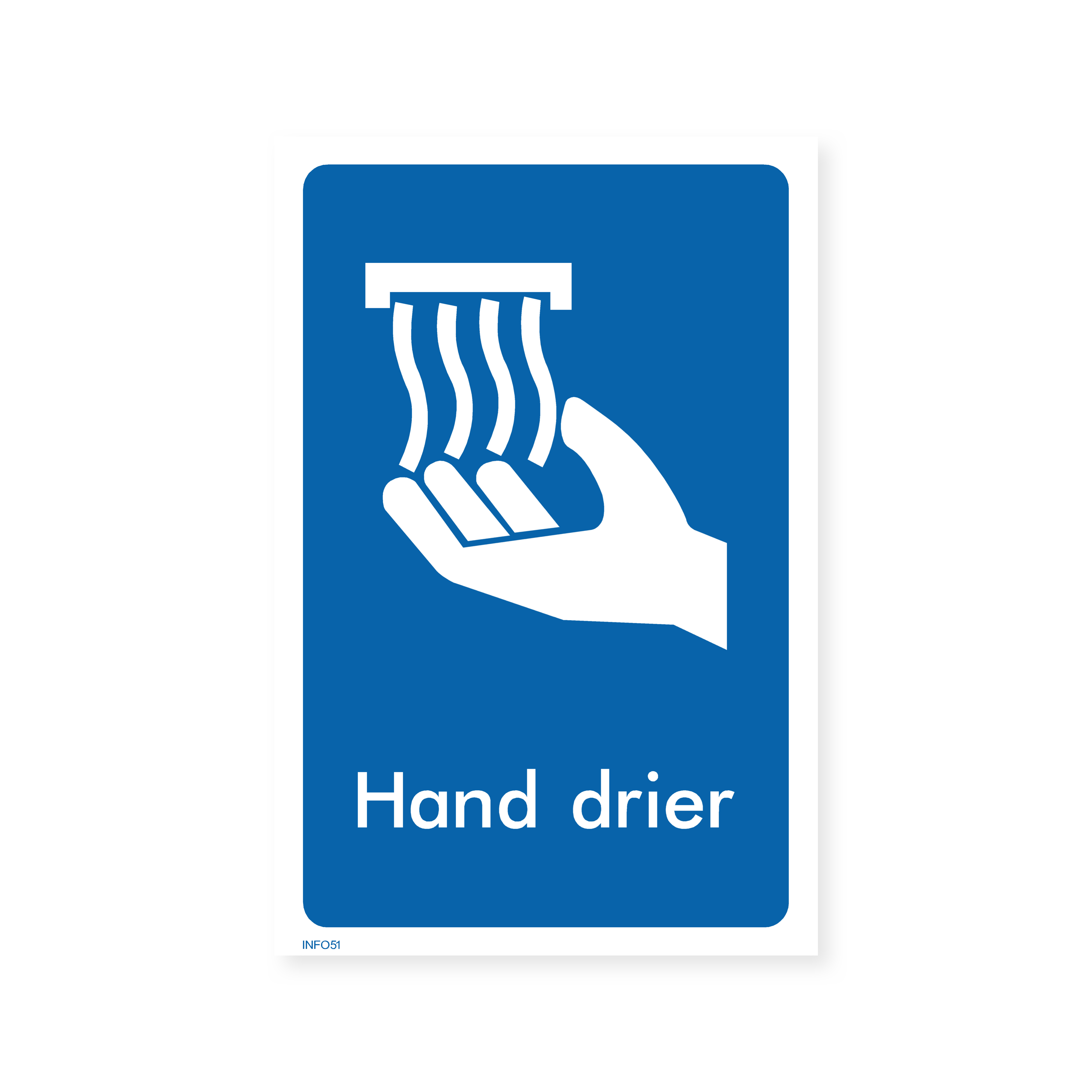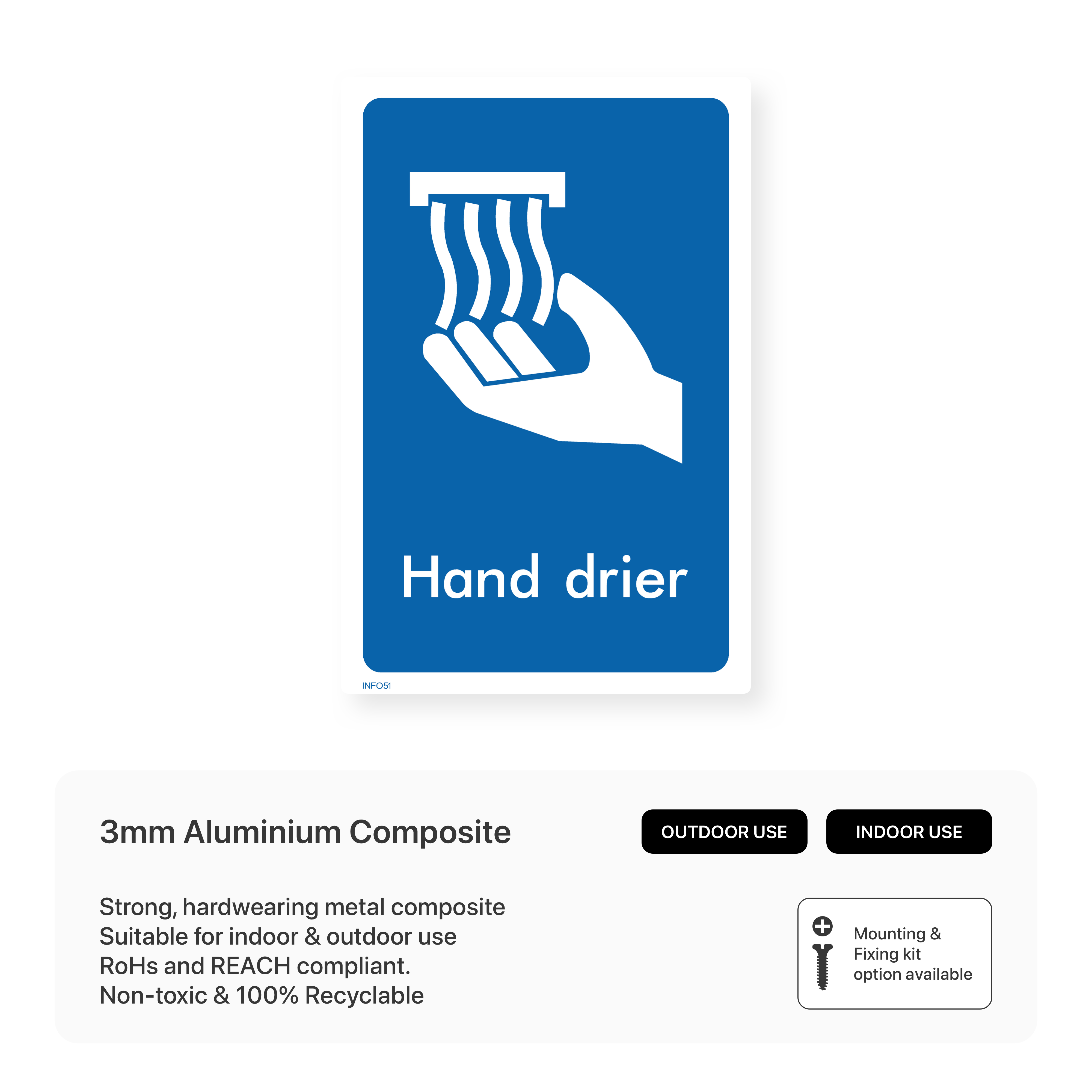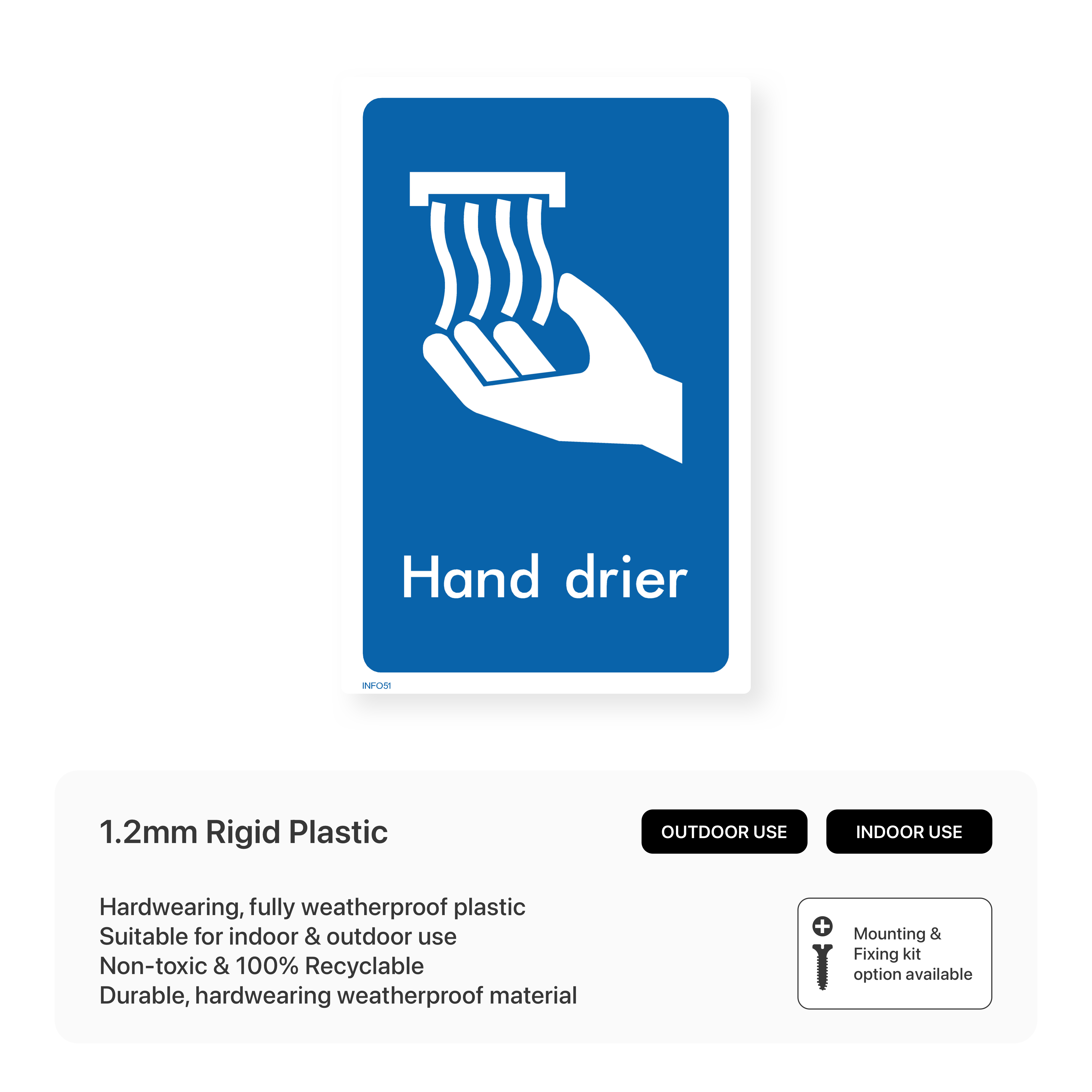 Clearly mark the location of hand dryers with our "Hand drier" sign. This sign helps users easily locate the hand dryer for quick and hygienic hand drying.