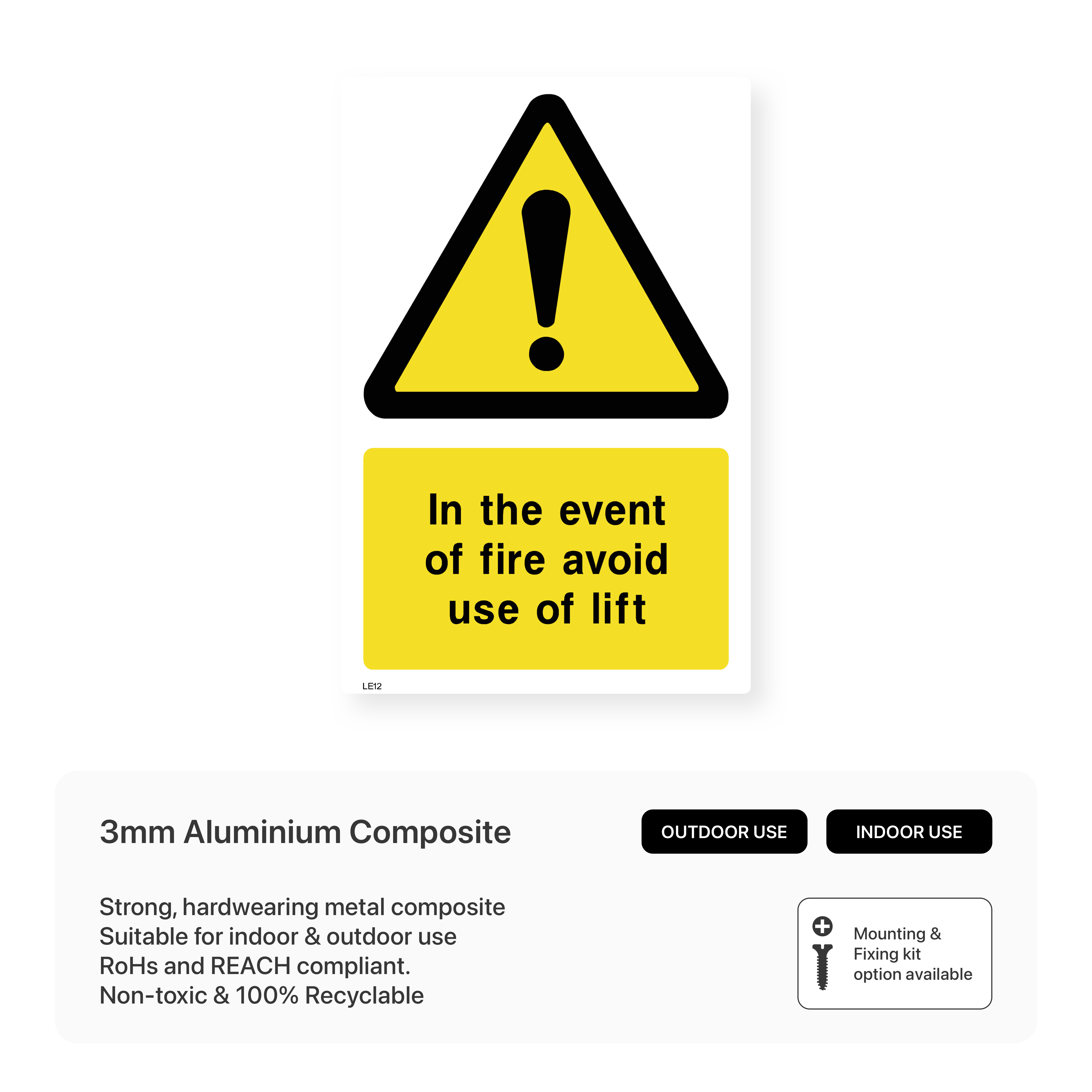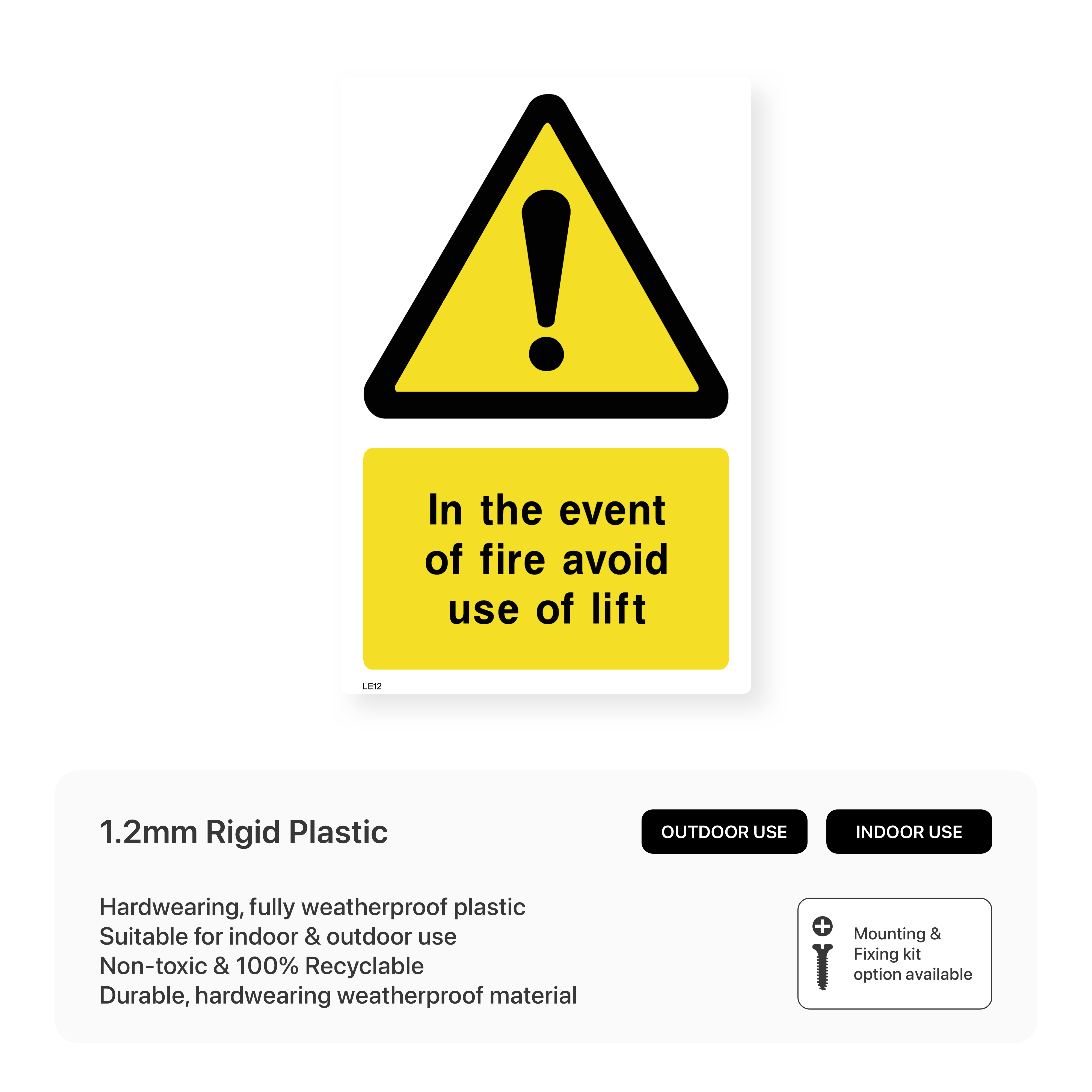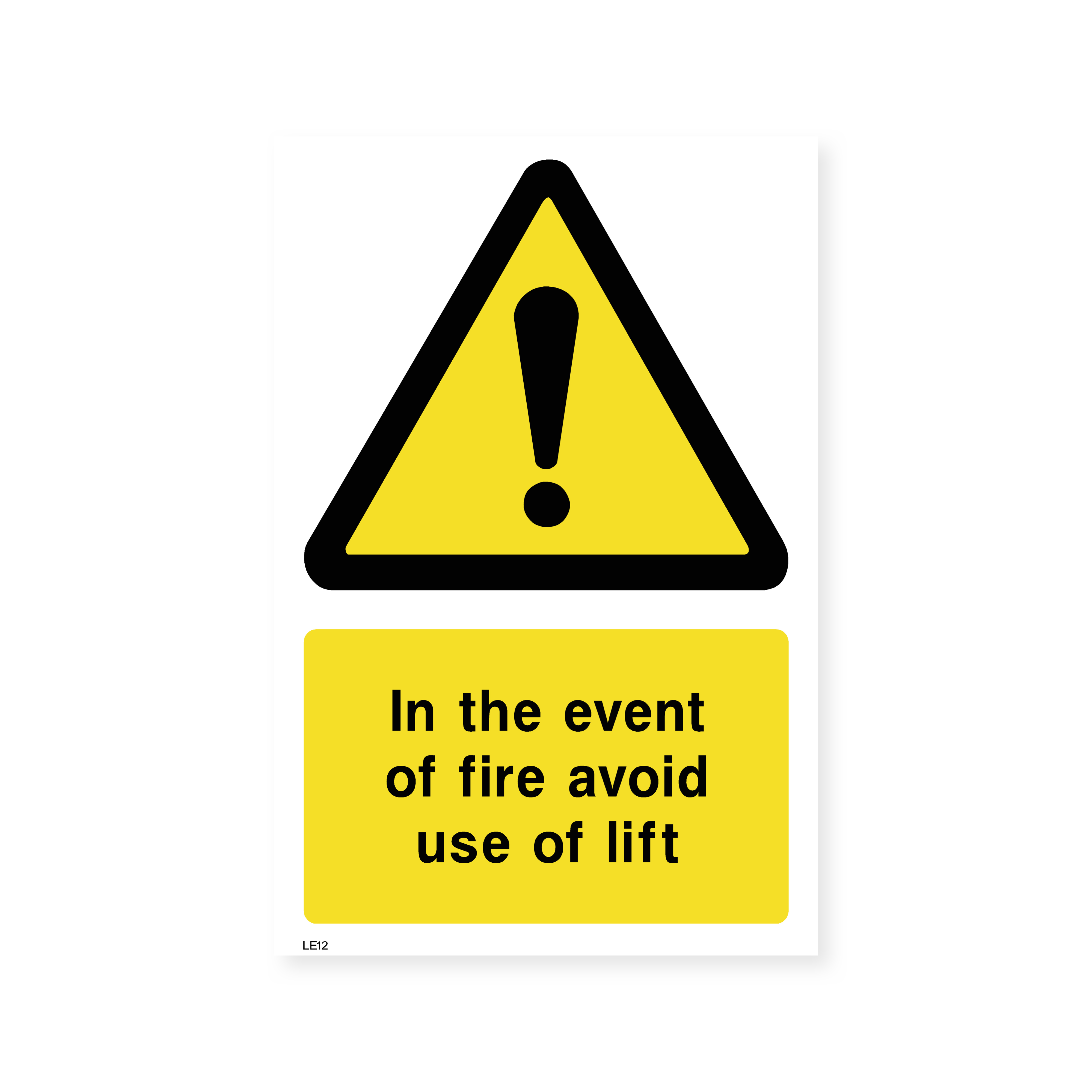 Clearly communicate fire safety instructions with this "In the event of fire avoid use of this lift" sign. Placed near individual lifts, this sign provides clear guidance to building occupants during emergencies, directing them away from lifts and towards safer evacuation routes.