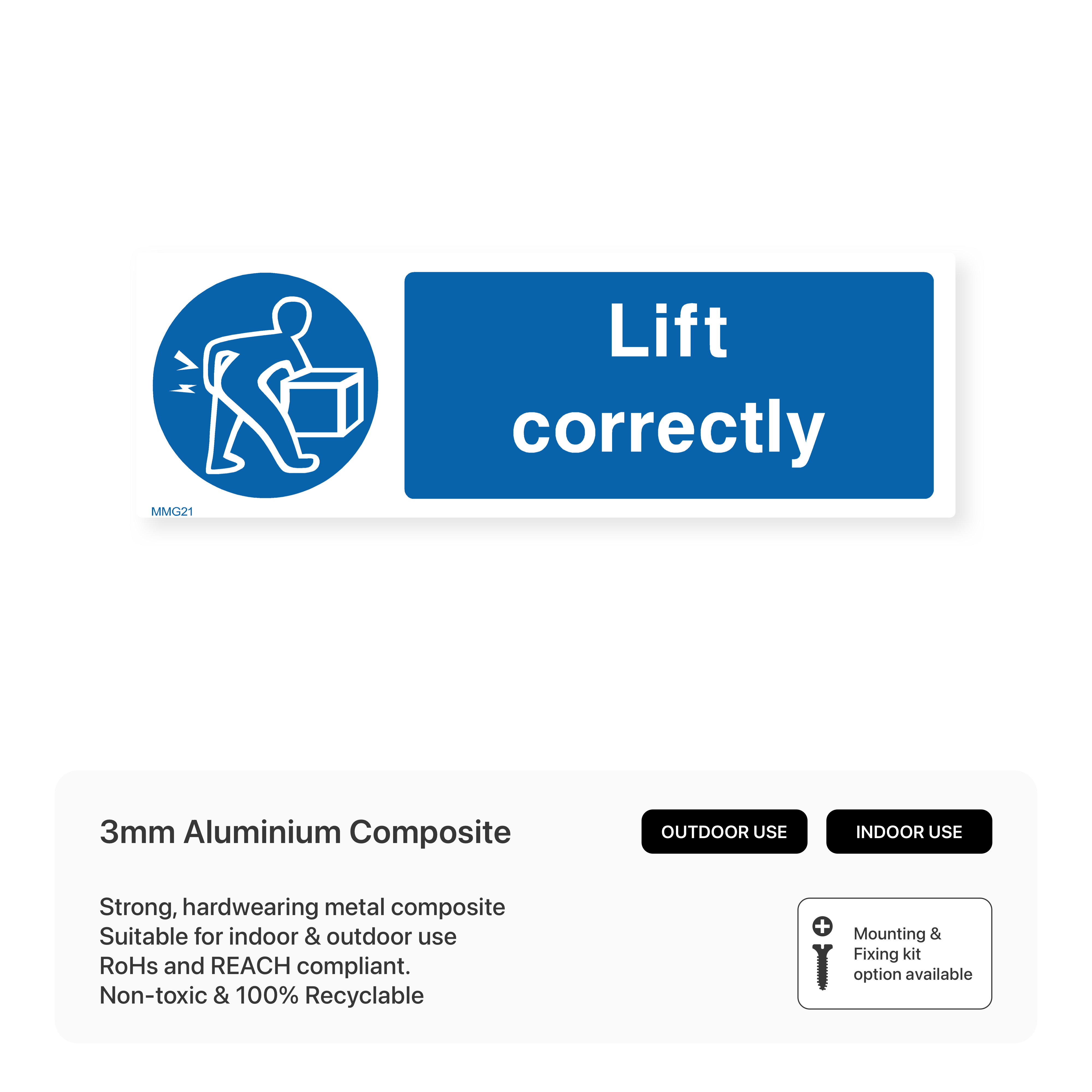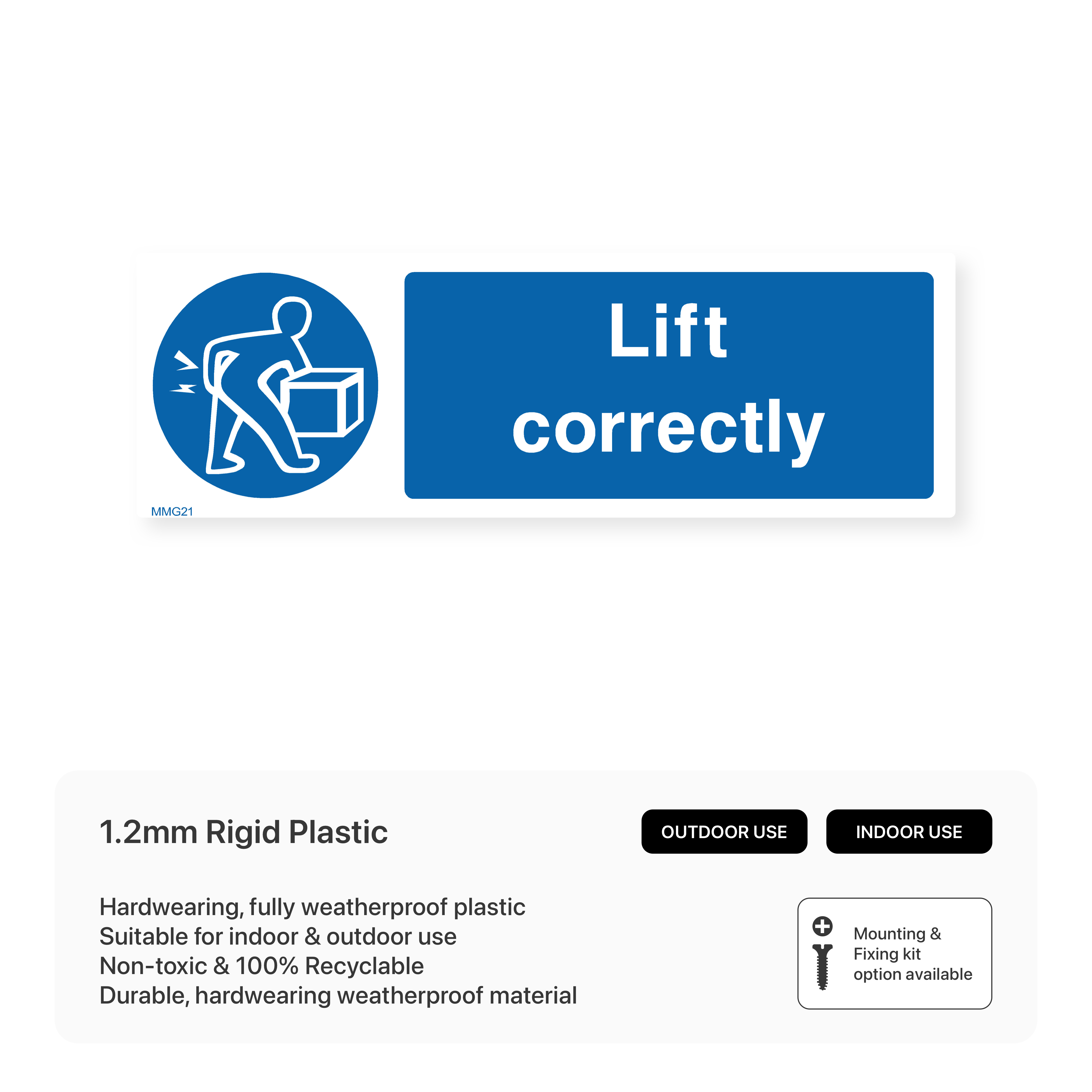 Prevent injuries and promote proper lifting techniques with our "Lift Correctly" signs. Display these signs in warehouses, construction sites, and any environment where manual lifting occurs. Available in various sizes and materials for clear visibility.