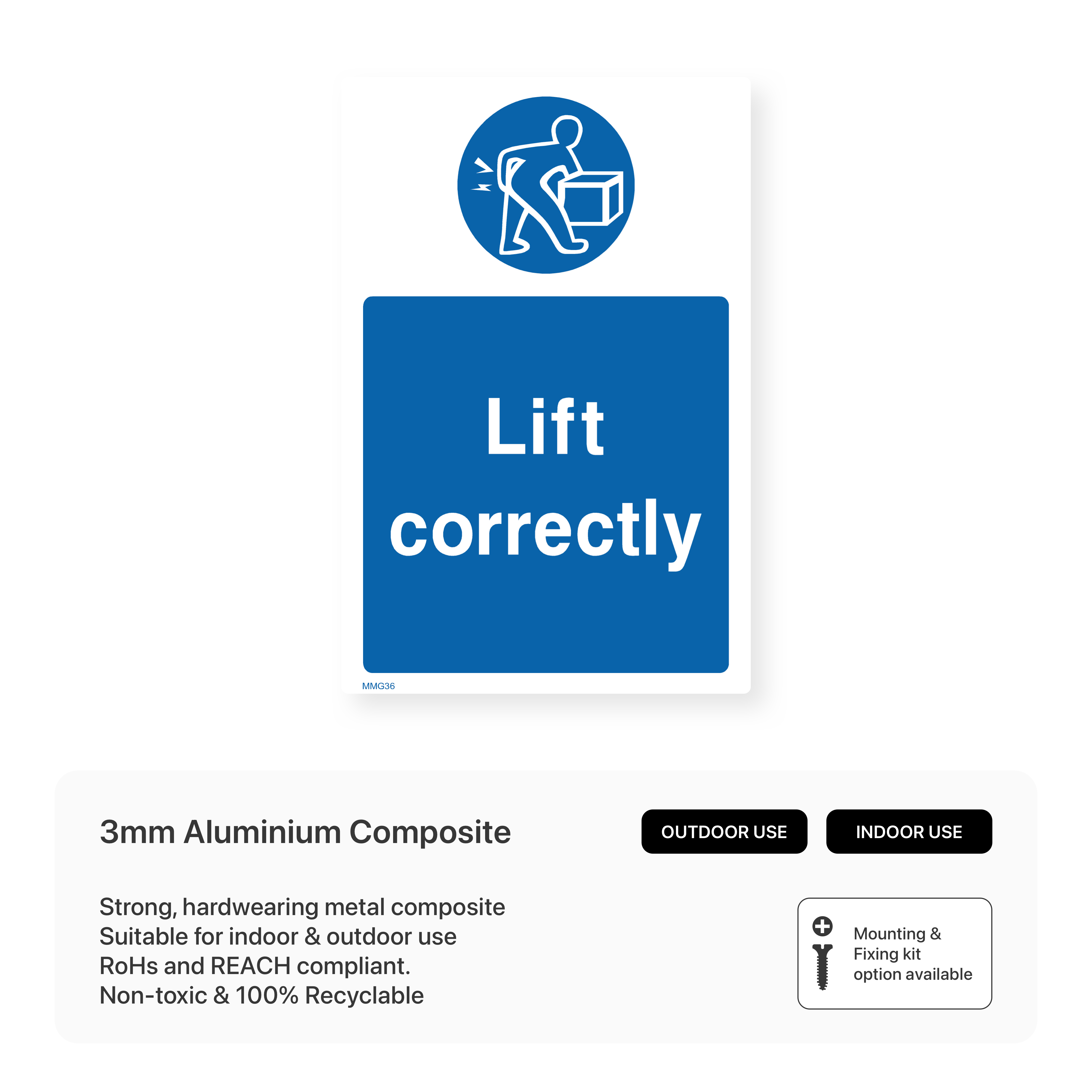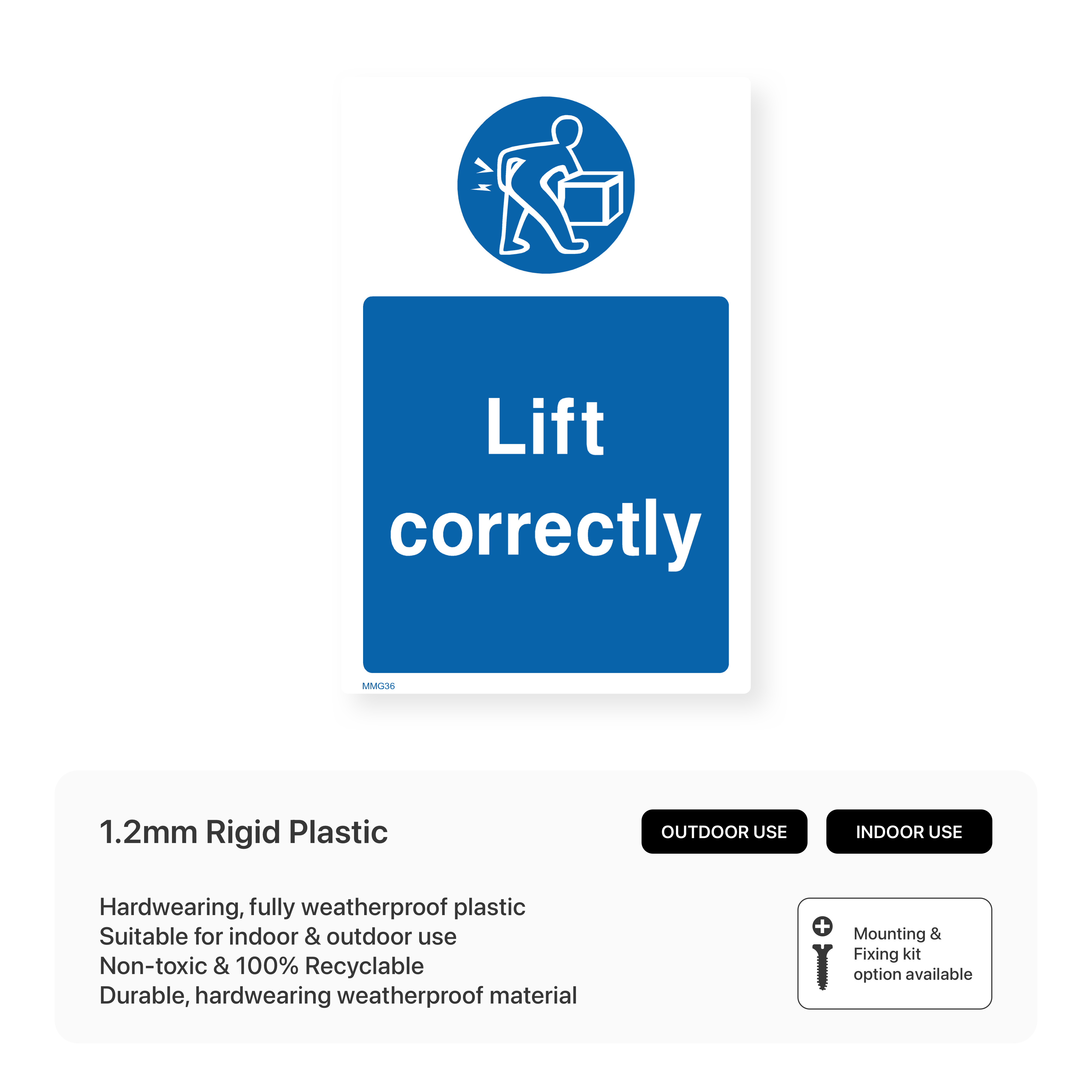 Prevent injuries and promote safe lifting practices with our "Lift Correctly" signs. Clearly illustrate proper lifting techniques to avoid back strain and other injuries.