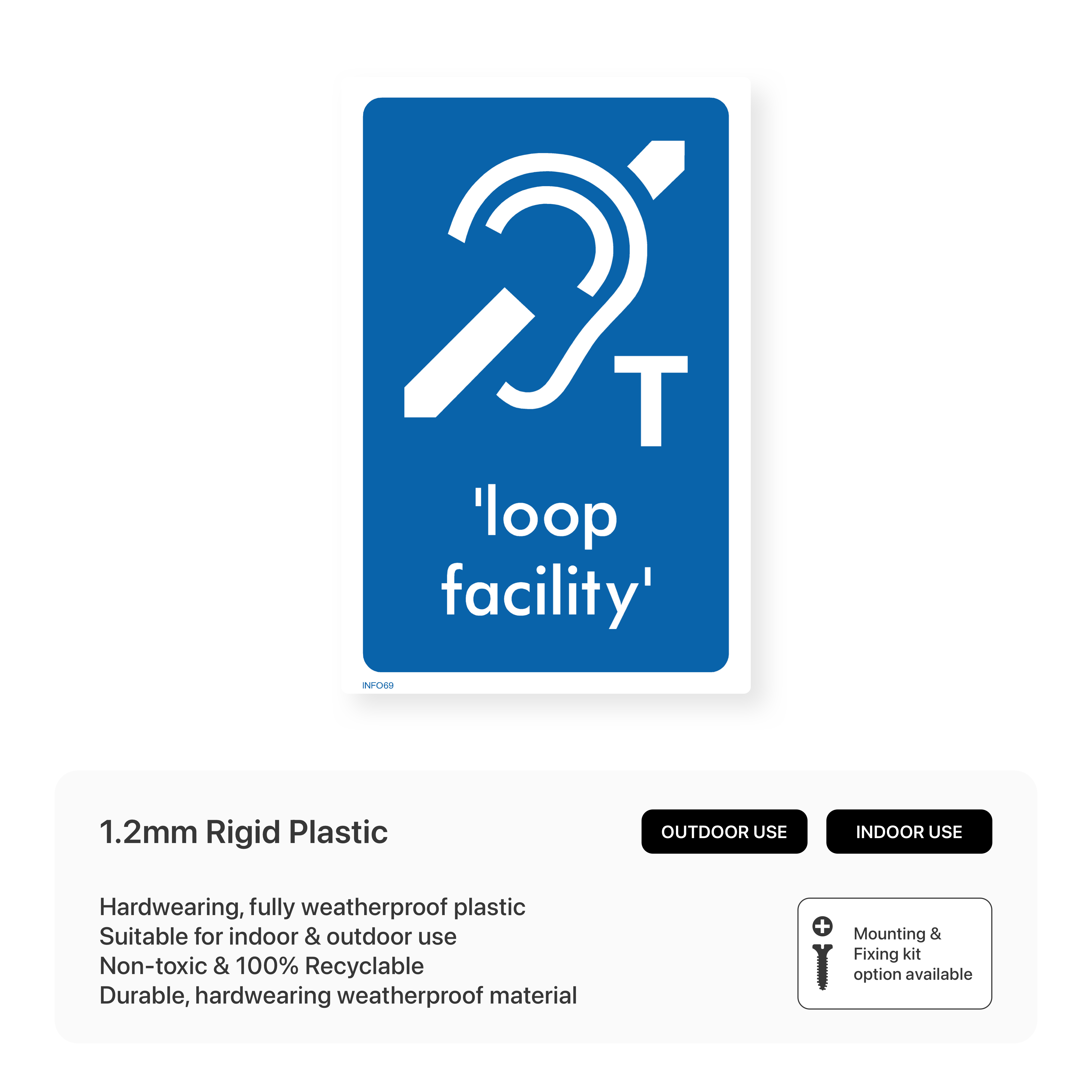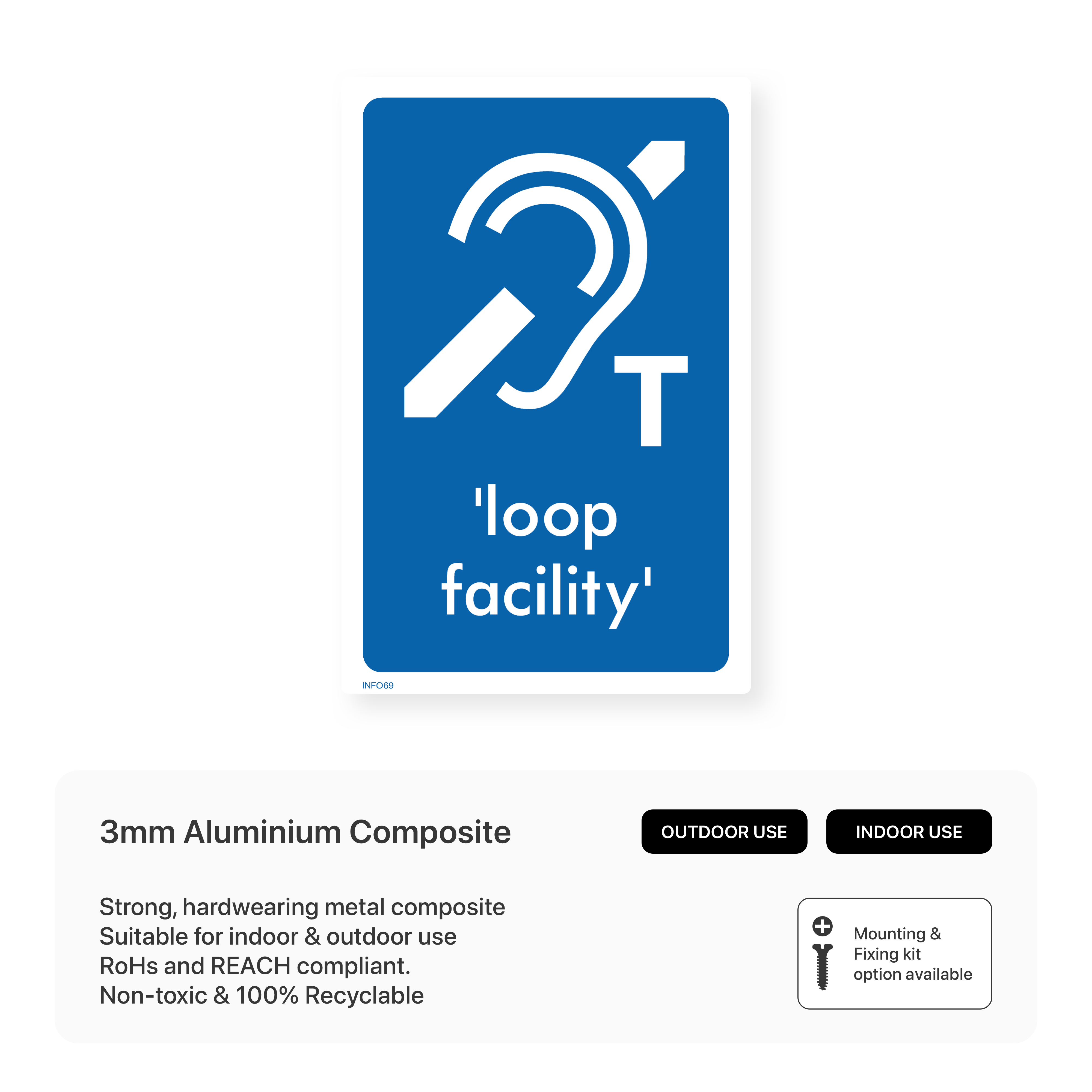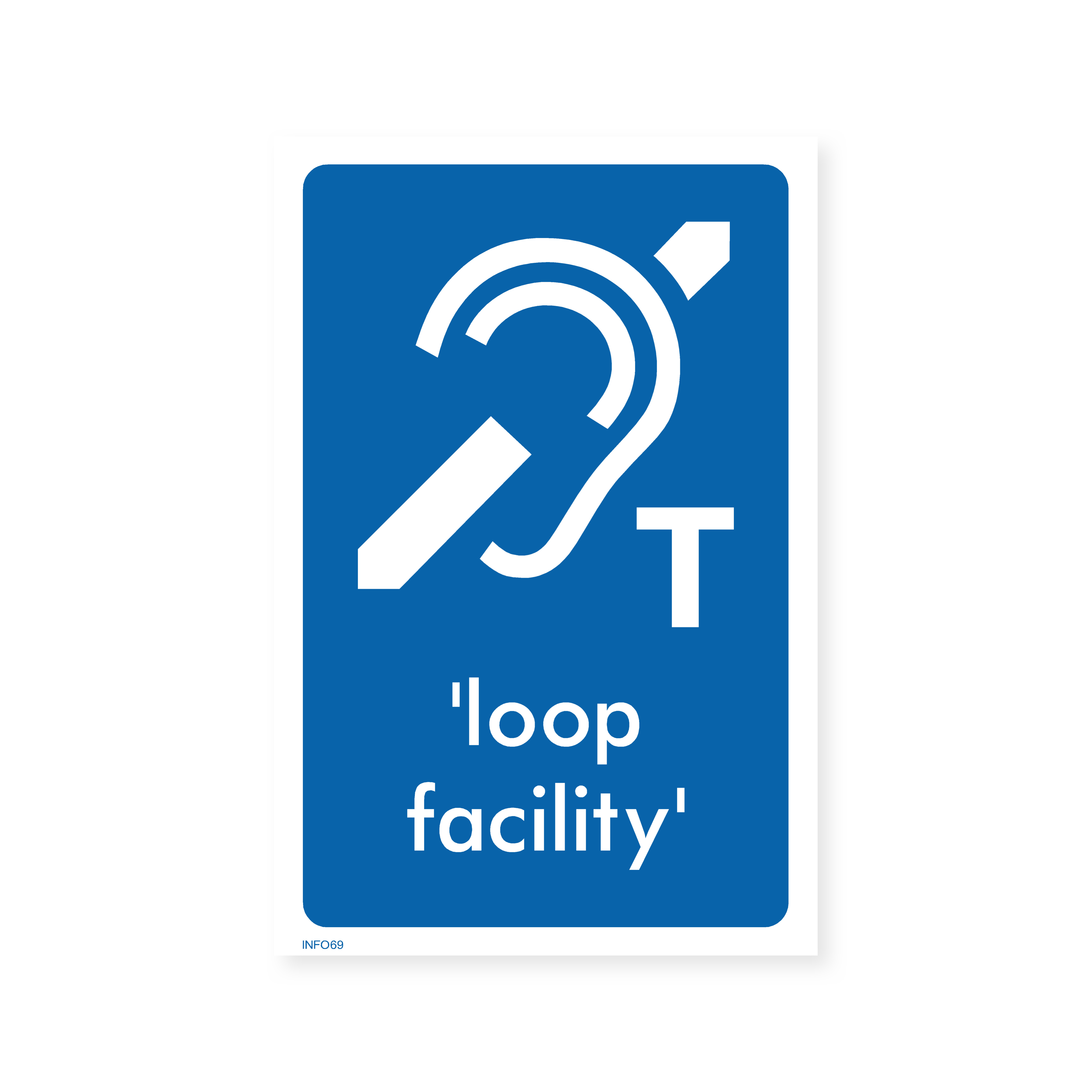 Enhance accessibility for individuals with hearing impairments with our "Loop facility" sign. This sign indicates that the area is equipped with a hearing loop system, allowing users with hearing aids to connect directly to the audio system for improved sound quality.
