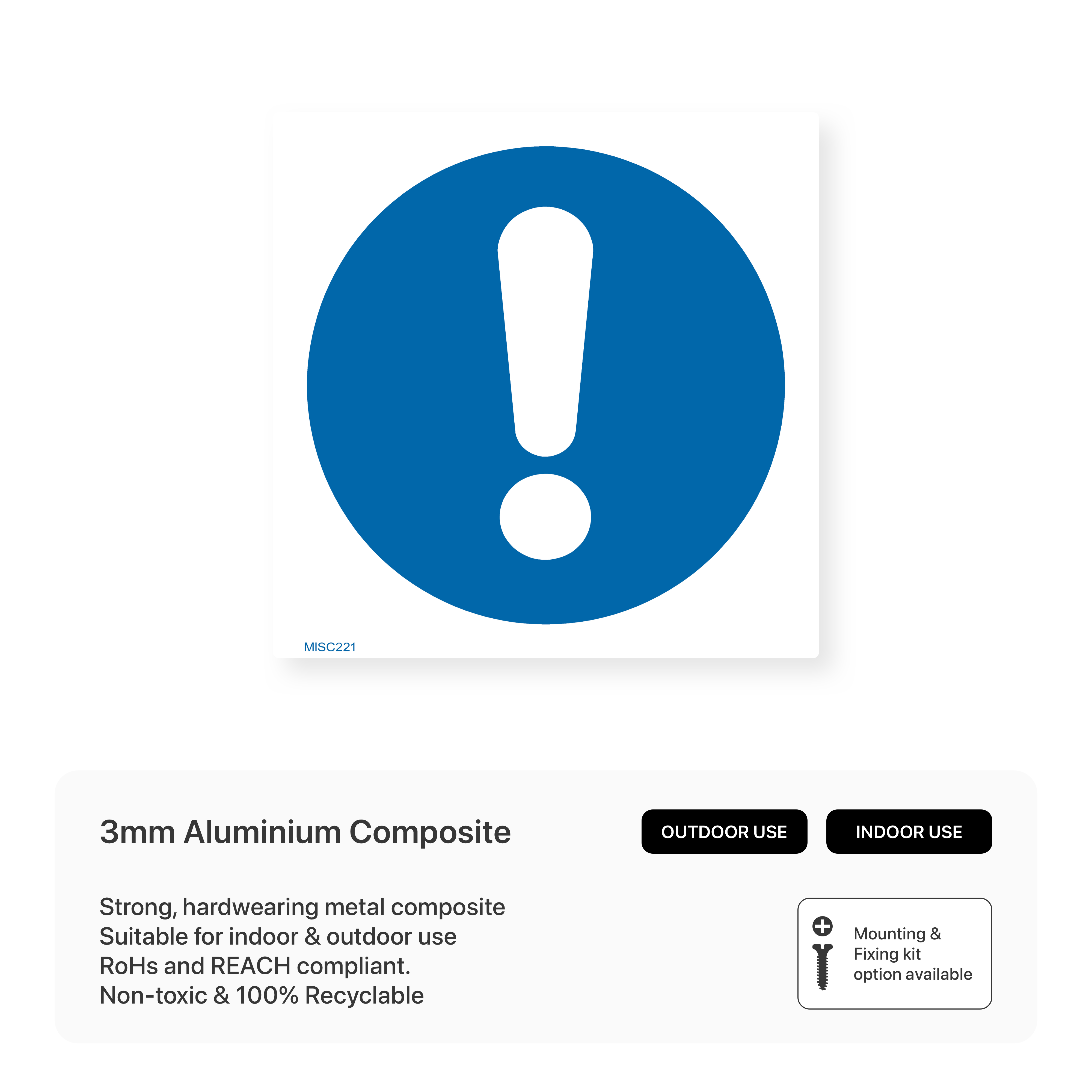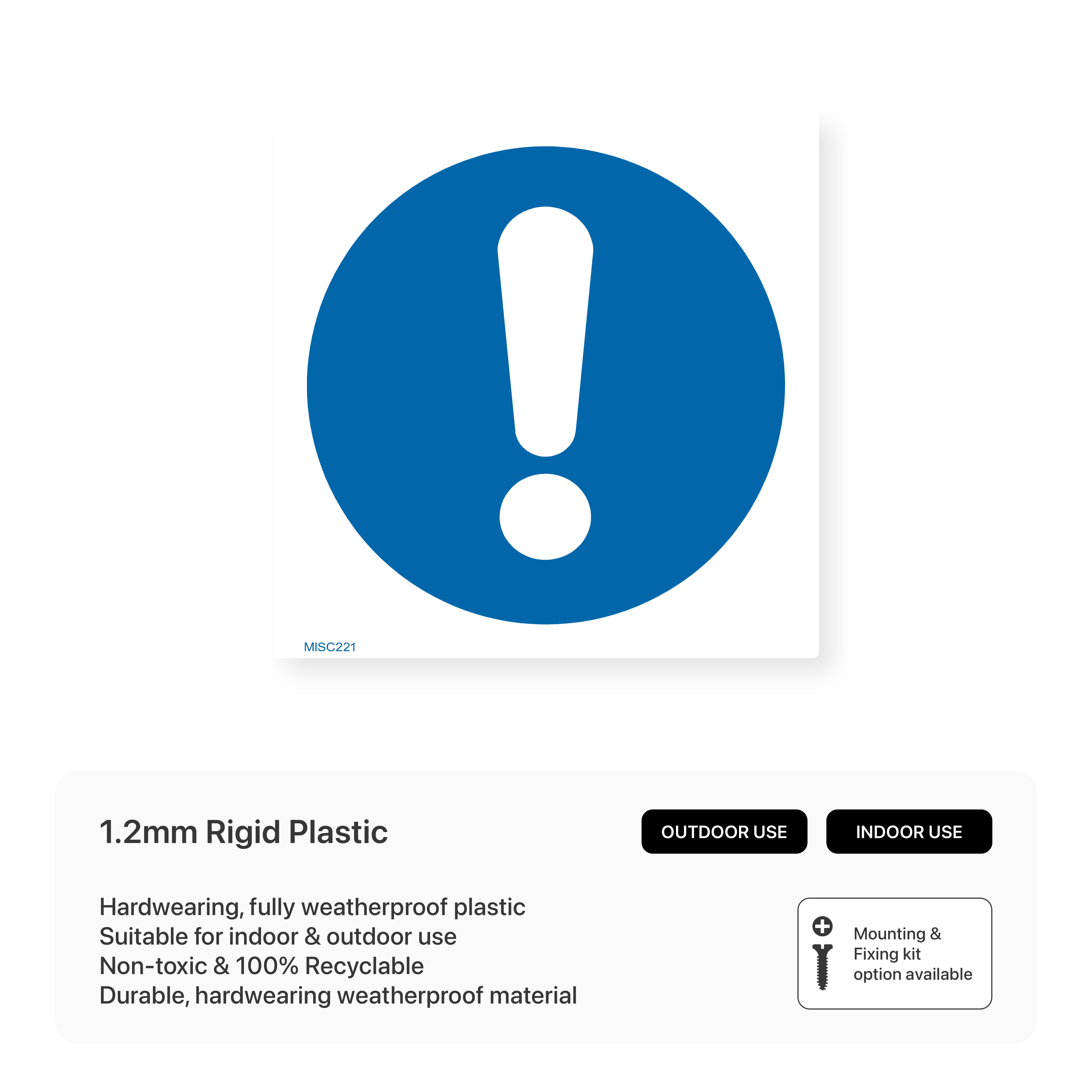 Clearly communicate mandatory actions or requirements with our "Mandatory Symbol" signs. These signs feature the universally recognized blue circle symbol with a white pictogram.