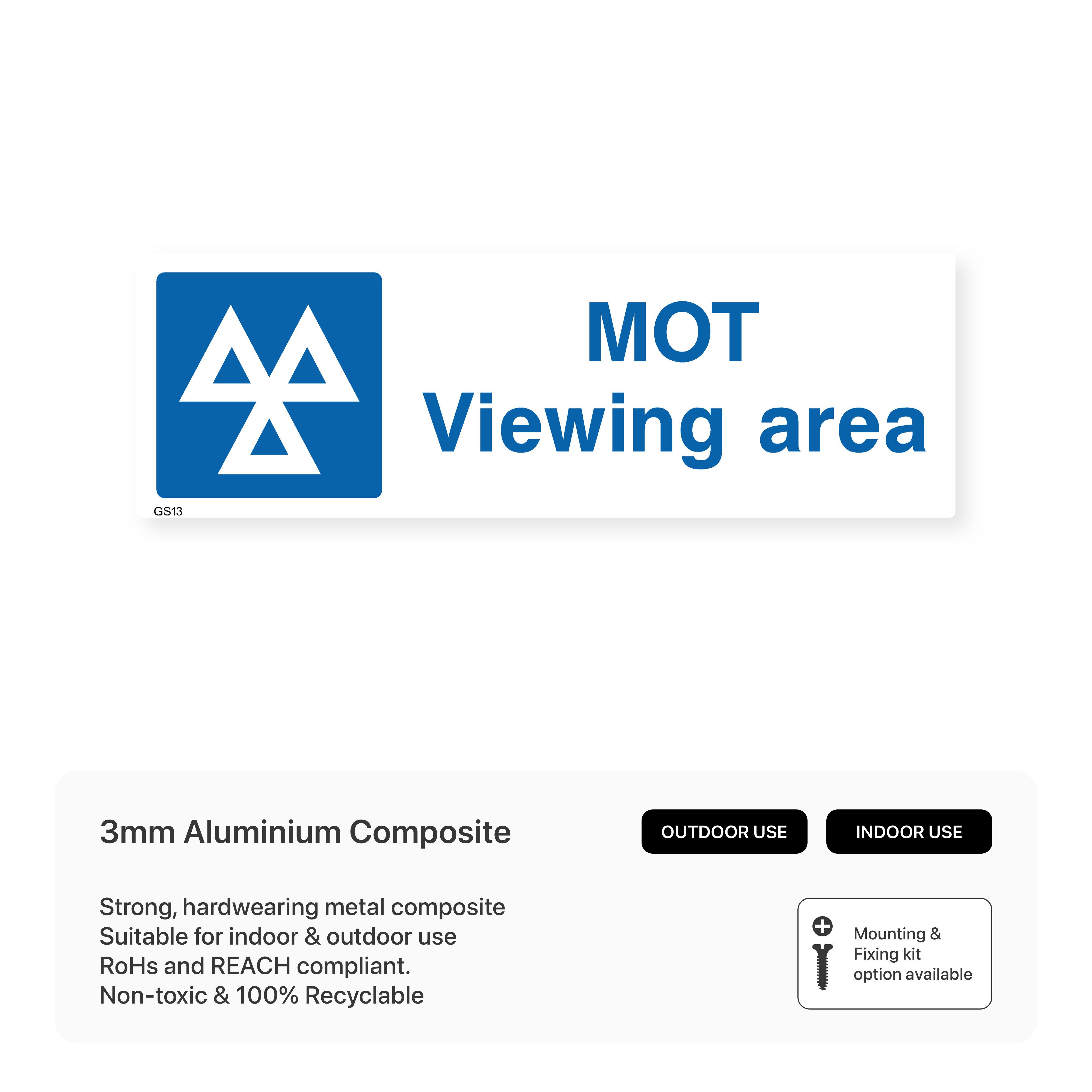 Clearly designate the MOT viewing area with our "MOT Viewing area" sign. This sign helps customers easily find the designated area where they can observe their vehicles during MOT testing.