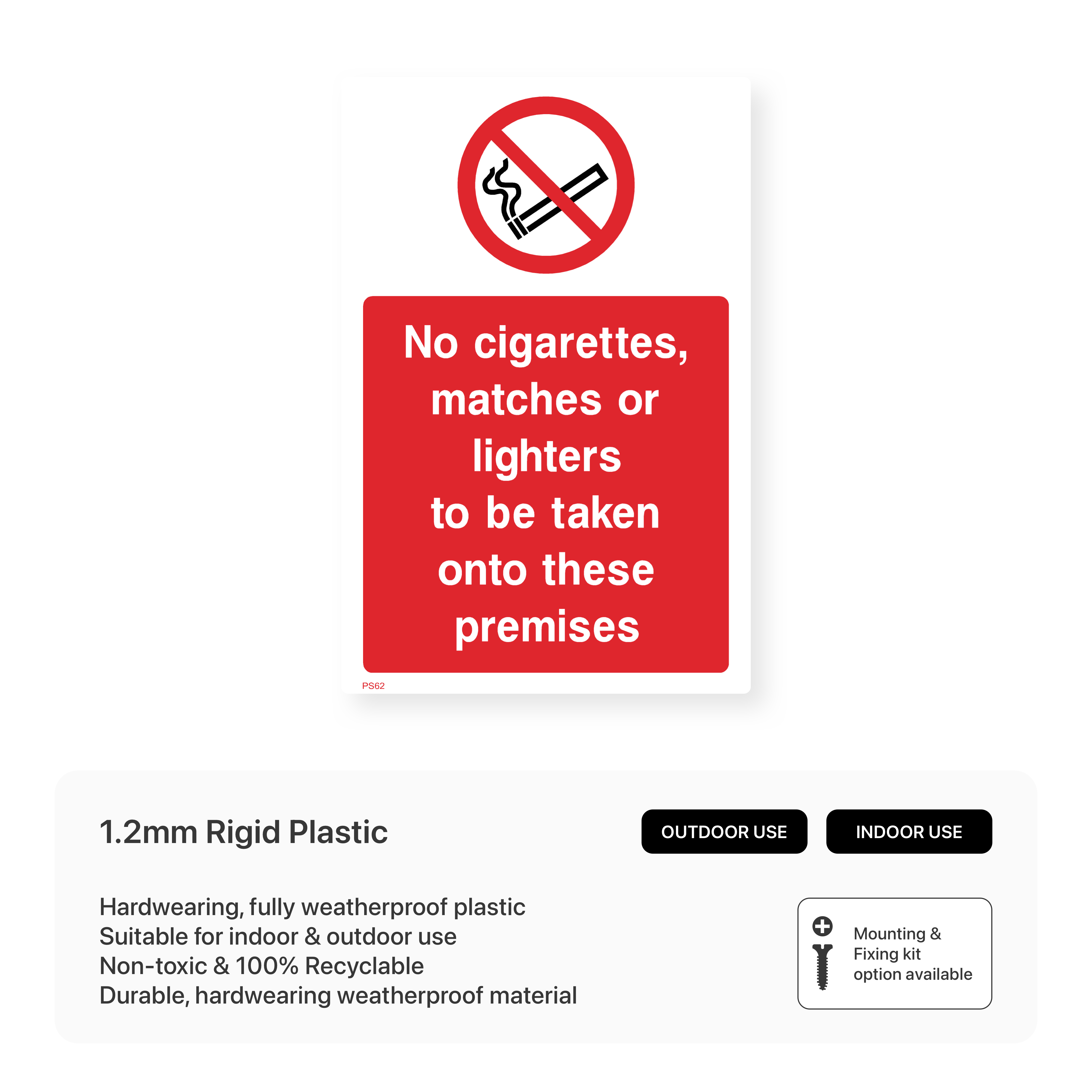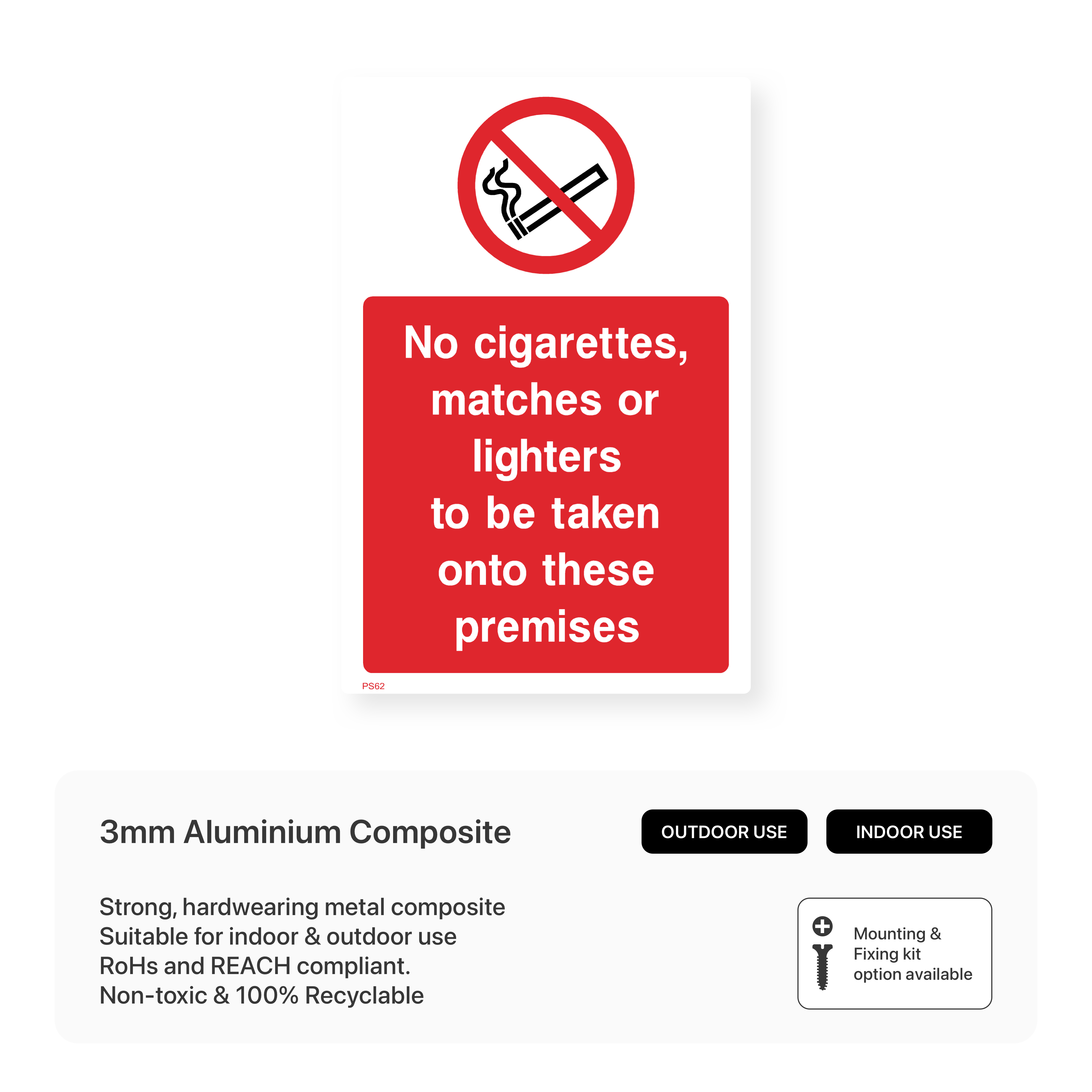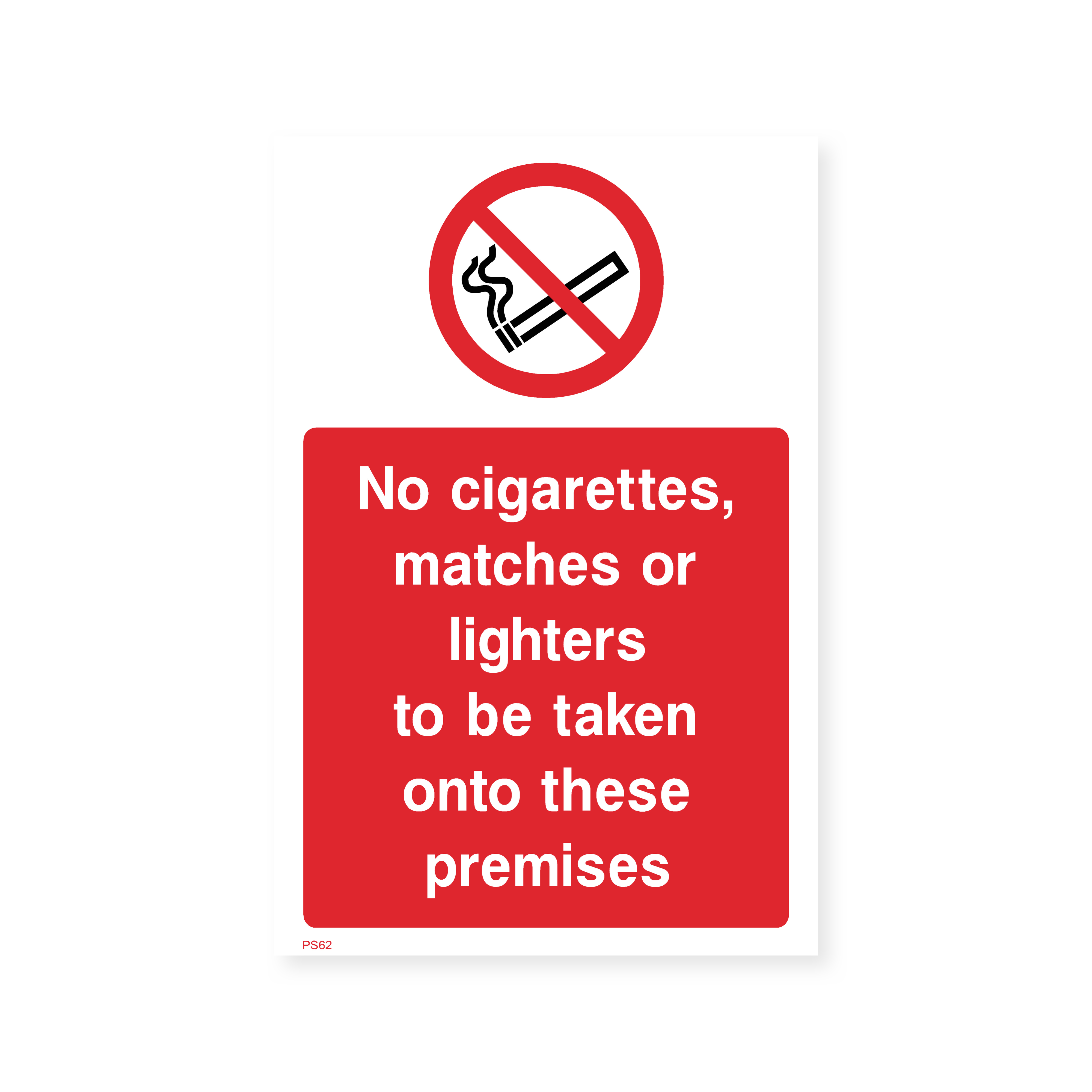 Ensure safety and prevent fire hazards with this "No Cigarettes, Matches or Lighters to be Taken onto These Premises" sign. This sign clearly communicates the prohibition of smoking materials in areas where they could pose a risk. Protect your property and ensure the safety of everyone with this informative sign.