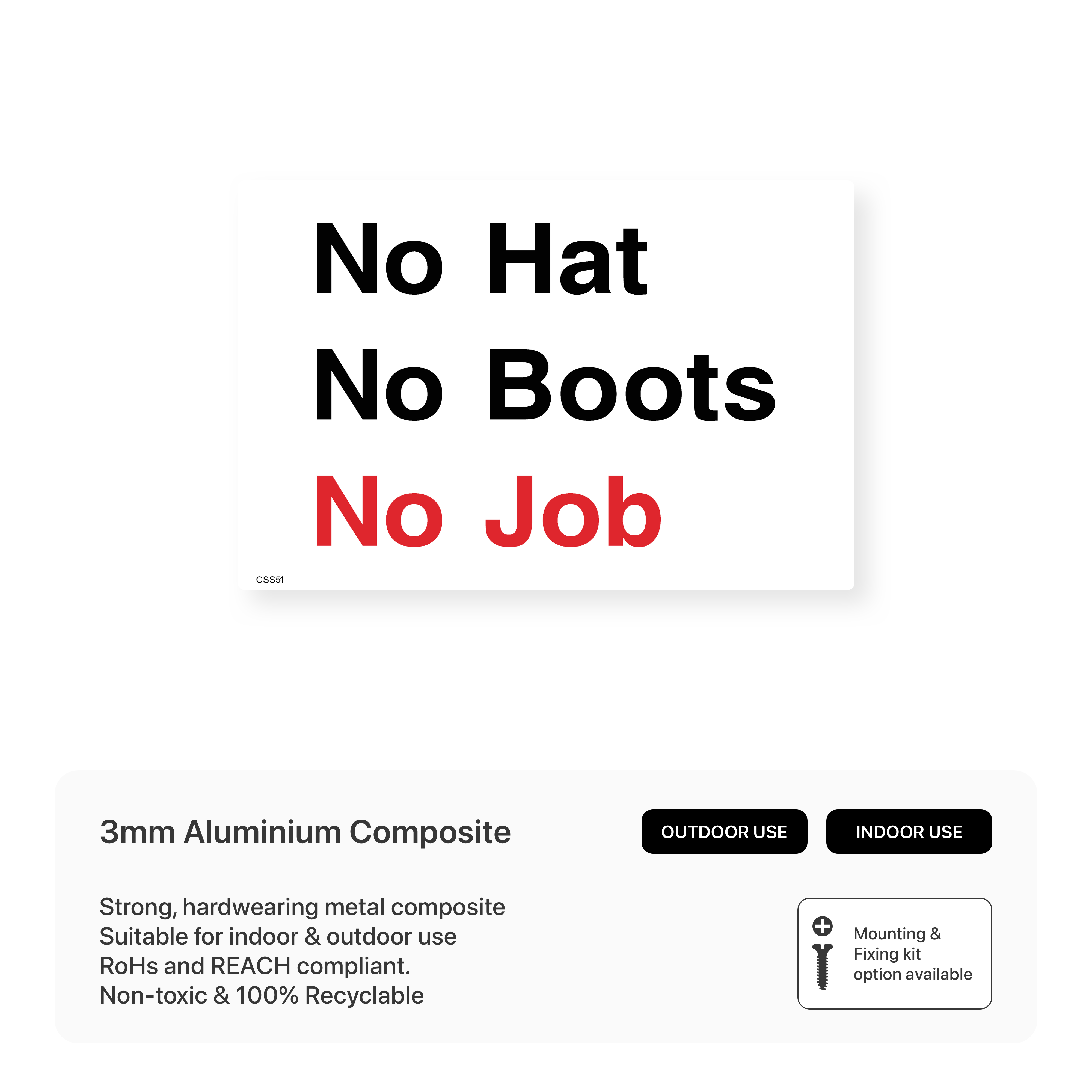 Enforce strict safety compliance with our "No Hat, No Boots, No Job" sign. Clearly communicate the mandatory use of personal protective equipment (PPE) on your construction site to prevent accidents and injuries.