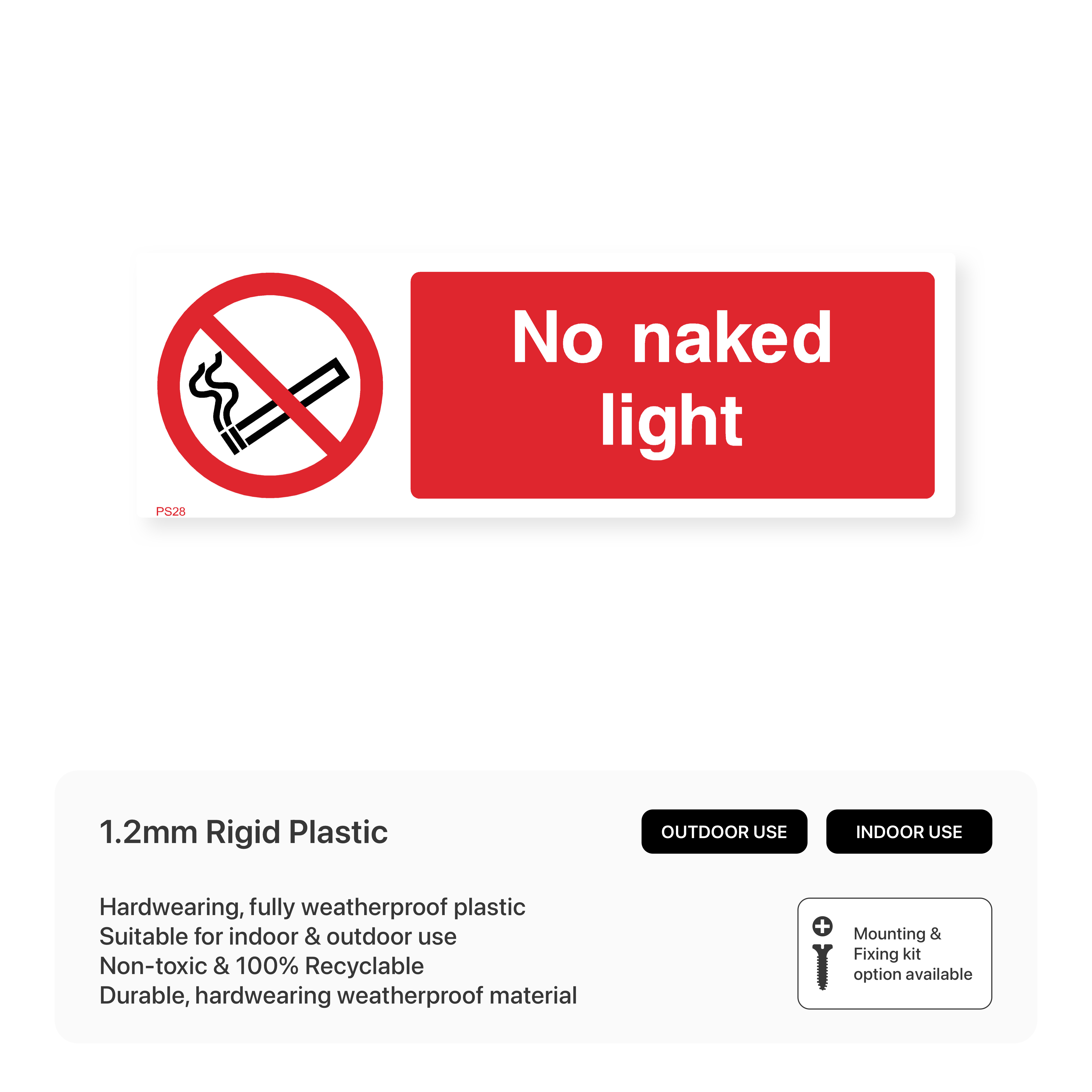 Prevent fire hazards and ensure safety with this rectangular "No Naked Light" sign. This sign clearly prohibits the use of open flames or exposed heat sources in areas where they could pose a risk. Protect your property and ensure the safety of everyone with this essential safety sign.