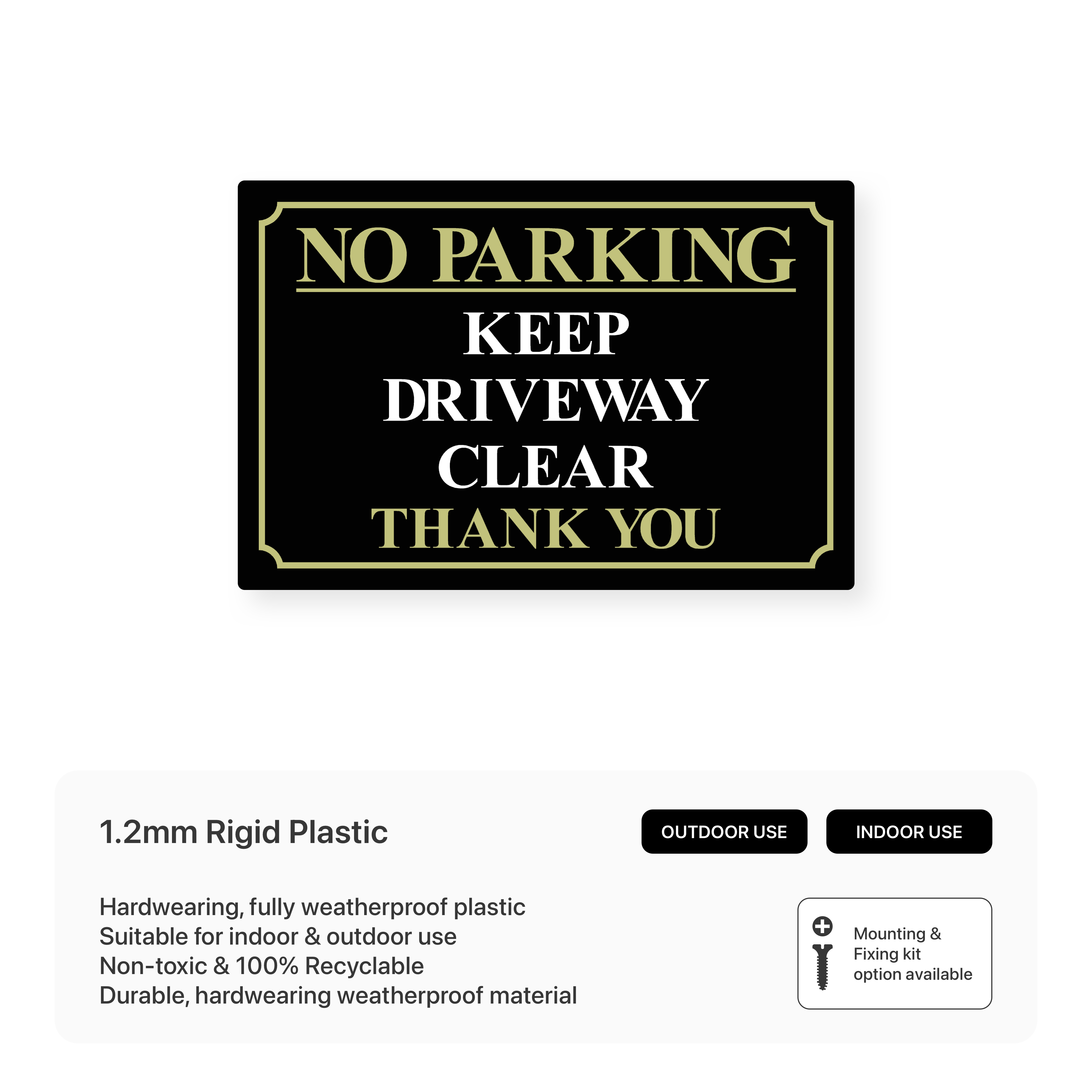 Ensure unobstructed access to your driveway with our "No Parking- Keep driveway clear - Thank you" sign. This polite sign encourages drivers to park elsewhere, keeping your driveway clear for your vehicles and emergency services while maintaining a positive tone.