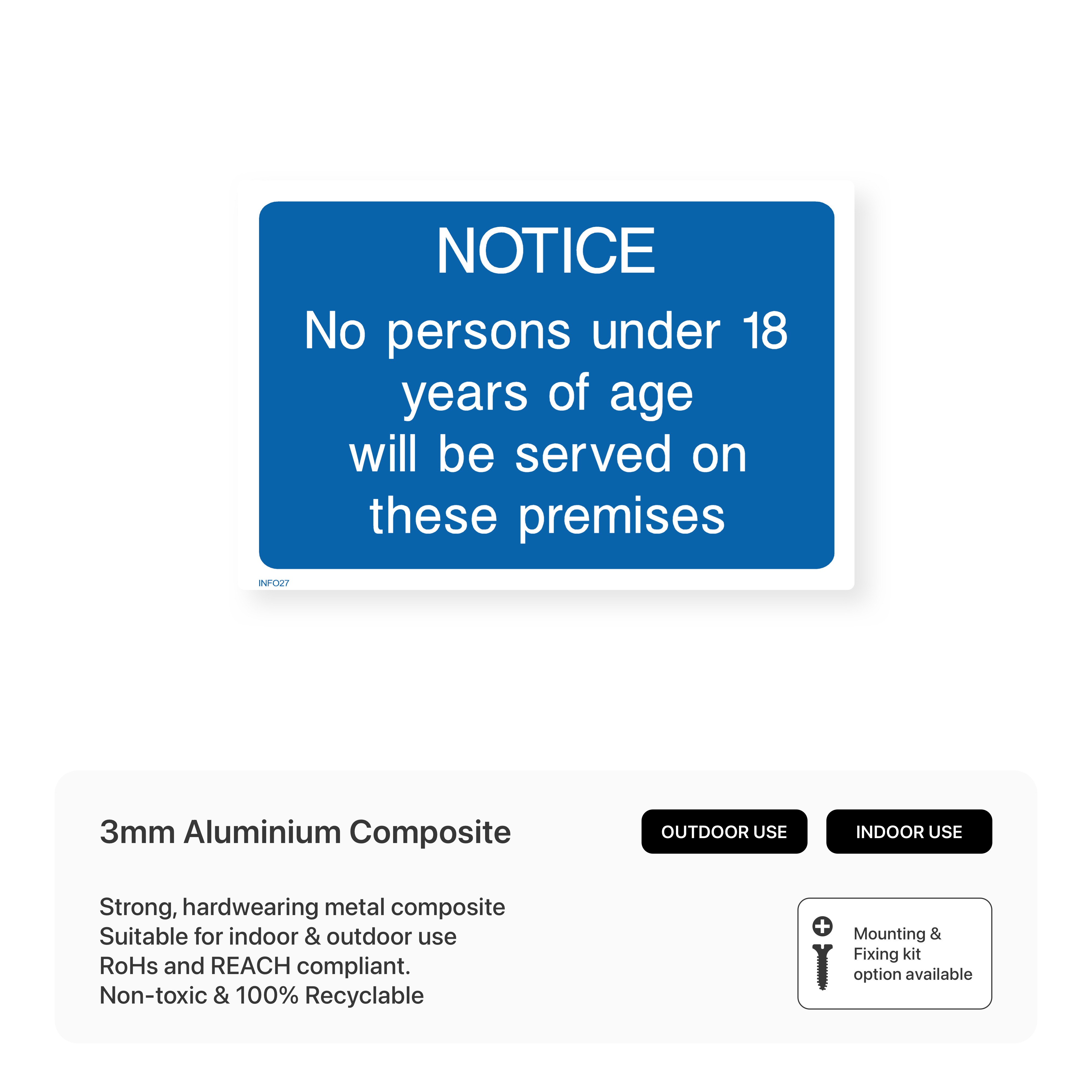 Clearly communicate age restrictions and ensure compliance with this "No Persons Under 18" safety sign. Available in multiple sizes and materials to suit your business needs, this professional sign is ideal for bars, pubs, off-licences, nightclubs, and other age-restricted venues. Maintain a safe and legally compliant environment with this essential signage solution.