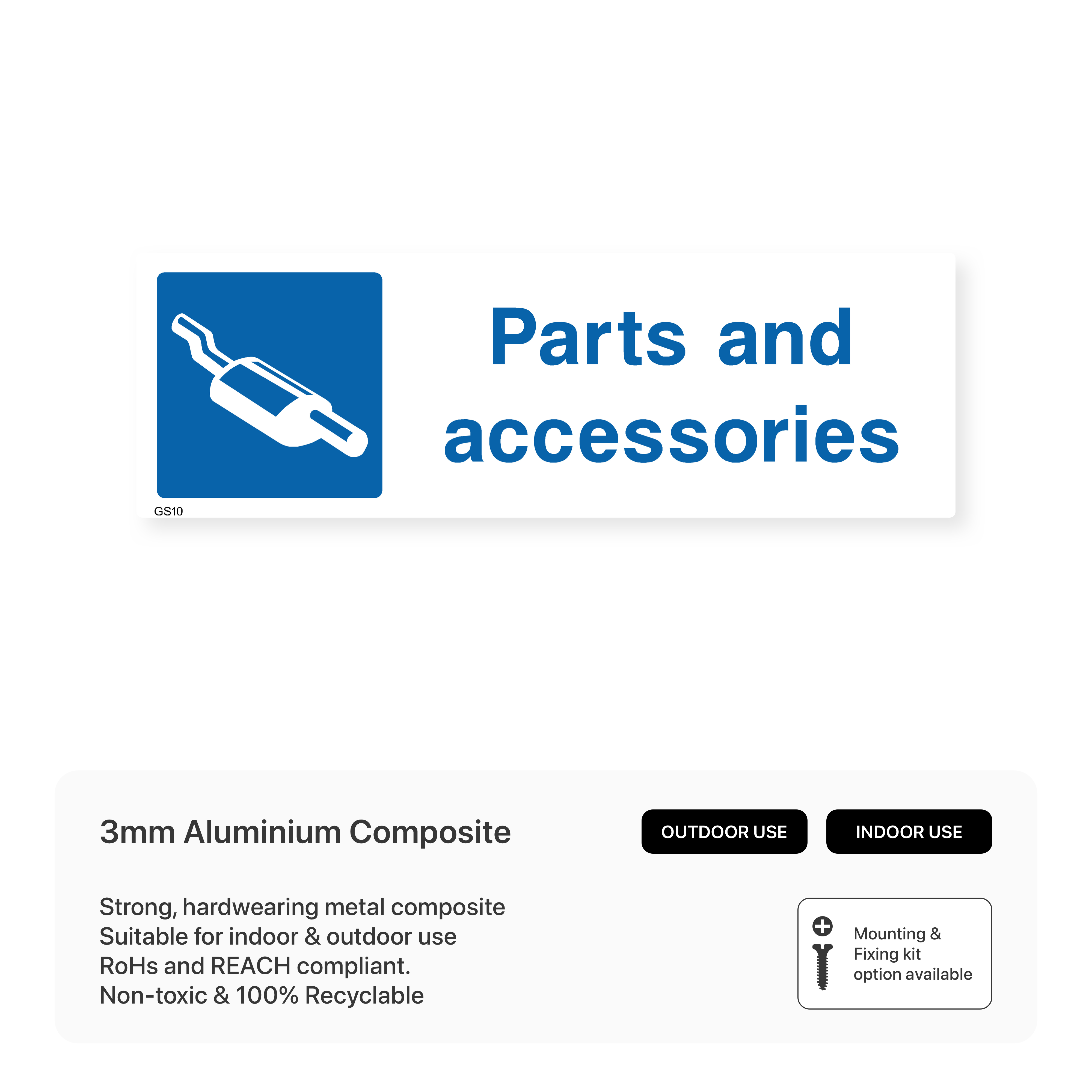 Clearly identify the parts and accessories area in your garage with our "Parts and accessories" sign. This sign helps customers and staff easily locate the area where they can purchase or inquire about parts and accessories.