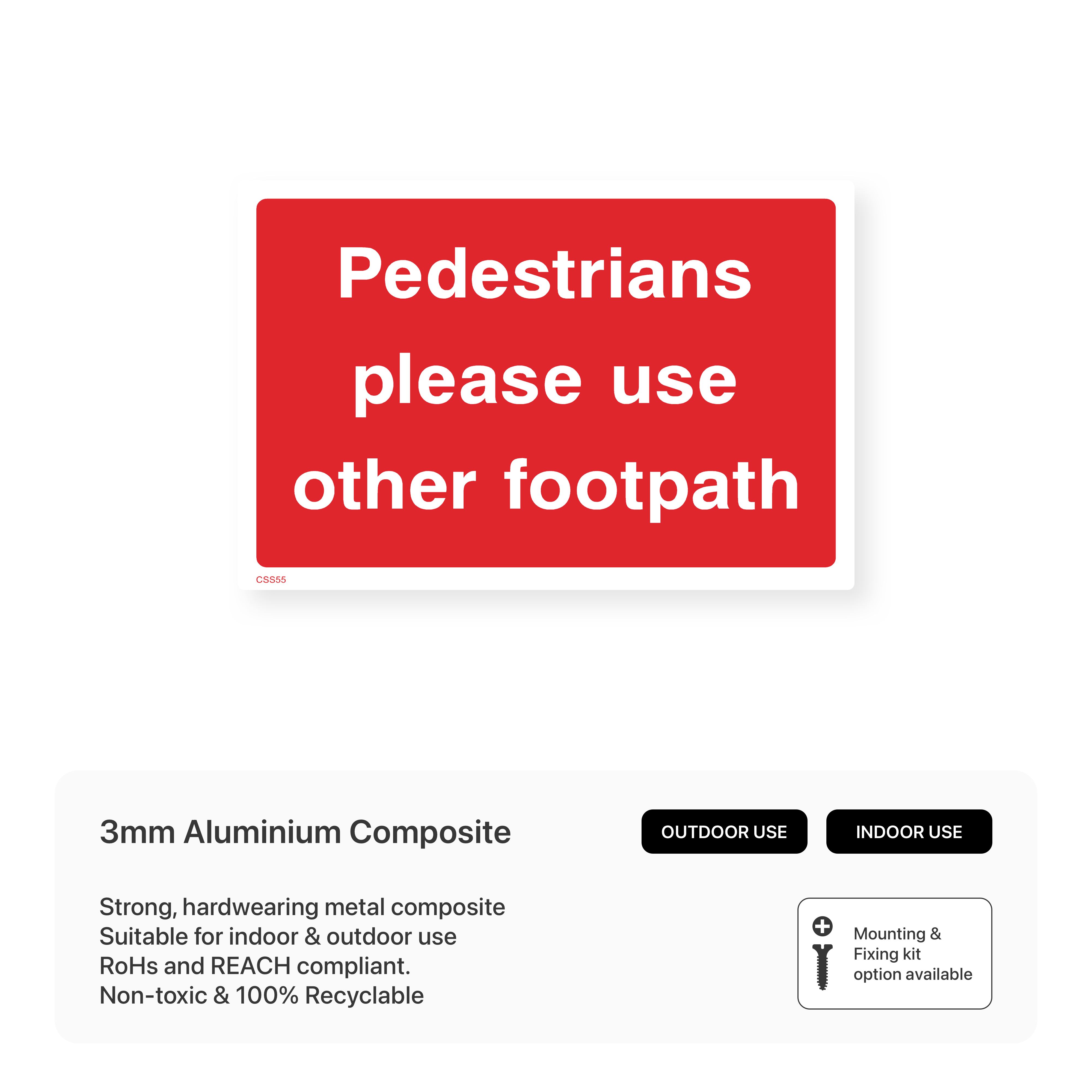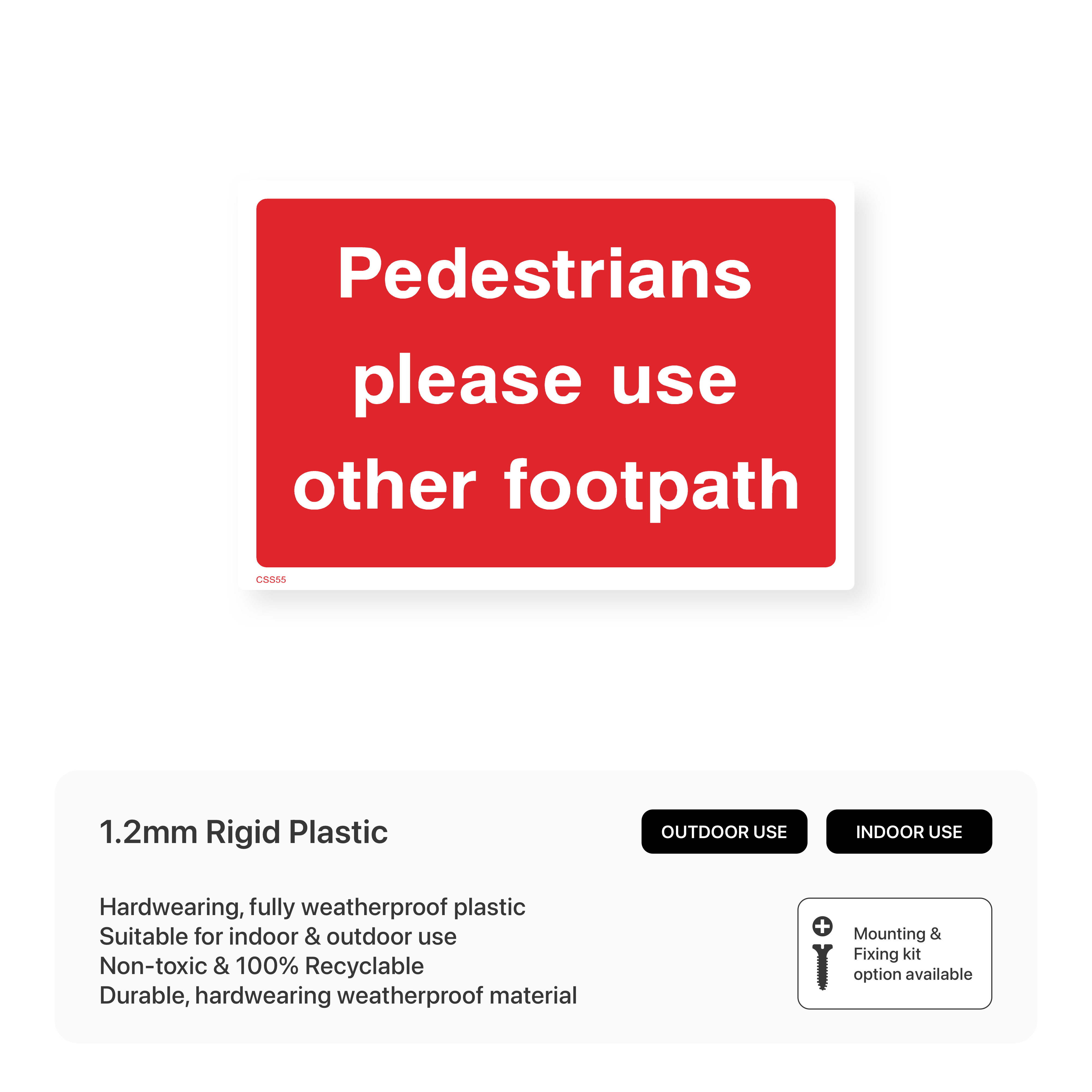 Direct pedestrian traffic safely with our "Pedestrians please use other footpath" sign. Clearly mark alternative routes for pedestrians in areas where construction work is taking place to prevent accidents and ensure their safety.