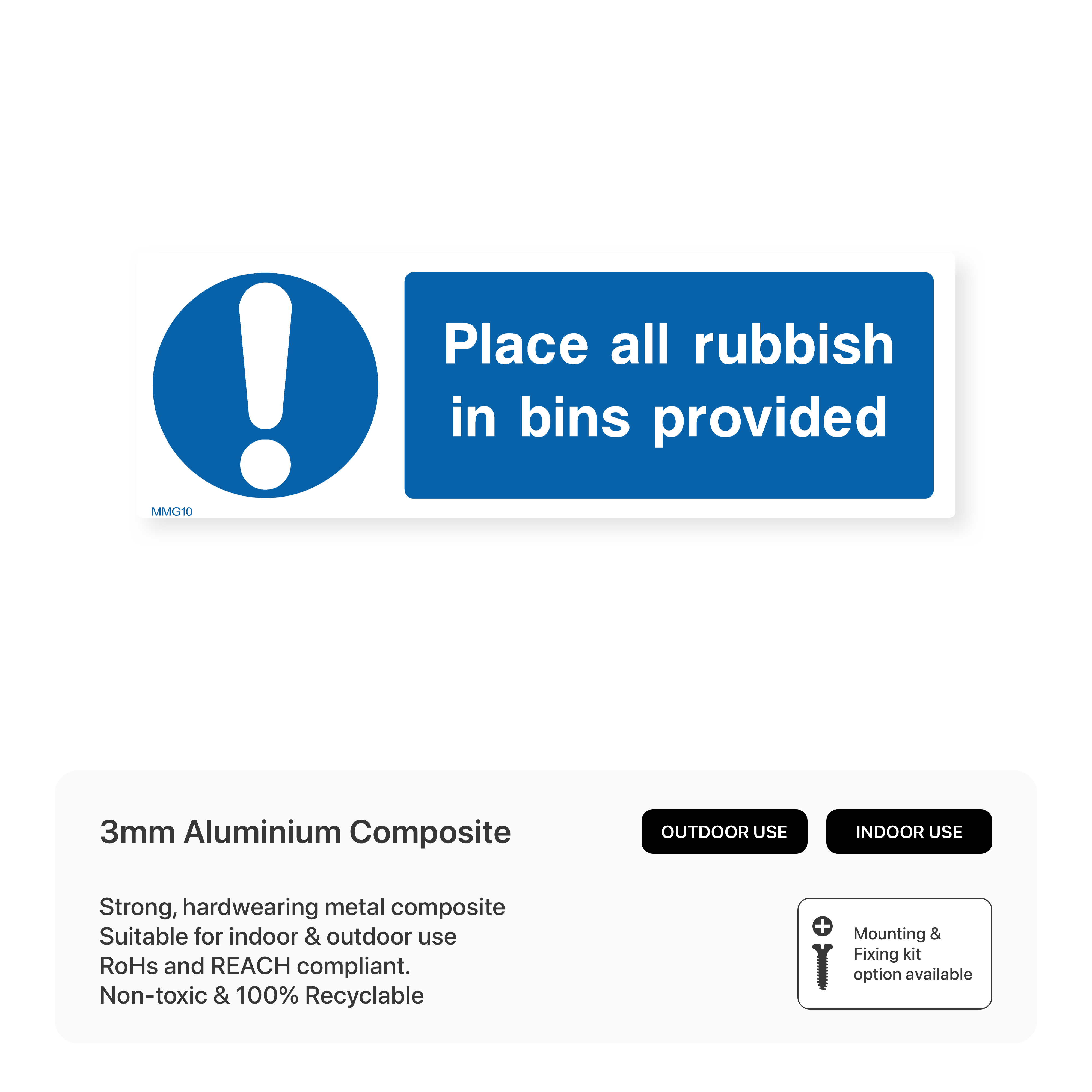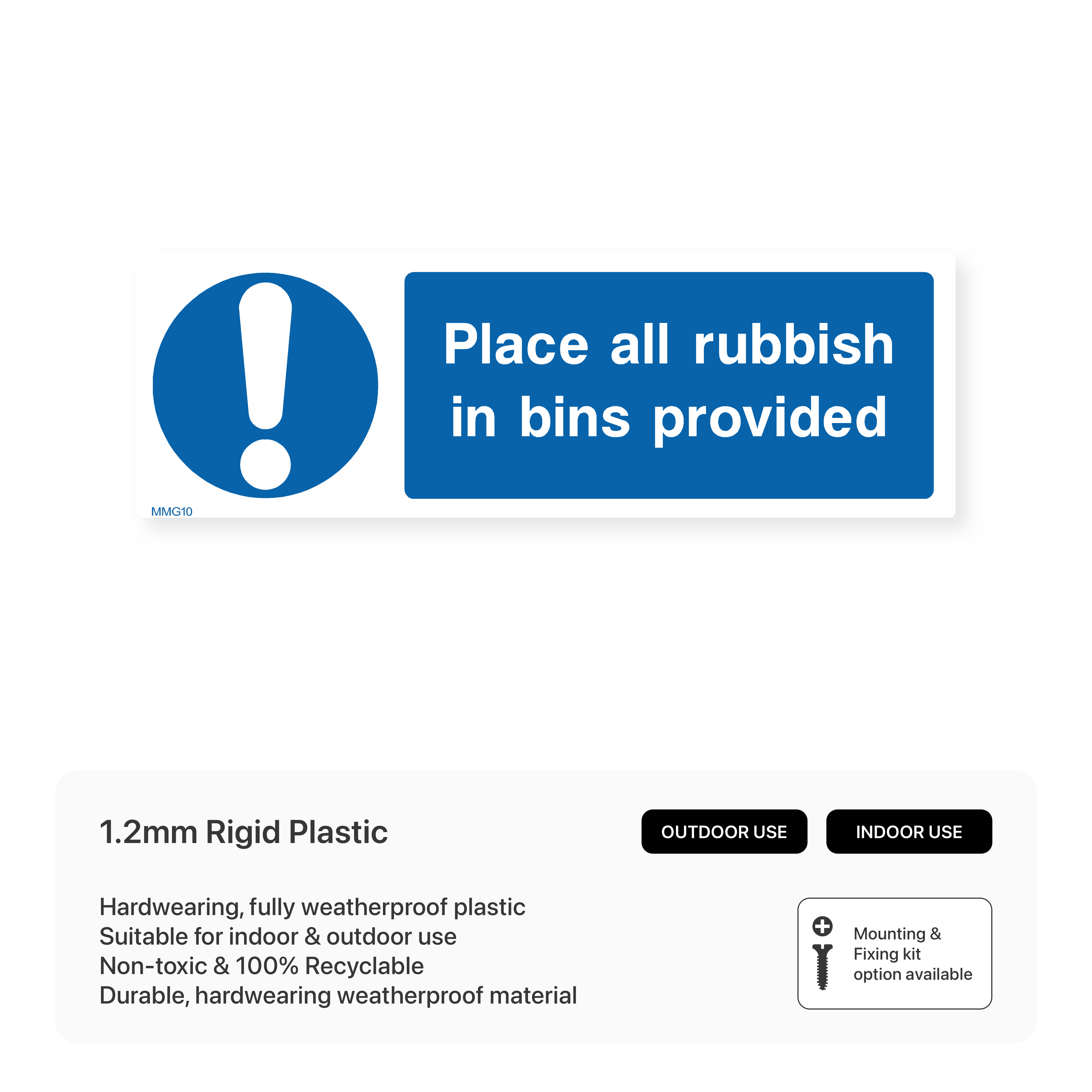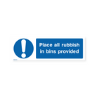Maintain a clean and hygienic environment with our "Place All Rubbish in Bins Provided" signs. Encourage proper waste disposal and prevent litter. Available in various sizes and materials for easy placement in any setting.