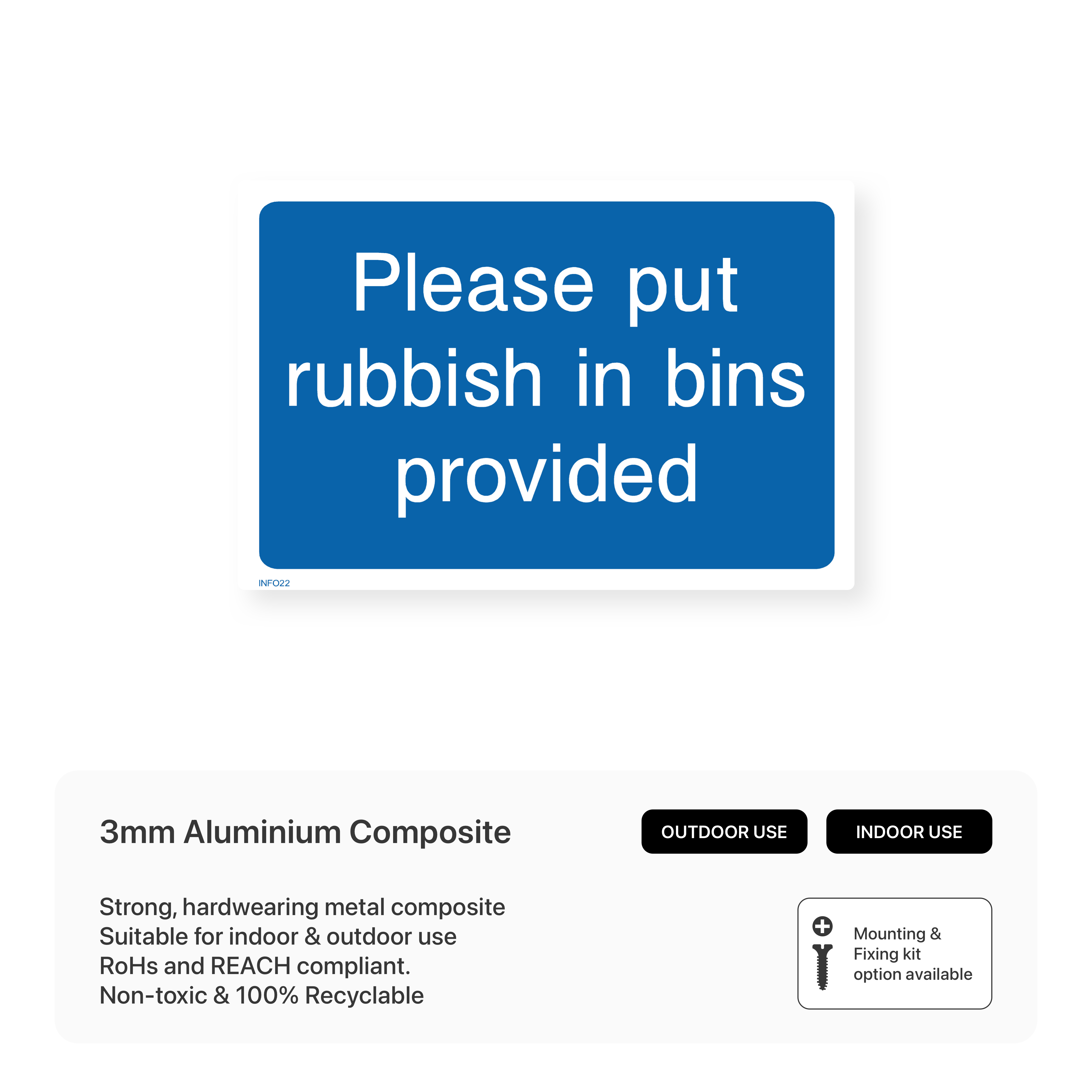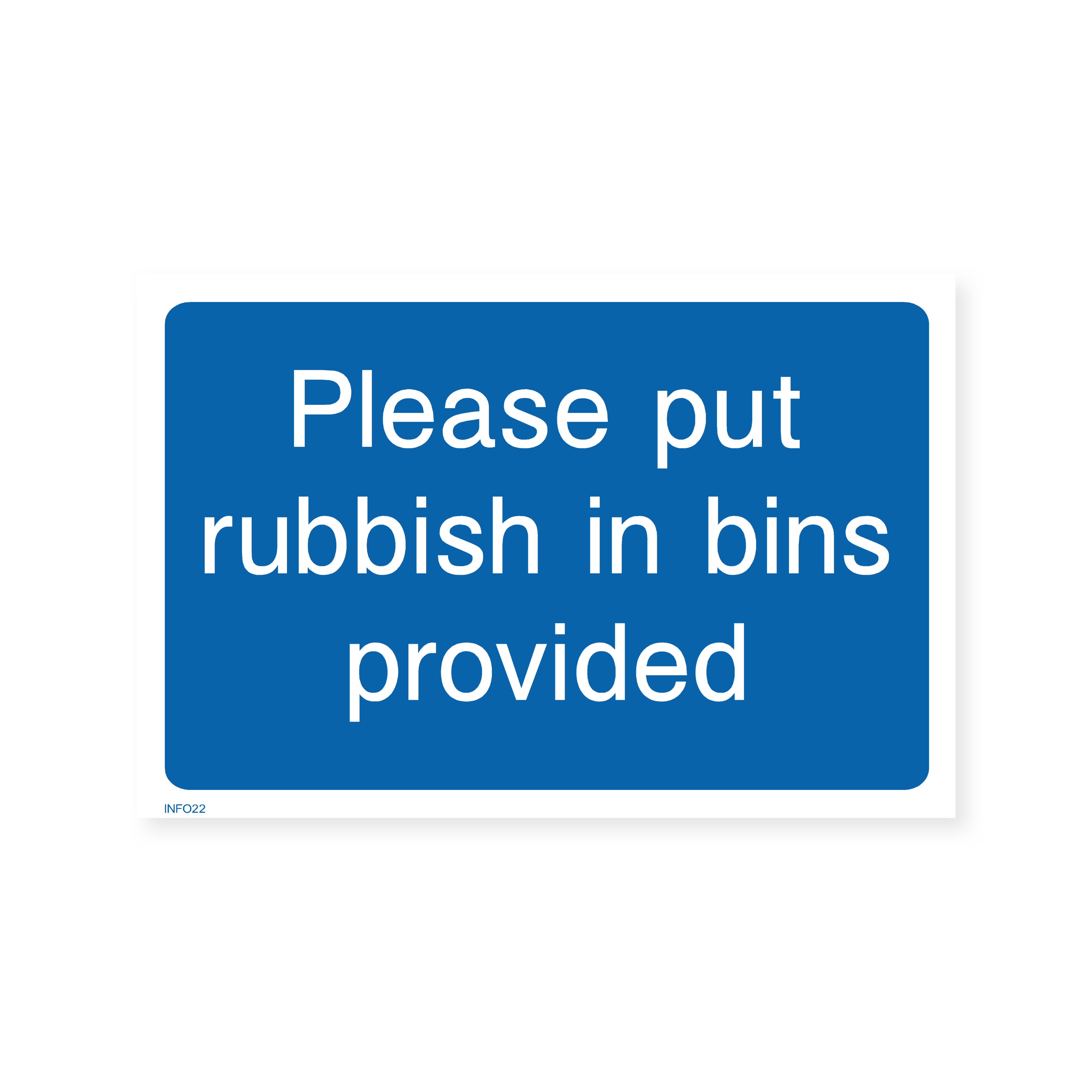 Encourage cleanliness and proper waste disposal with our "Please put rubbish in bins provided" sign. This sign reminds individuals to dispose of their waste responsibly, contributing to a cleaner and more pleasant environment.