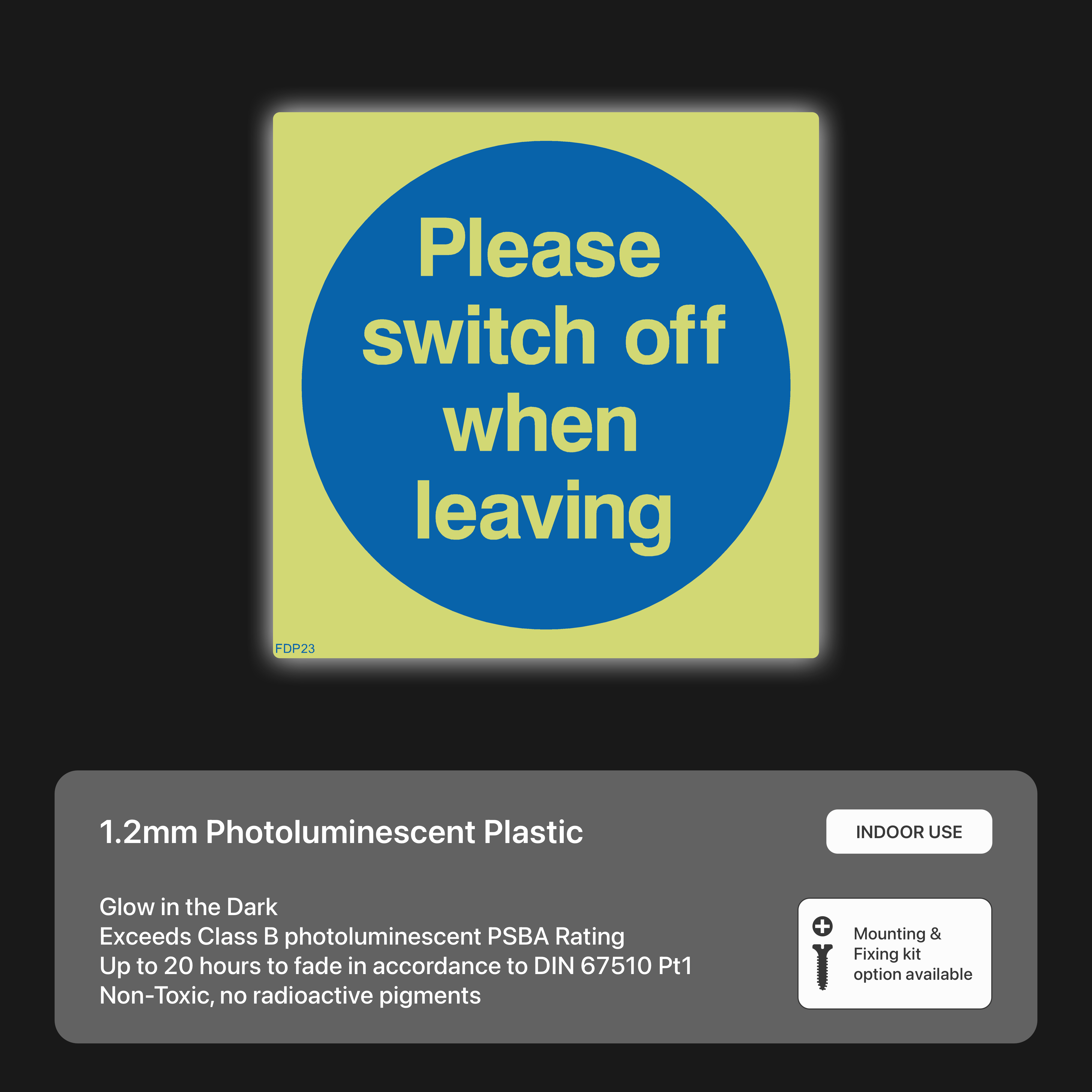 Promote energy conservation with our "Please switch off when leaving" sign. This sign reminds individuals to turn off lights and other electrical devices when leaving a room or area, helping to reduce energy consumption and lower costs.