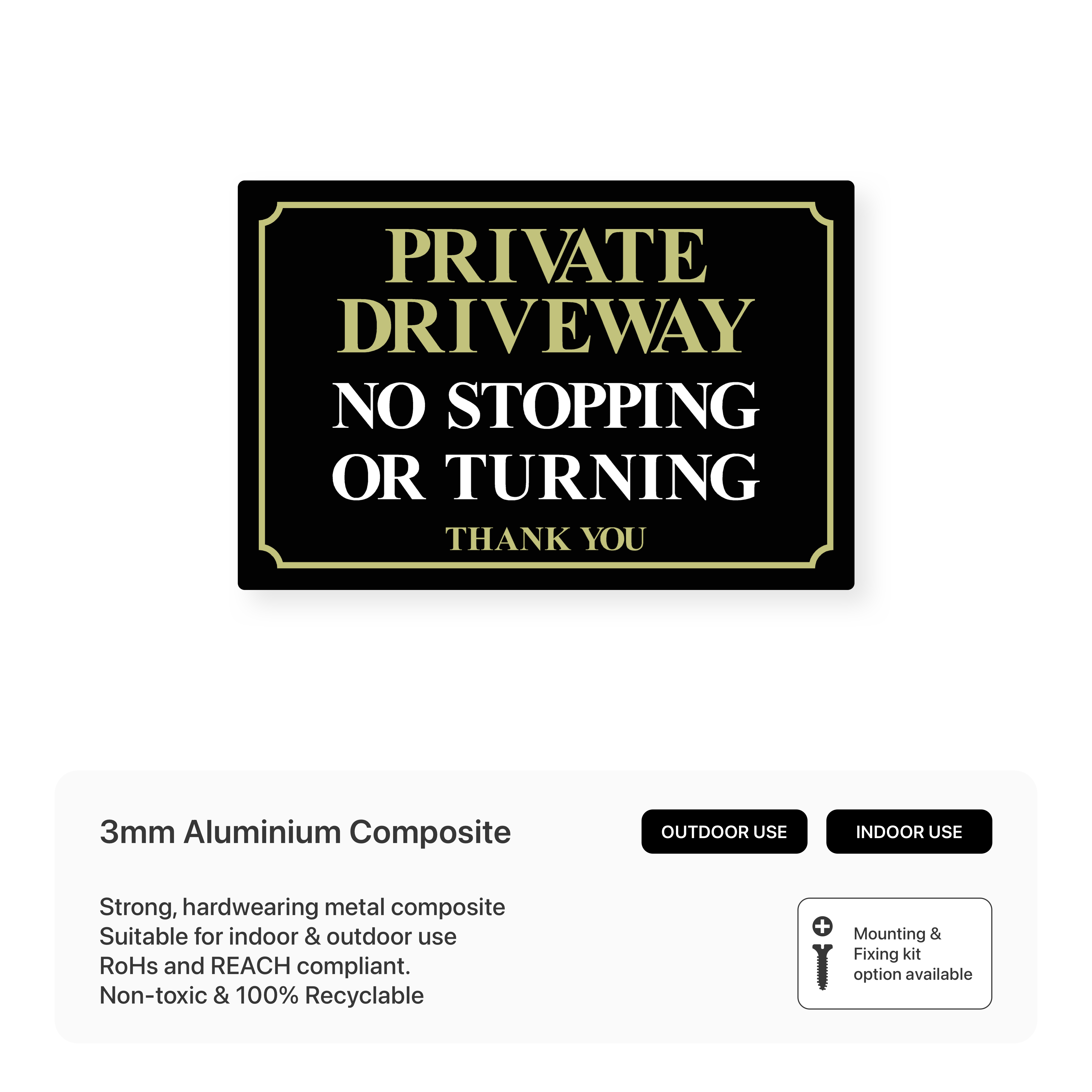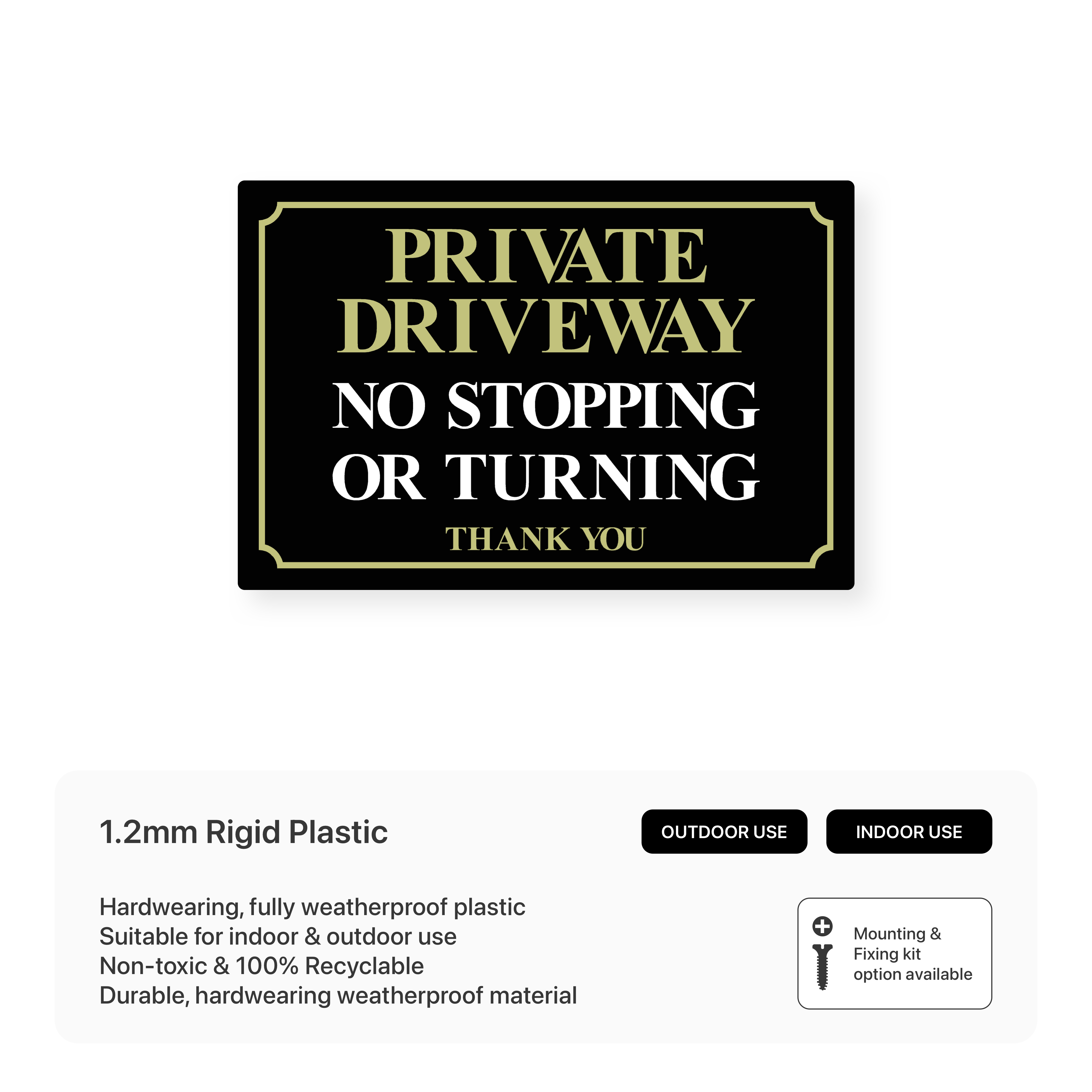 Maintain clear access to your private driveway with our "Private Driveway - No stopping or turning - Thank you" sign. This sign clearly communicates restrictions on stopping and turning, preventing obstructions and ensuring smooth traffic flow for residents and authorized vehicles.