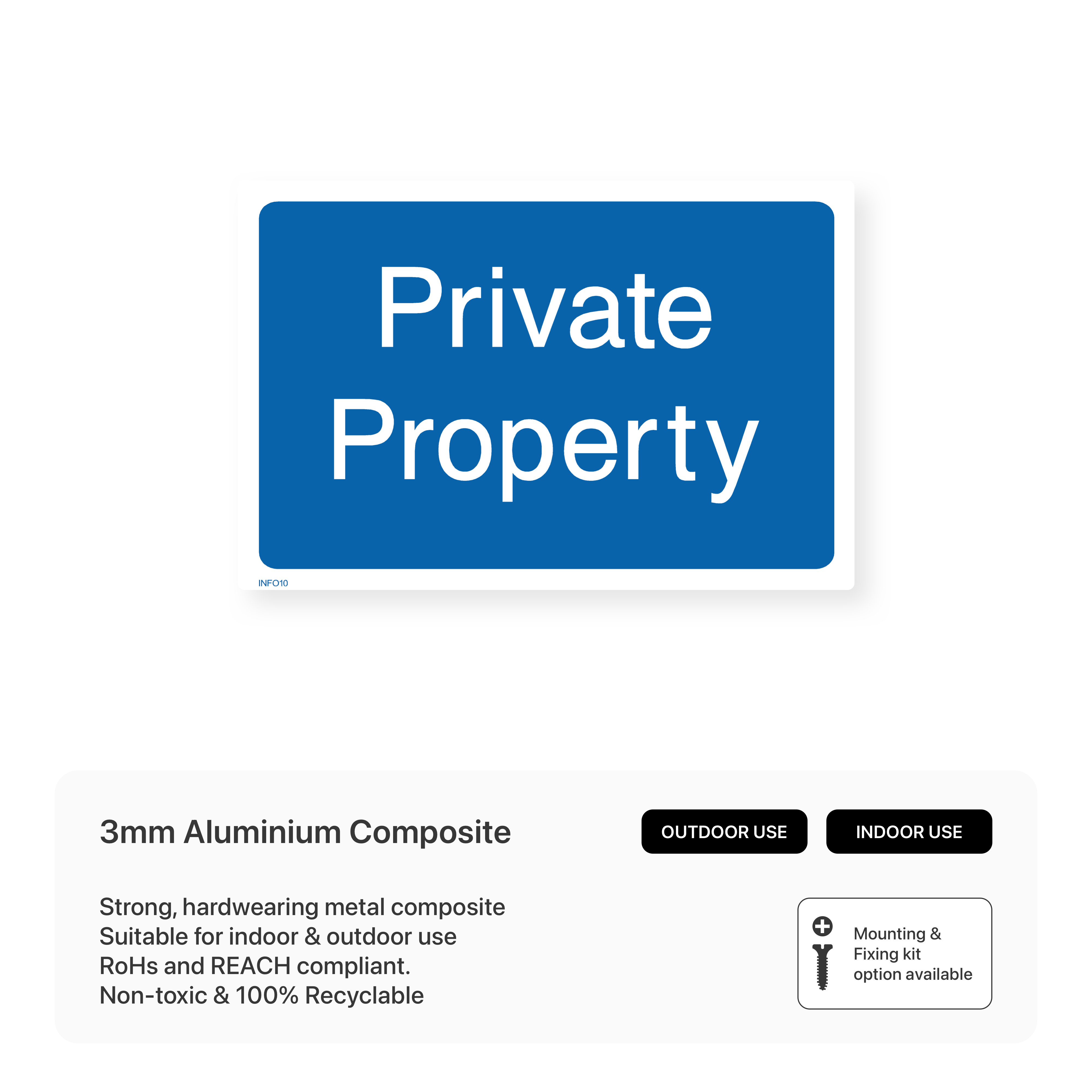 Clearly mark your property with our "Private Property" sign. This sign establishes ownership and deters unauthorized access, ensuring the privacy and security of your premises.