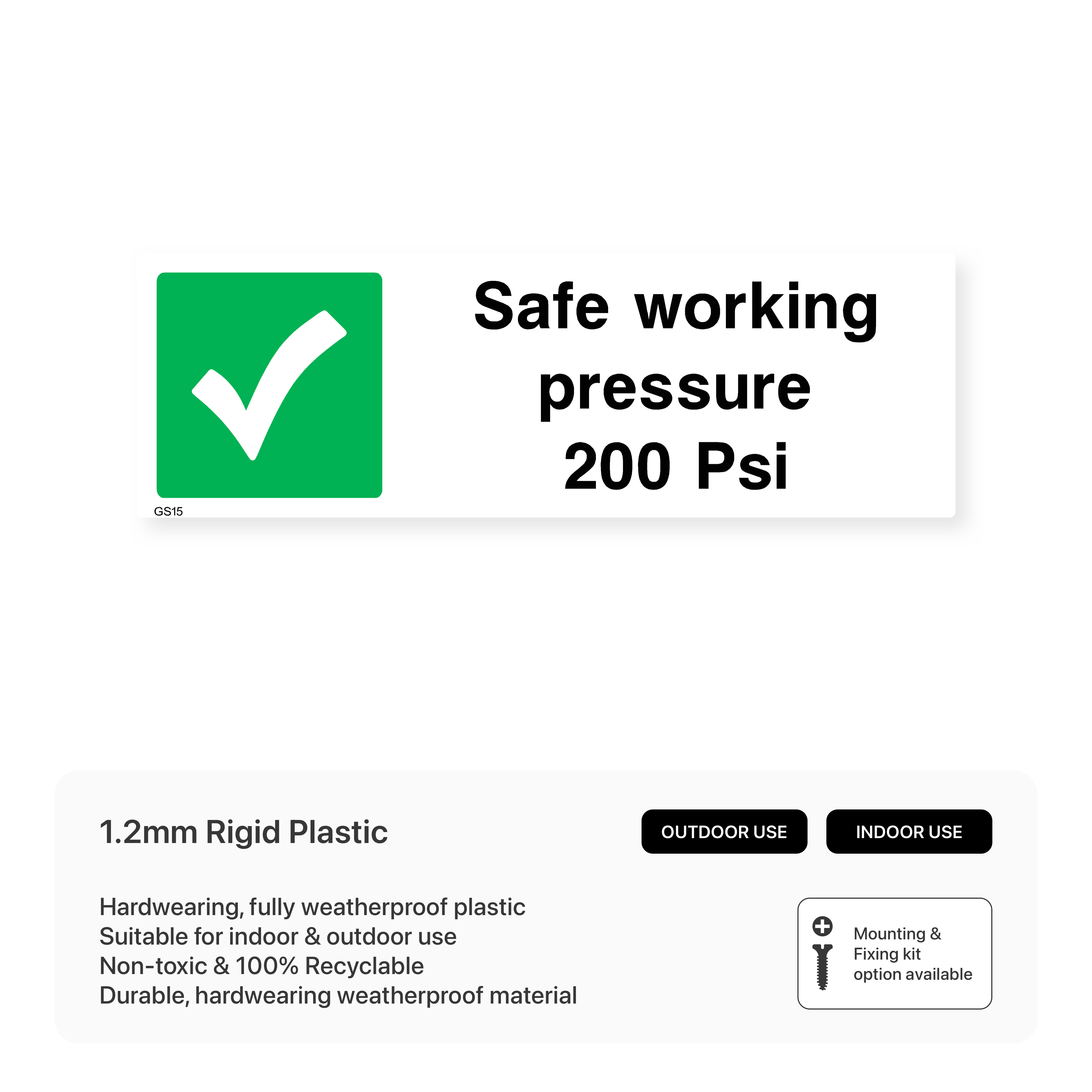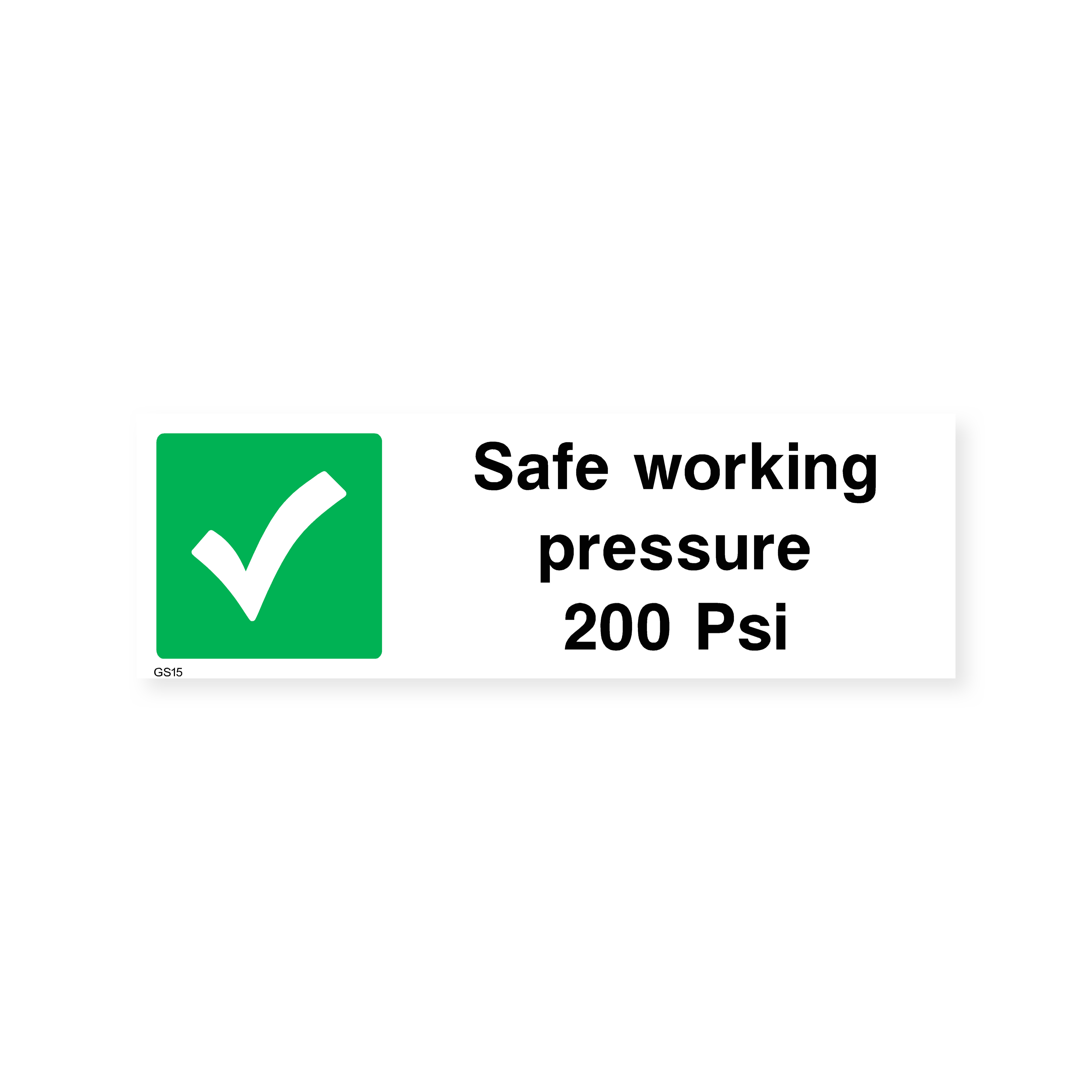 Ensure safety in your garage with our "Safe working pressure - 200 PSI" sign. This sign clearly indicates the maximum pressure allowed for specific equipment or systems, preventing damage and accidents.
