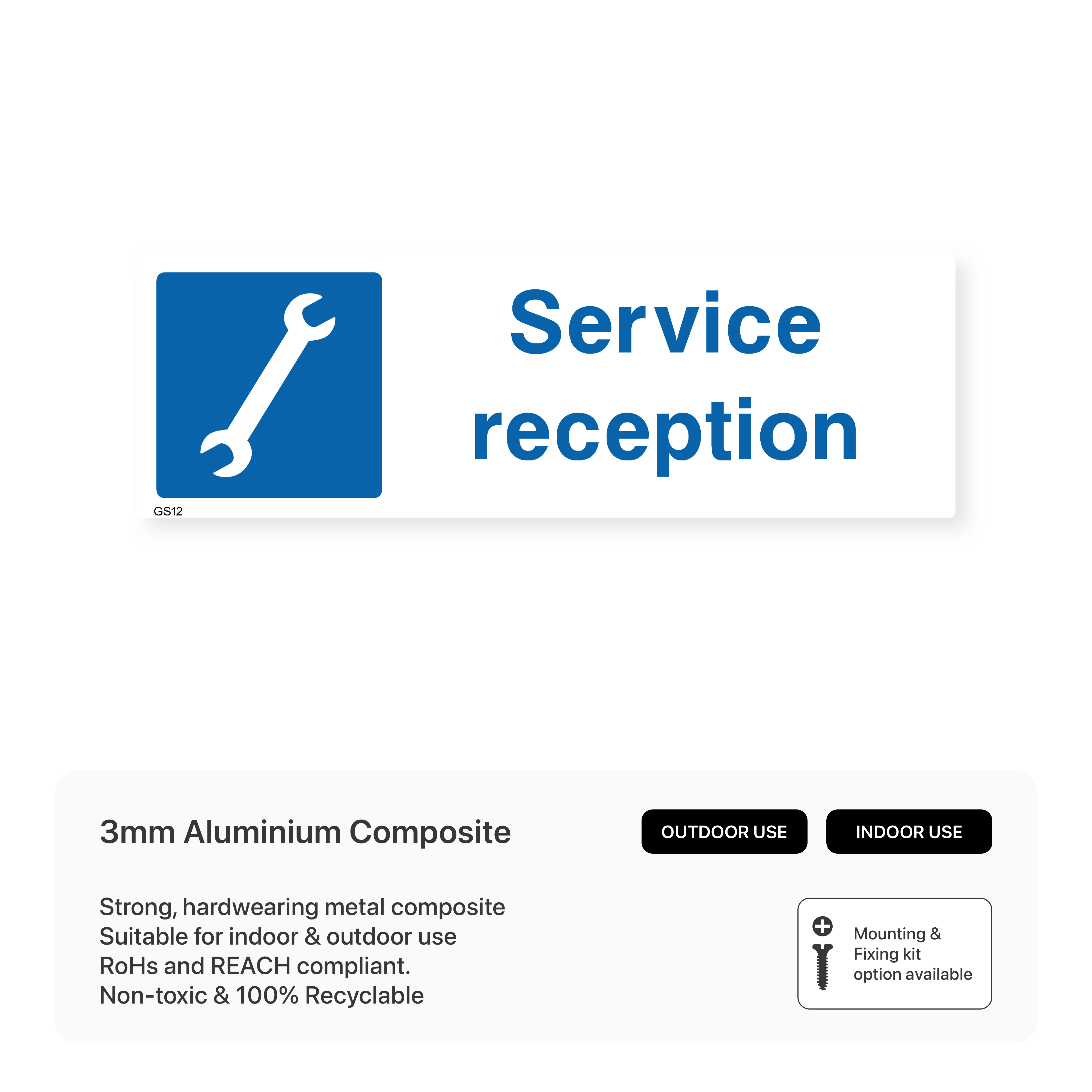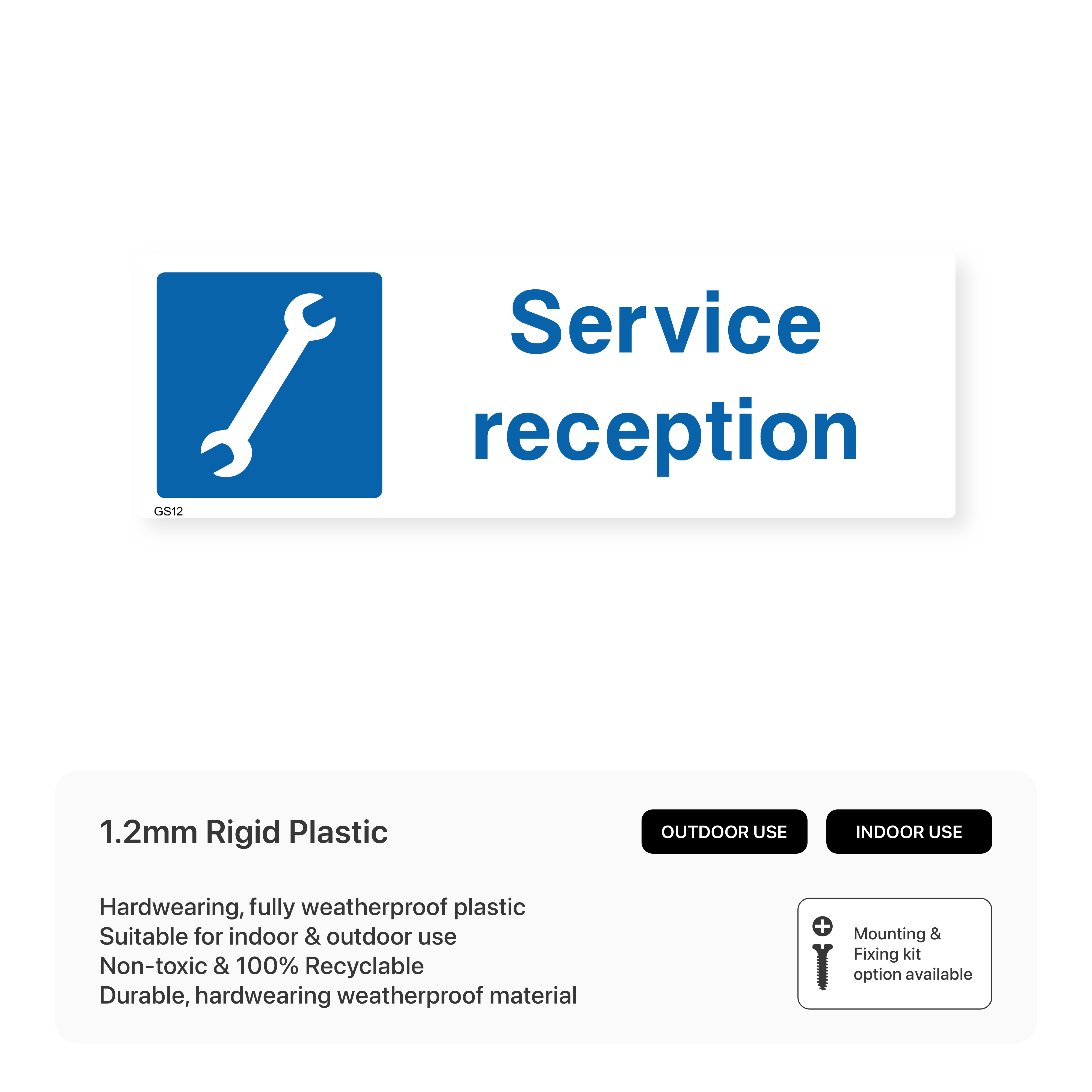Clearly mark the service reception area in your garage with our "Service reception" sign. This sign helps customers easily locate the area where they can check in for service or repairs, improving the customer experience.