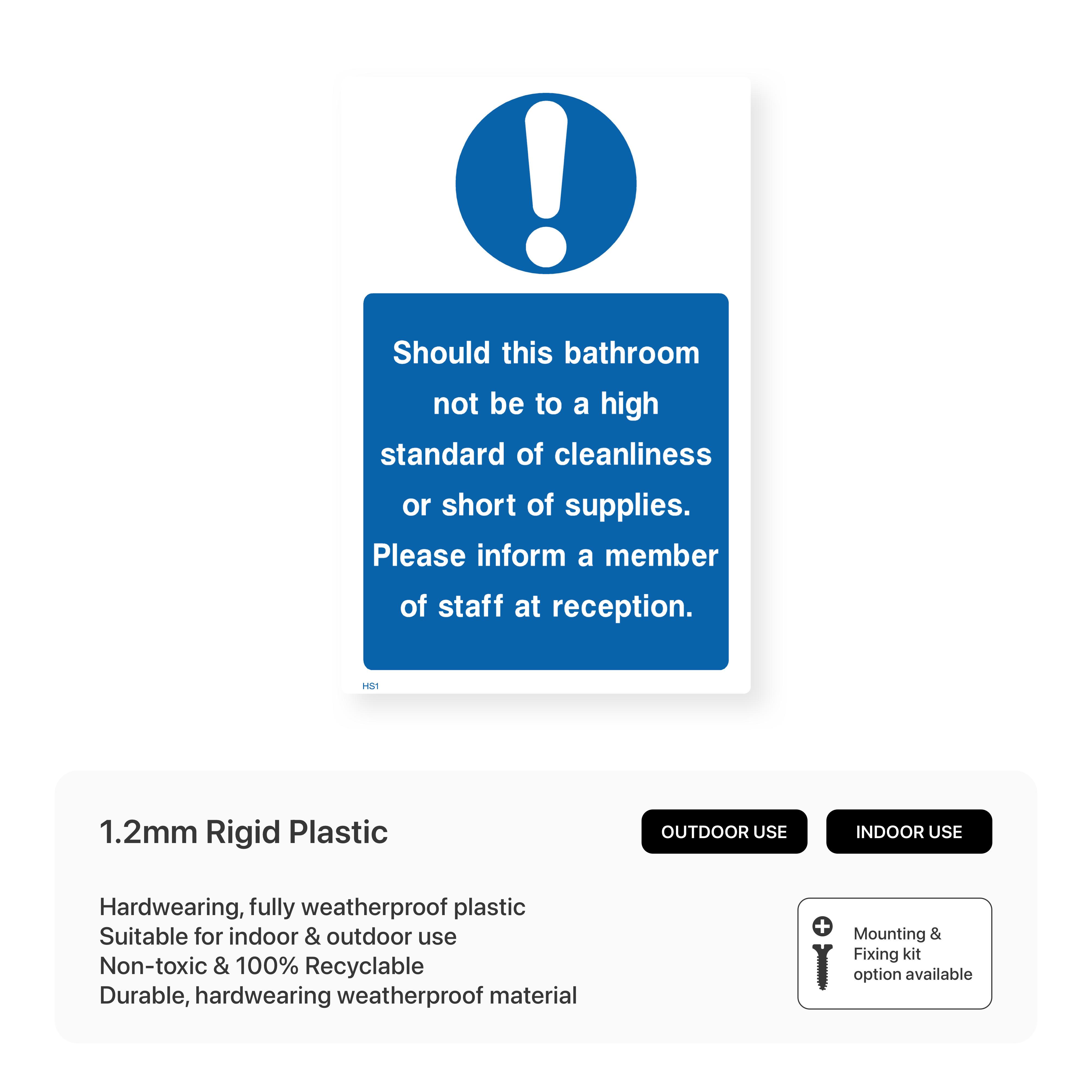 Should this bathroom not be to a high standard of cleanliness or short of supplies. Please inform a member of staff at reception.