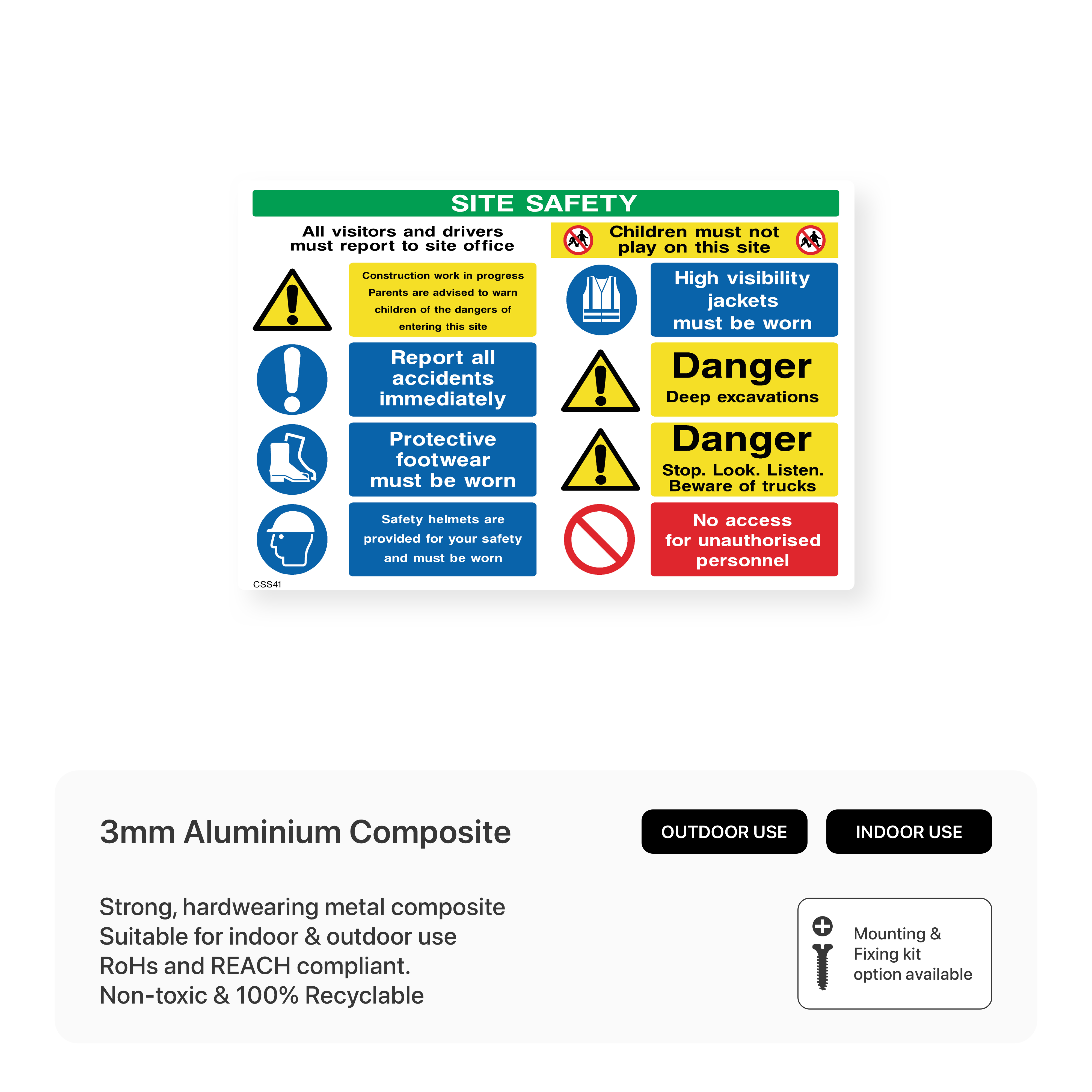 Direct visitors and drivers to the site office with our "Site safety" sign. Clearly communicate this requirement to ensure proper check-in procedures are followed and everyone on site is accounted for, promoting safety and security.