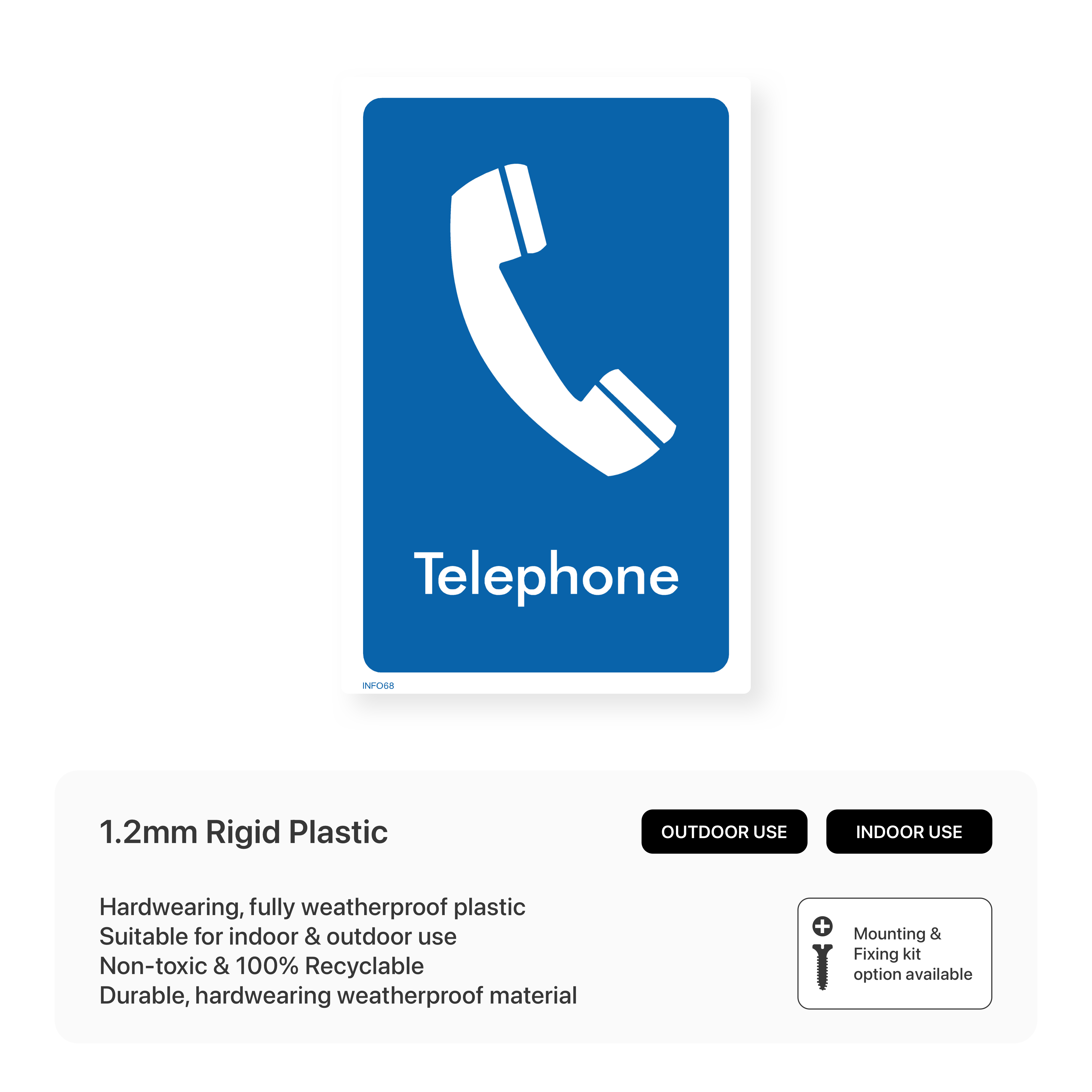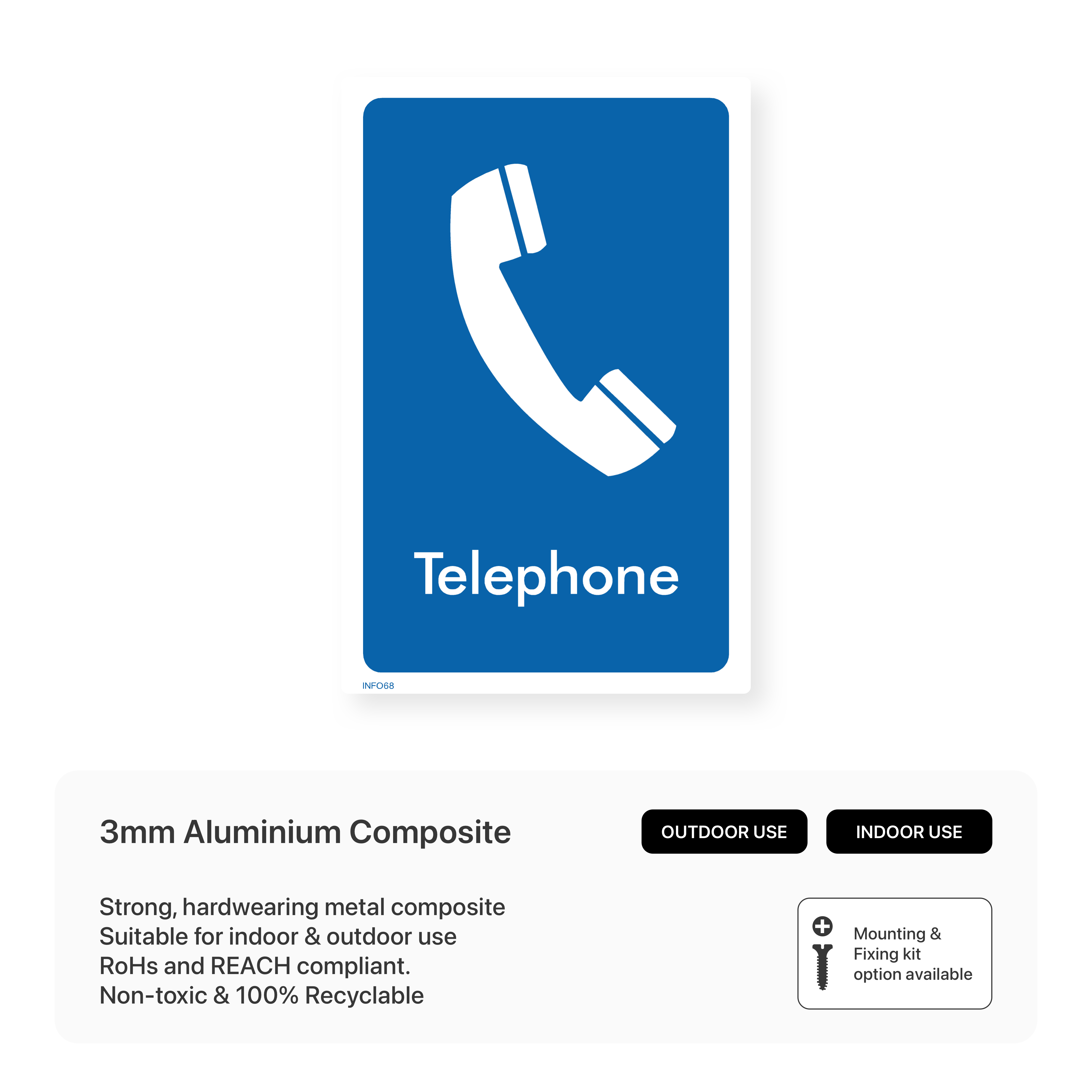 Clearly mark the location of public telephones with our "Telephone" sign. This sign helps individuals easily find a phone to make calls, especially in areas where mobile phone reception may be limited.