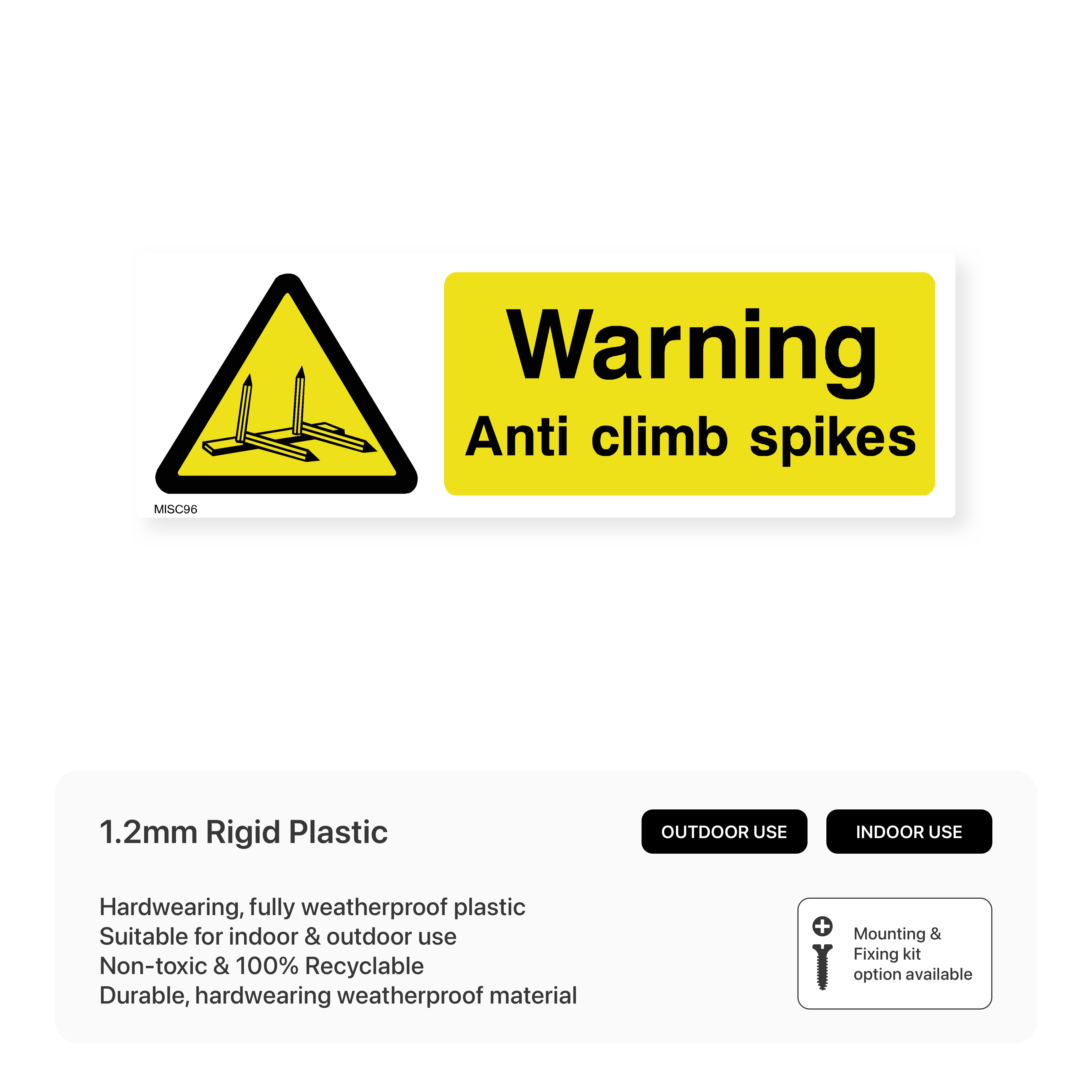 Deter intruders with our "Warning Anti-Climb Spikes" signs. Clearly communicate the presence of security measures and discourage unauthorized access. Available in various sizes and materials.