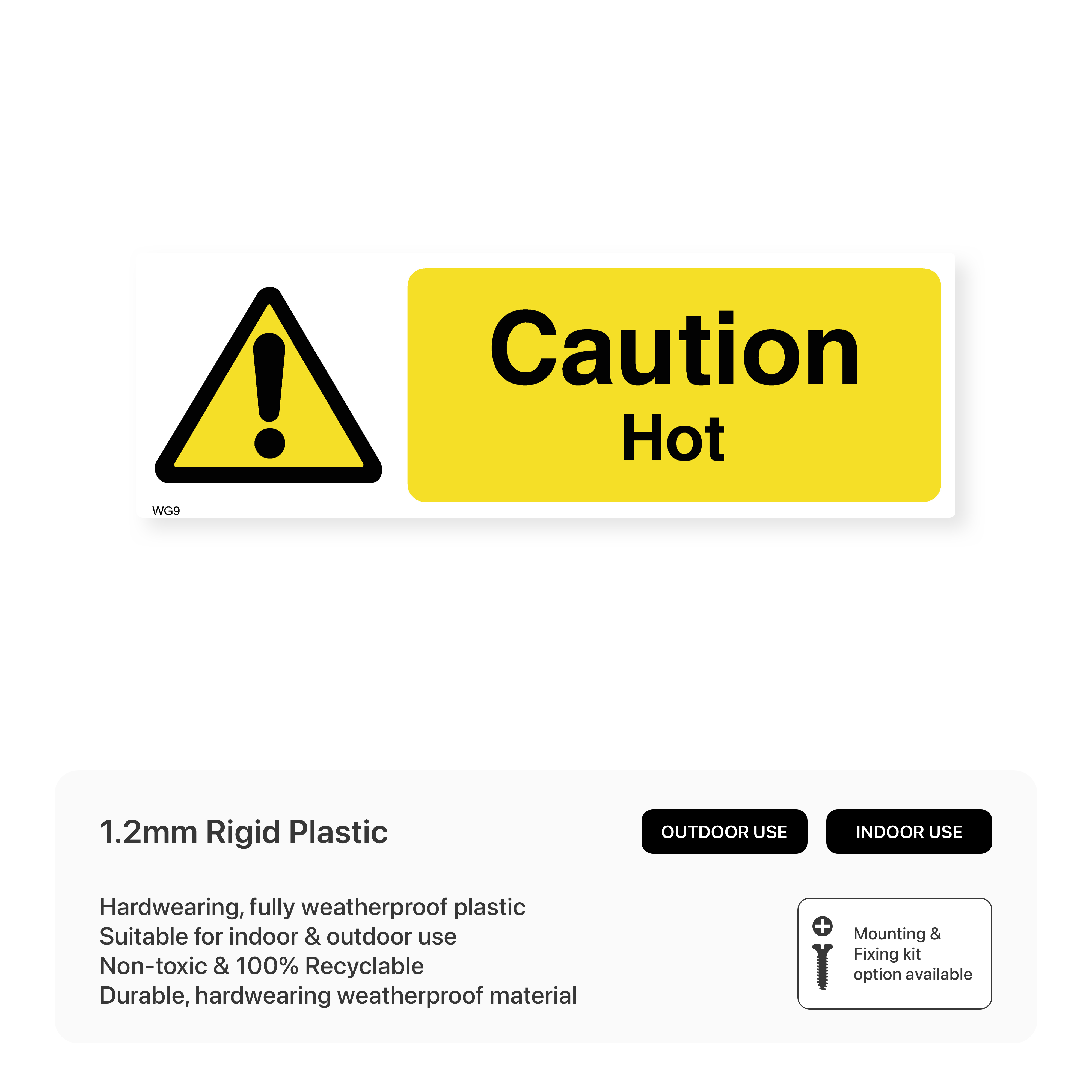 Clearly mark hot surfaces or areas with this sign to prevent burns and injuries. This sign is suitable for use in kitchens, industrial settings, and other areas with hot equipment or materials.