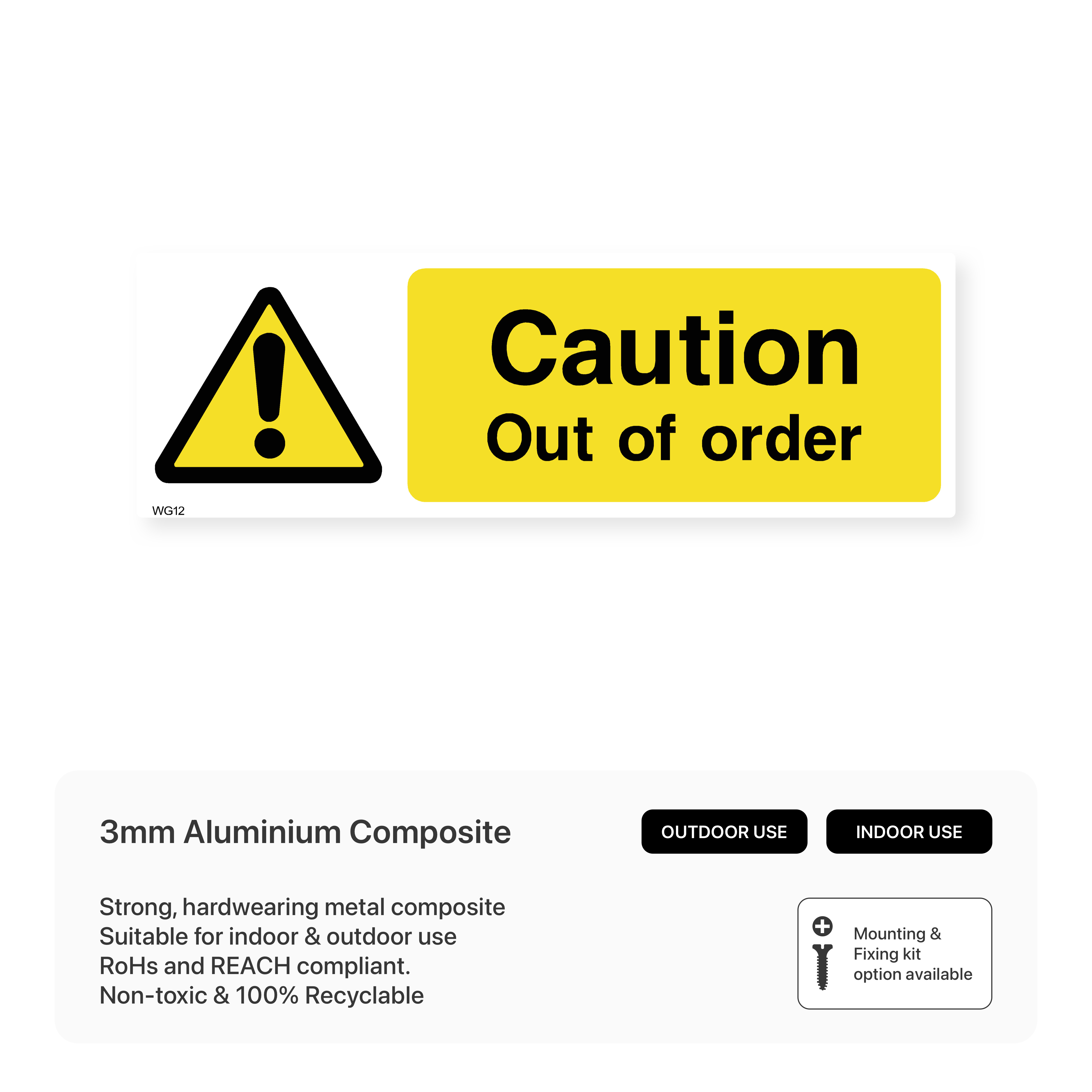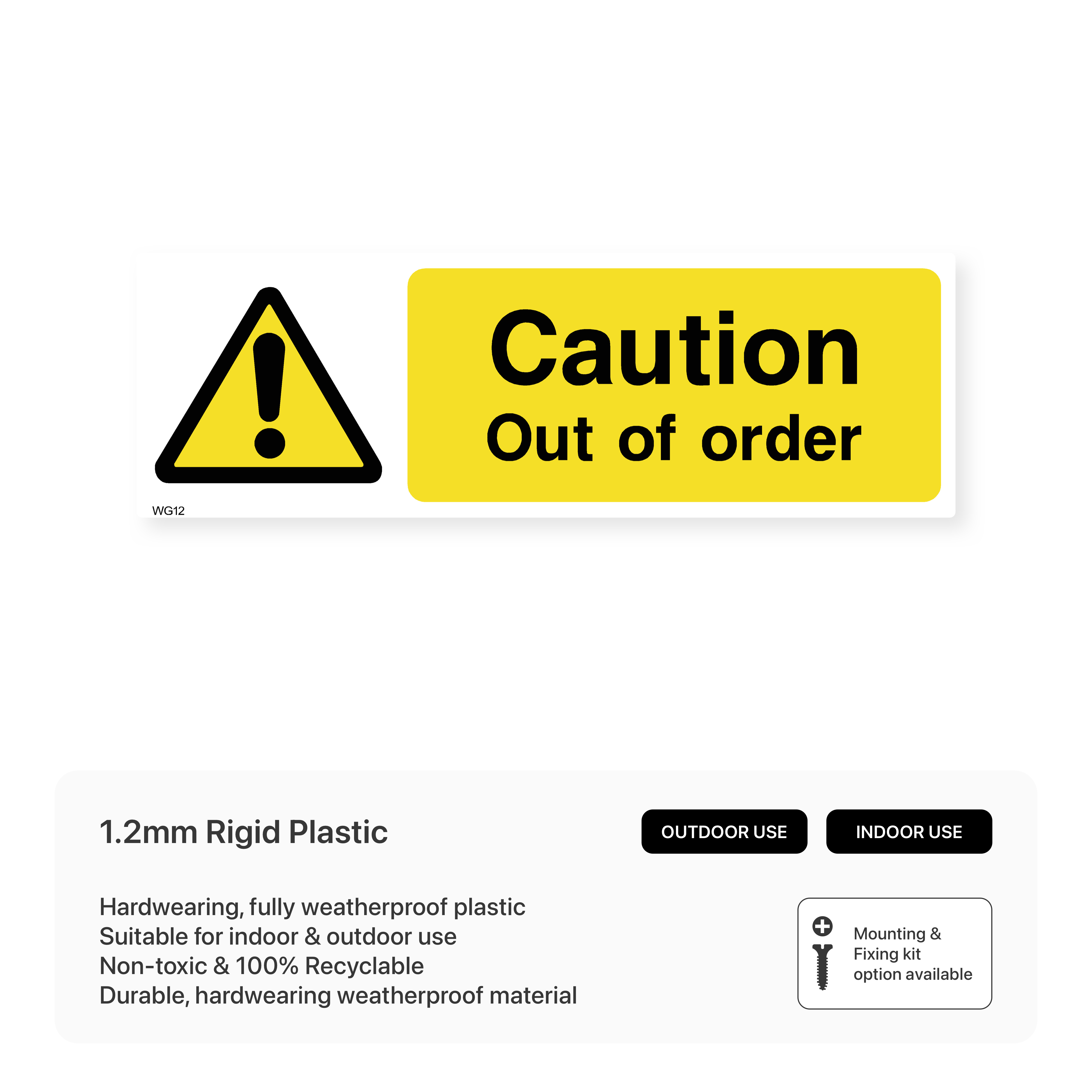 Clearly communicate equipment or facility malfunctions with our "Caution - Out of Order" safety signs. Available in various sizes and materials, these signs effectively alert individuals to avoid using faulty equipment, ensuring safety and preventing accidents.