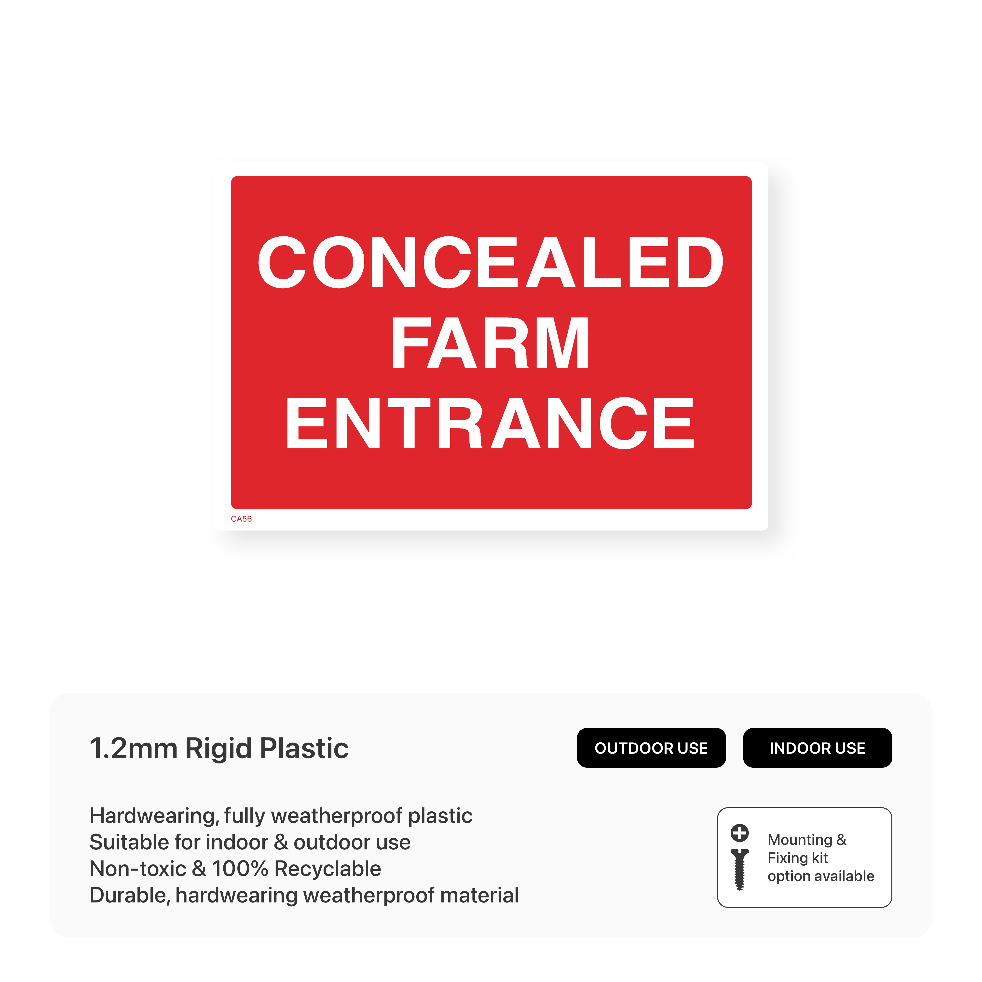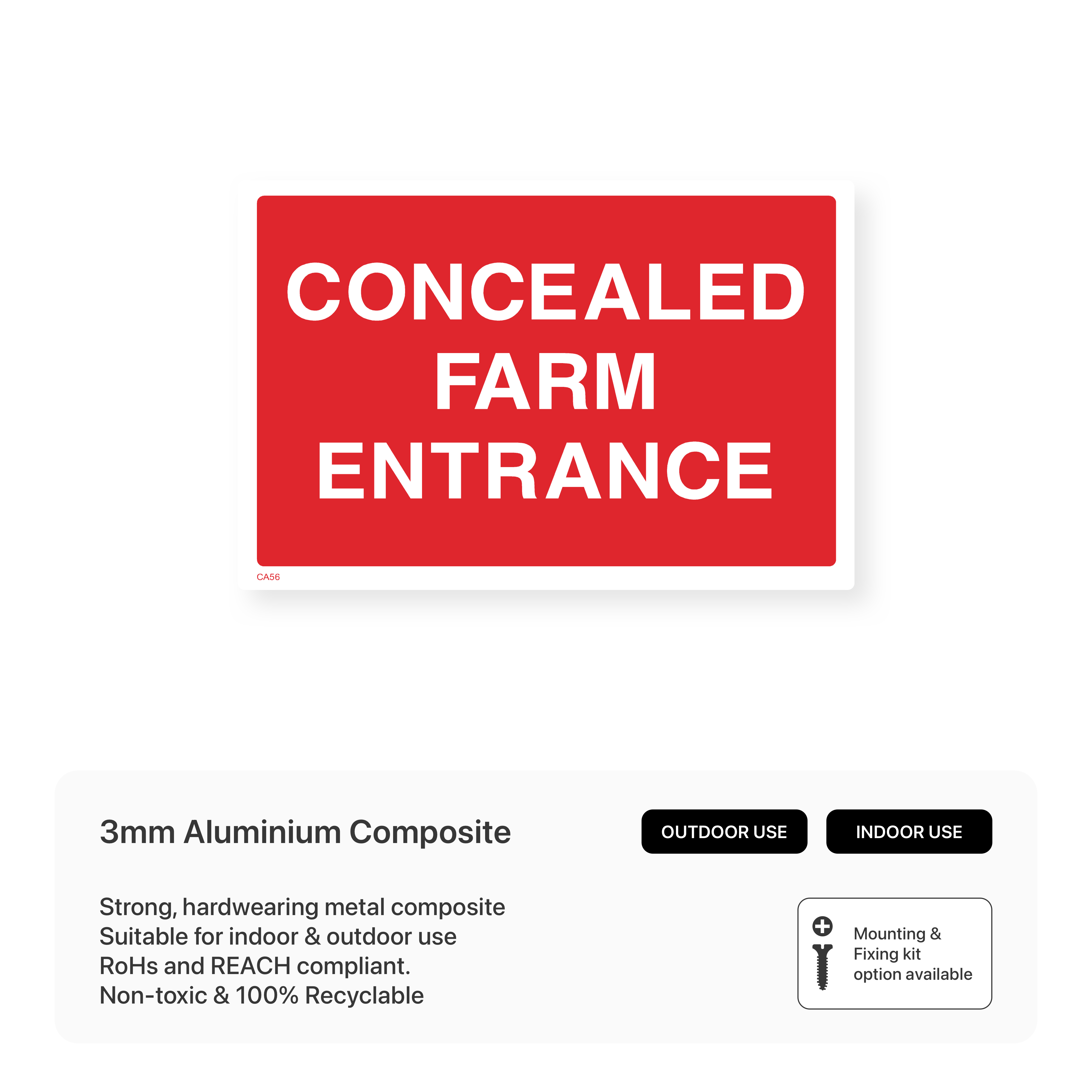 Clearly mark concealed entrances to your farm. Available in various sizes and materials, these signs help prevent accidents and ensure the safety of visitors and delivery drivers.