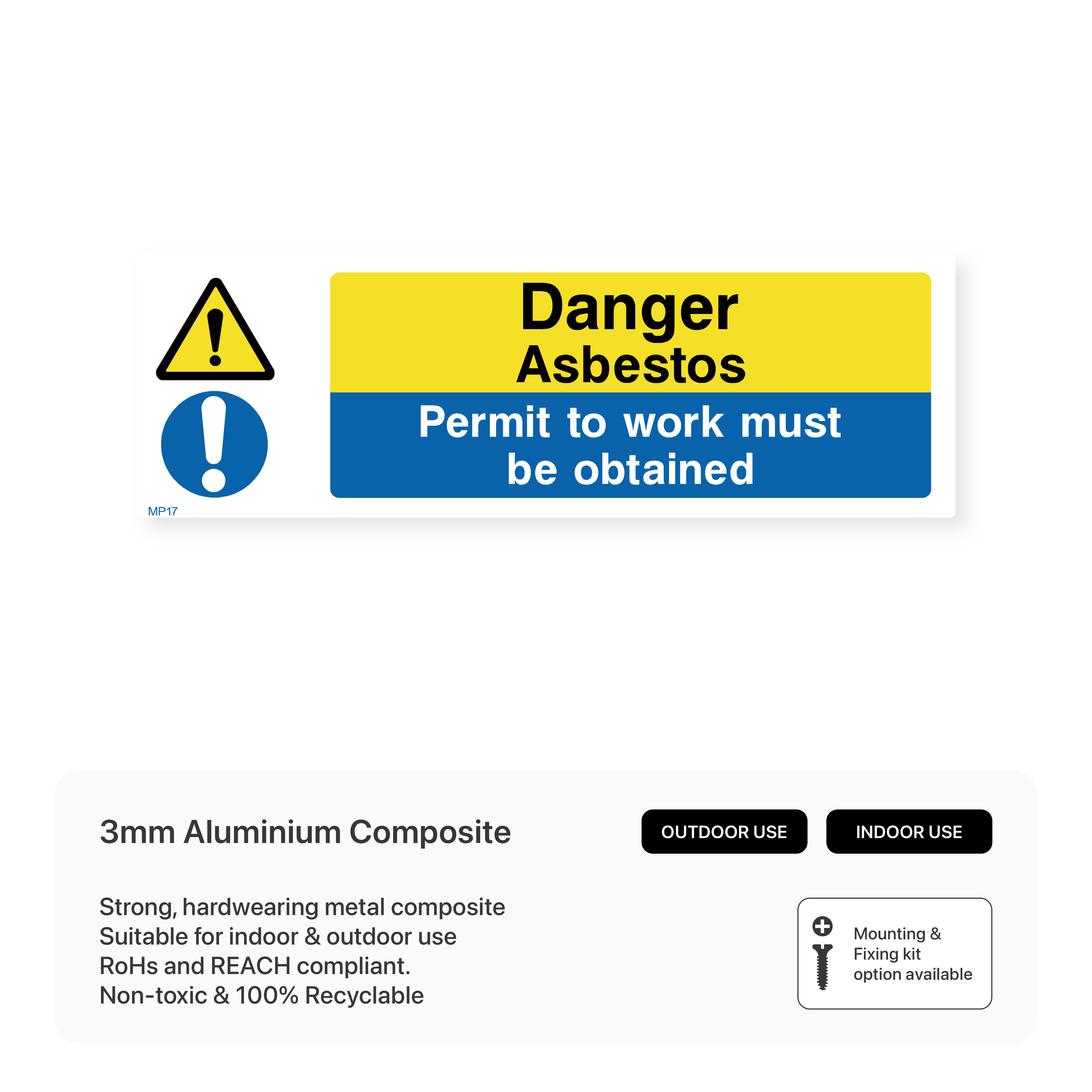 Regulate access to areas with asbestos-containing materials with this essential danger sign. It clearly communicates the requirement to obtain a permit to work before entering, ensuring that only authorized and trained personnel can access the area. Ideal for construction sites, renovation projects, and any environment where asbestos may be present.