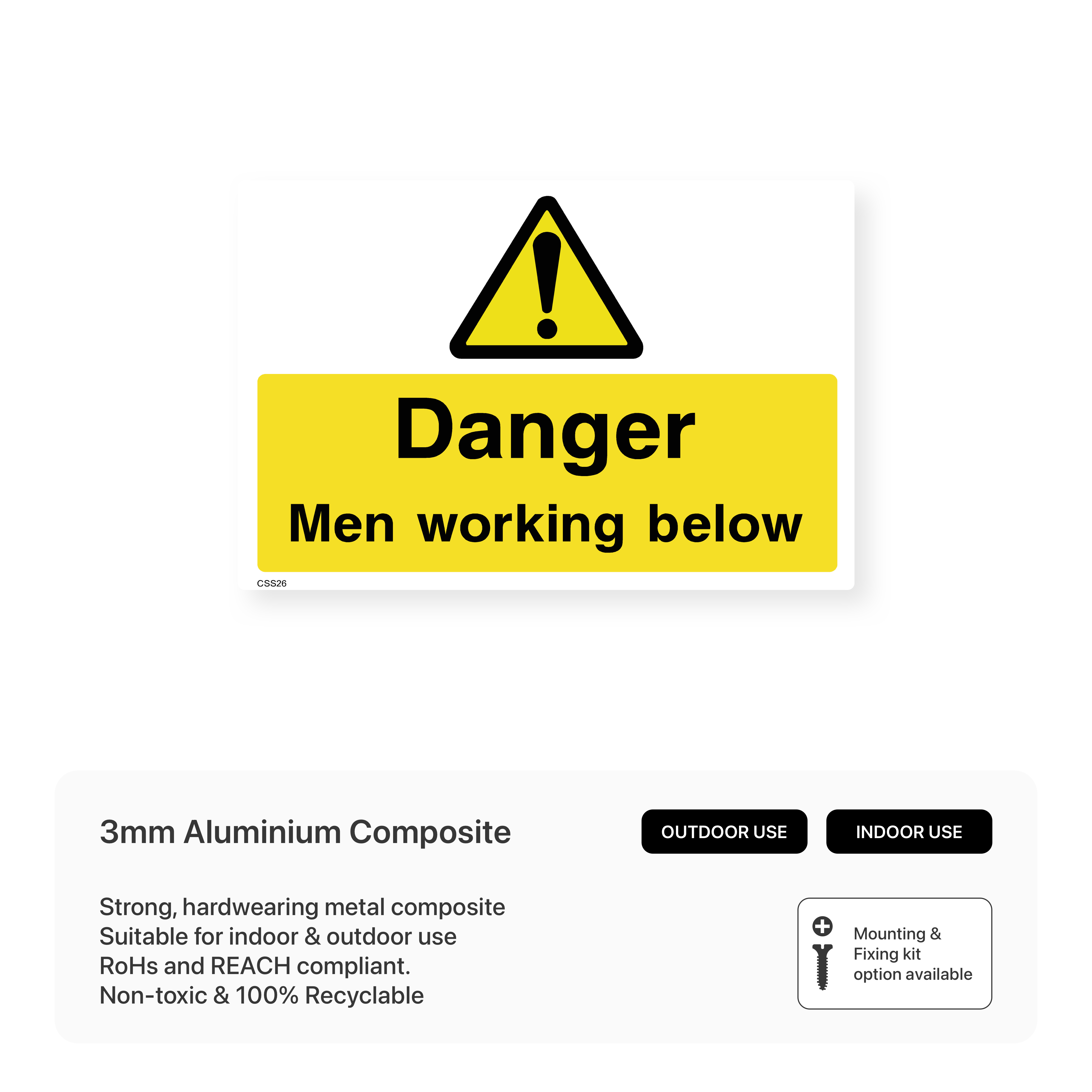 Protect workers below from falling objects with our "Danger men working below" sign. Clearly mark areas where work is being done overhead to prevent accidents and ensure the safety of everyone on site.