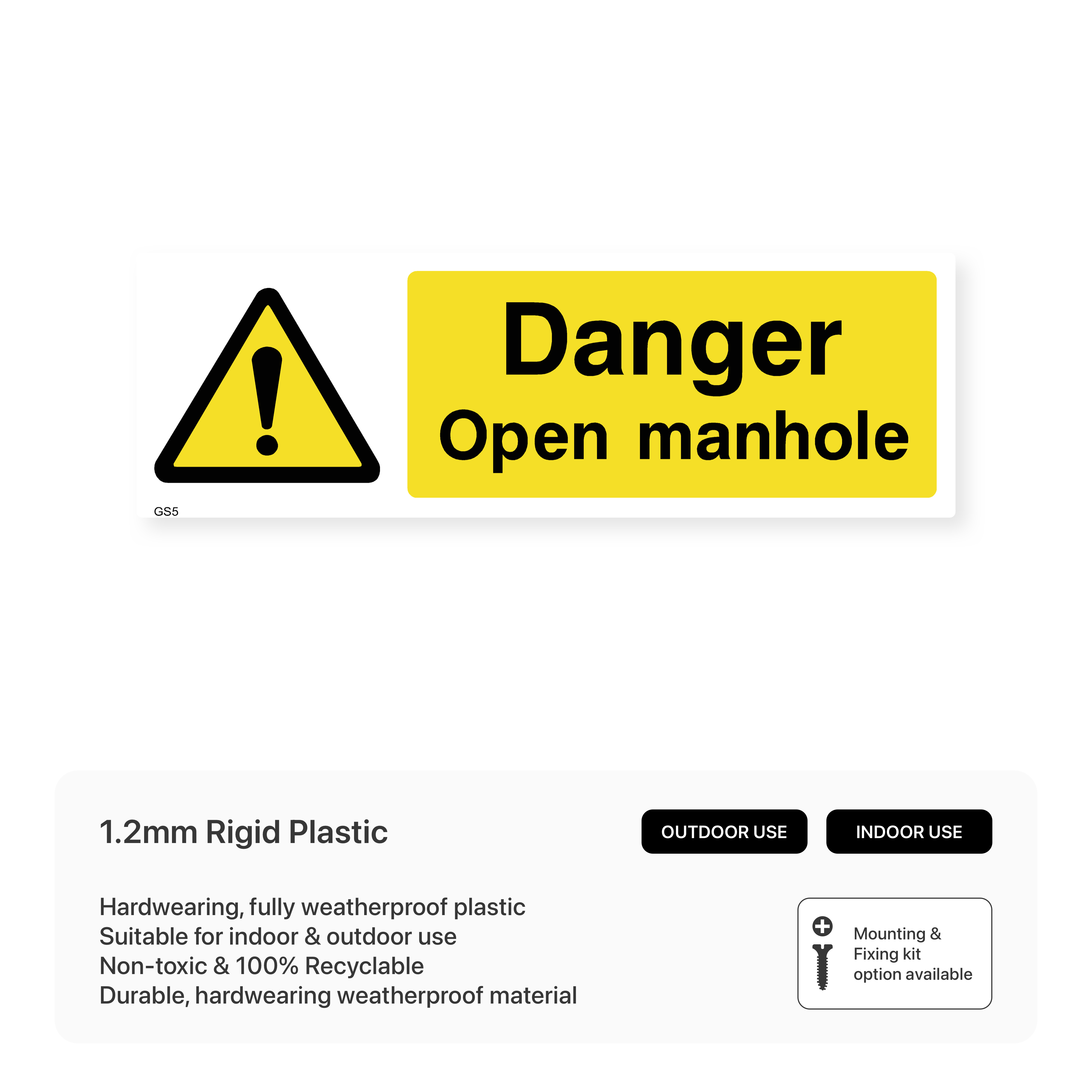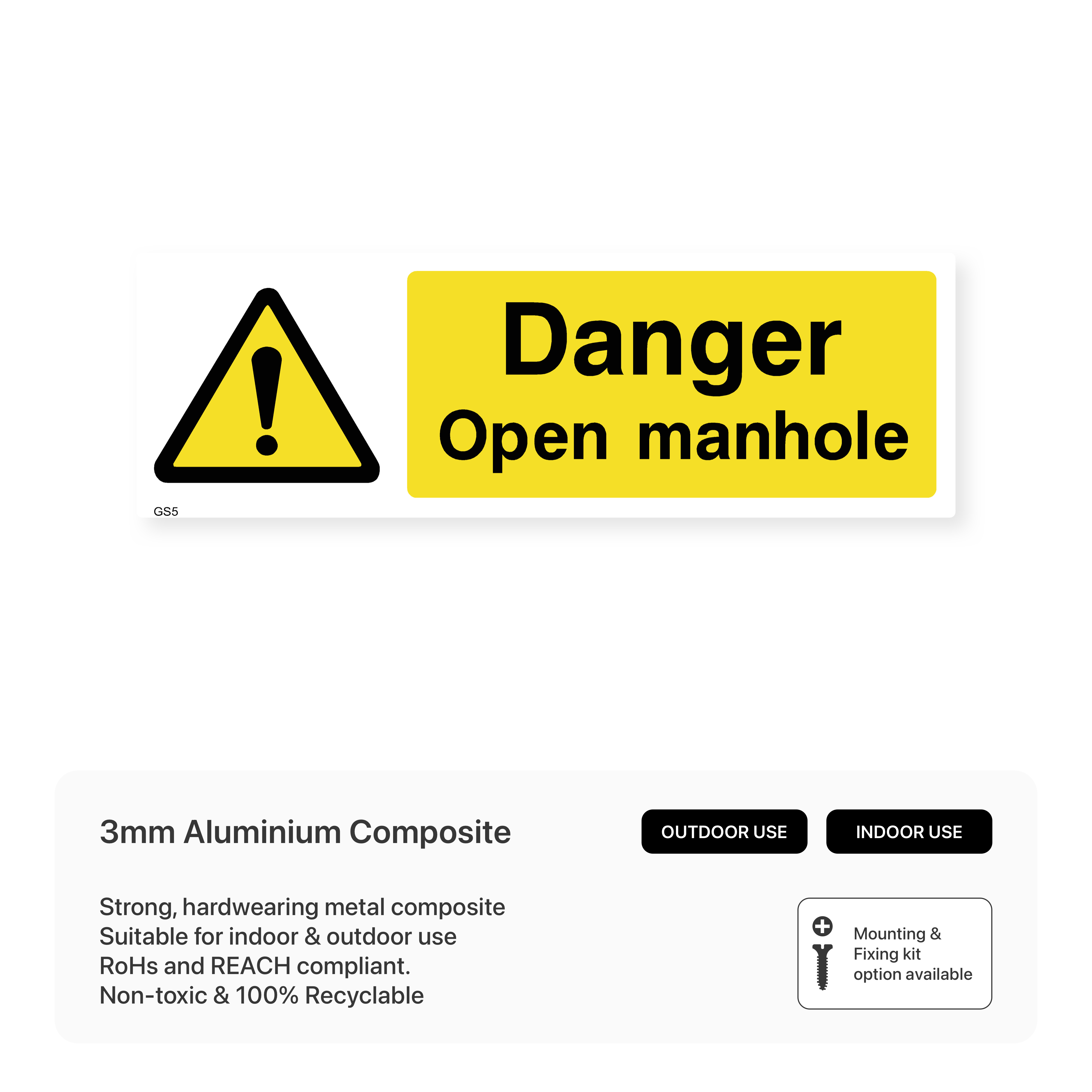 Ensure safety with our "Danger - Open manhole" sign. This sign clearly marks open manholes, alerting workers and visitors to the potential hazard and preventing falls.