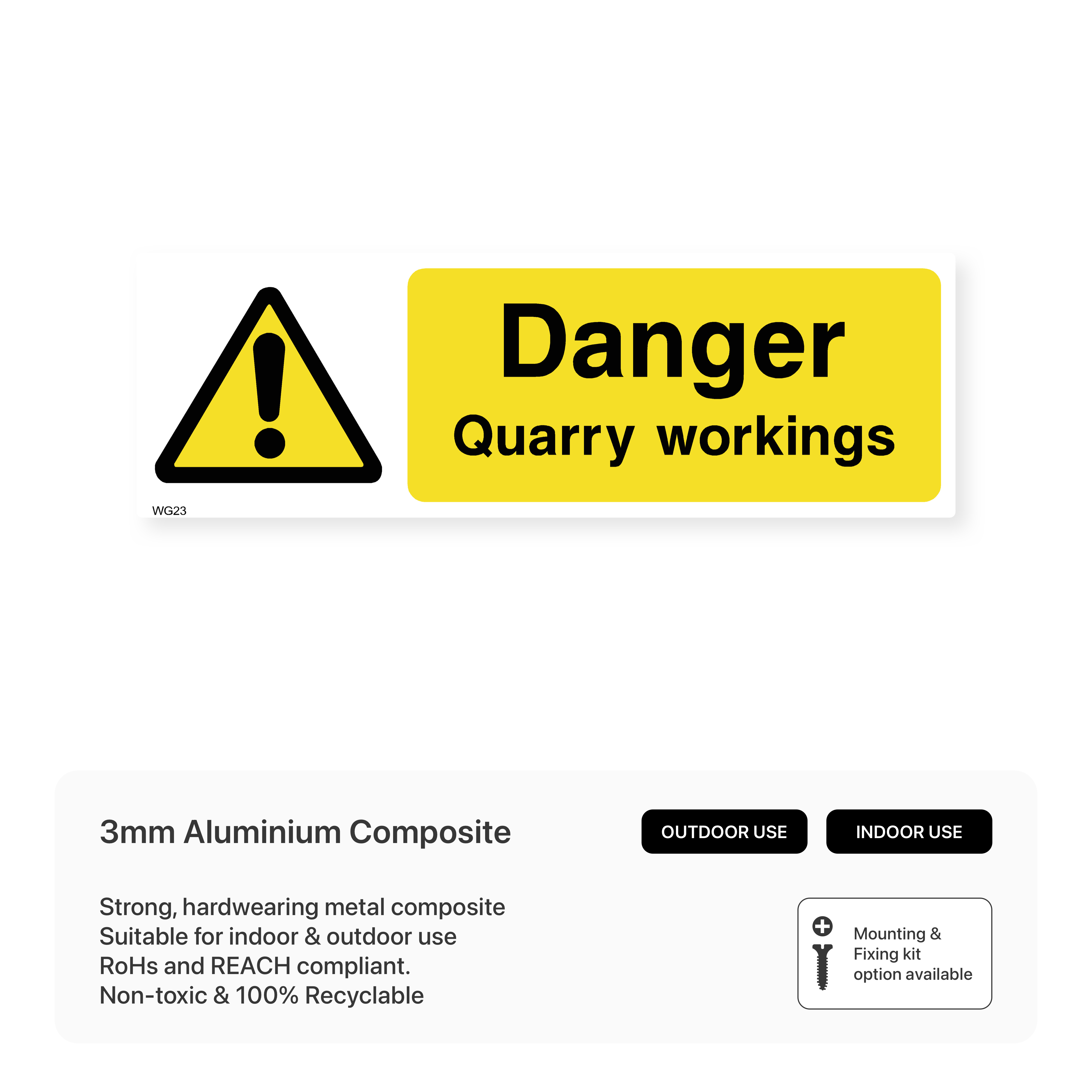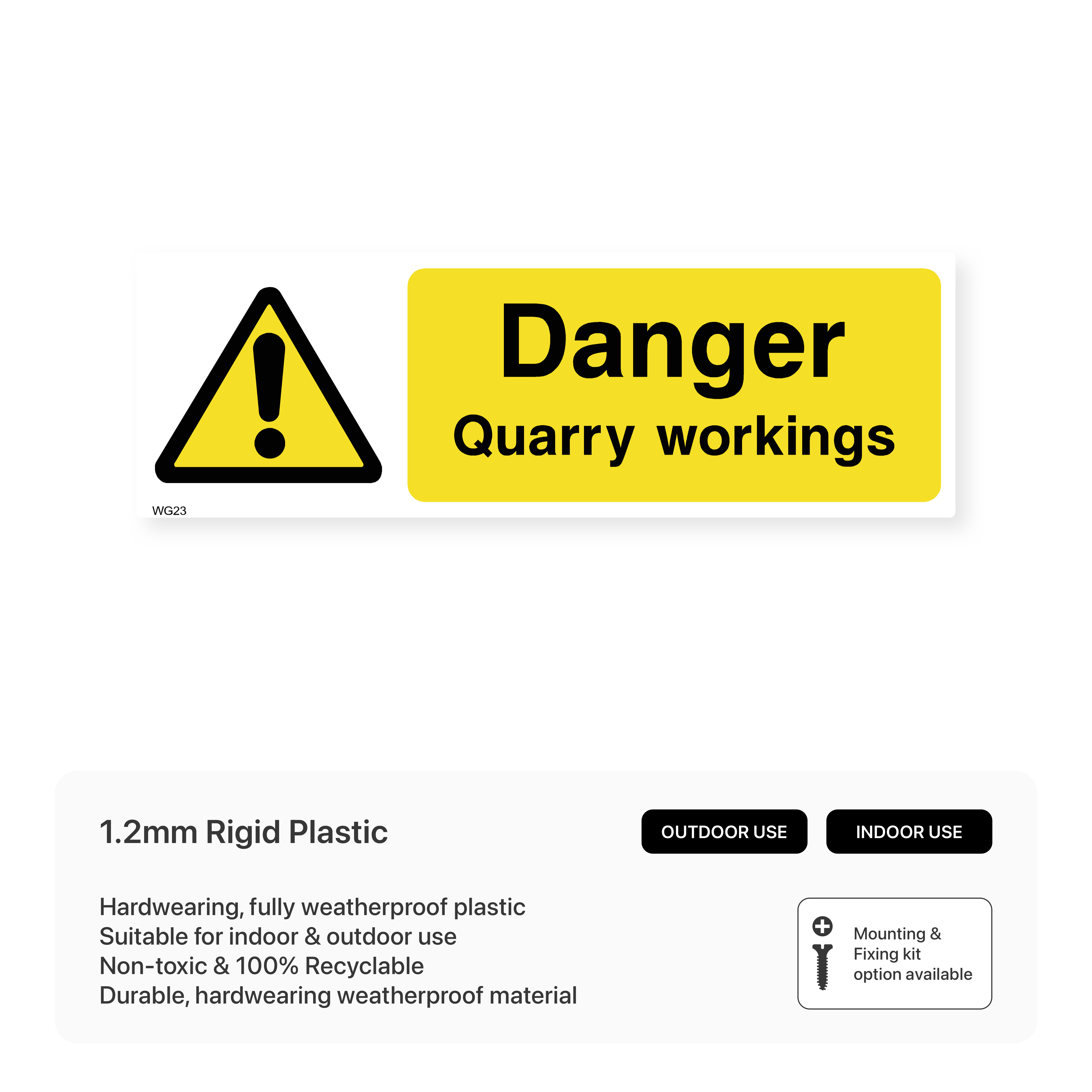 Clearly mark hazardous quarry areas with our "Danger - Quarry Workings" sign. This sign effectively warns of the potential dangers associated with quarry operations, including falling rocks, unstable ground, and heavy machinery.