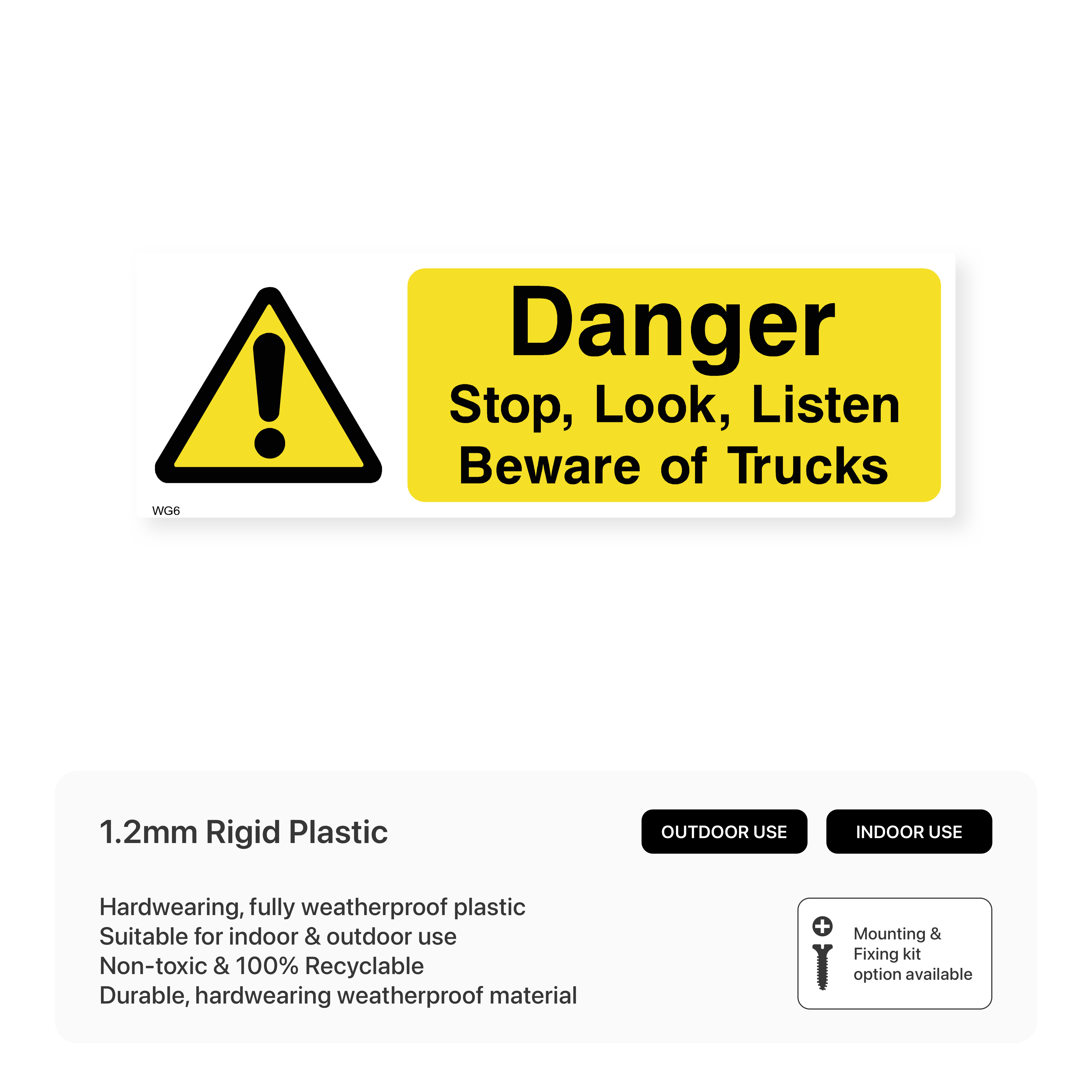 Warn pedestrians and drivers to stop, look, and listen for trucks before crossing or entering a specific area. This sign is essential for industrial sites, loading docks, and other areas with heavy truck traffic.