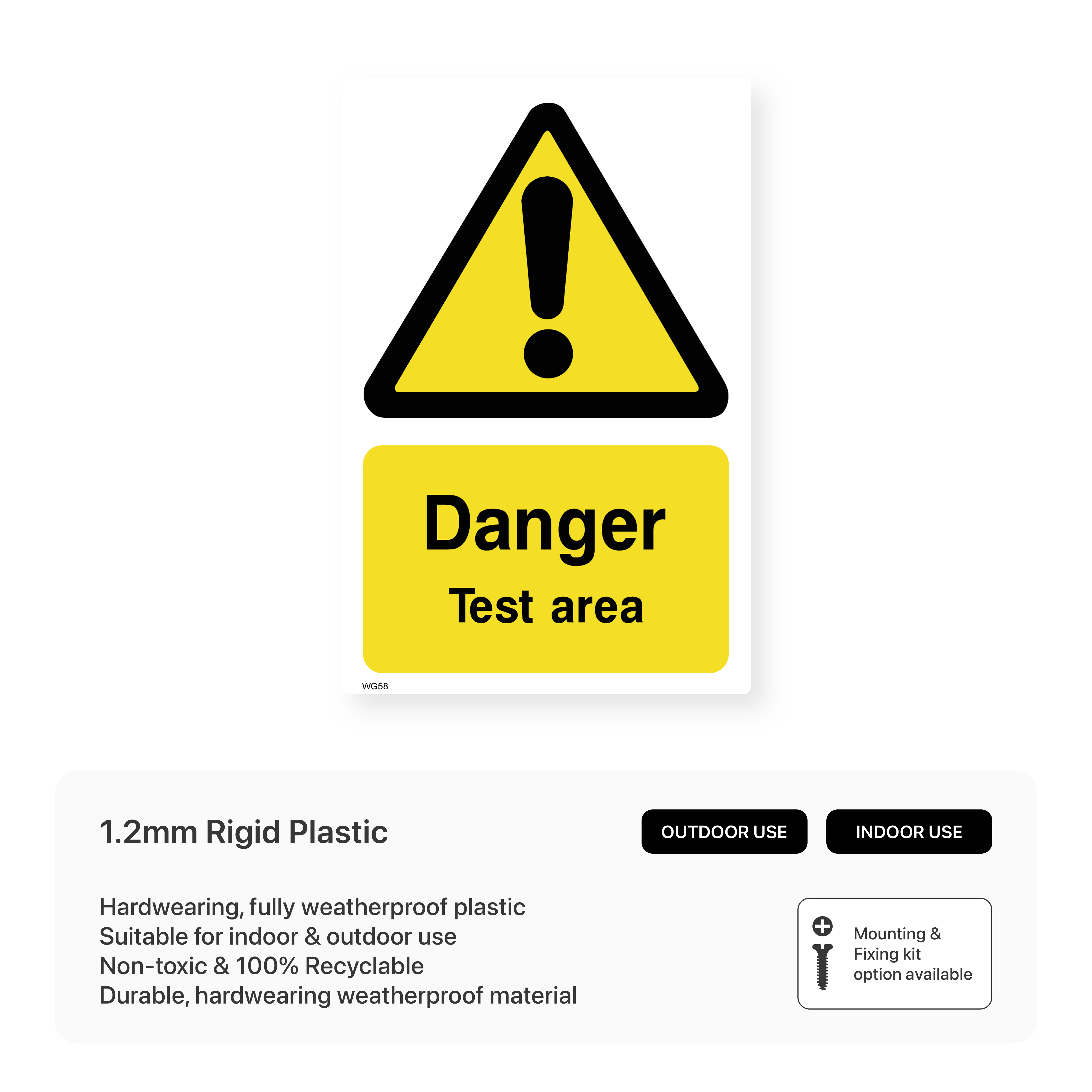 Clearly mark designated test areas with our "Danger - Test Area" sign. This sign effectively communicates that the area is restricted and potentially hazardous due to ongoing tests. Ensure safety and prevent unauthorised access with this essential sign.