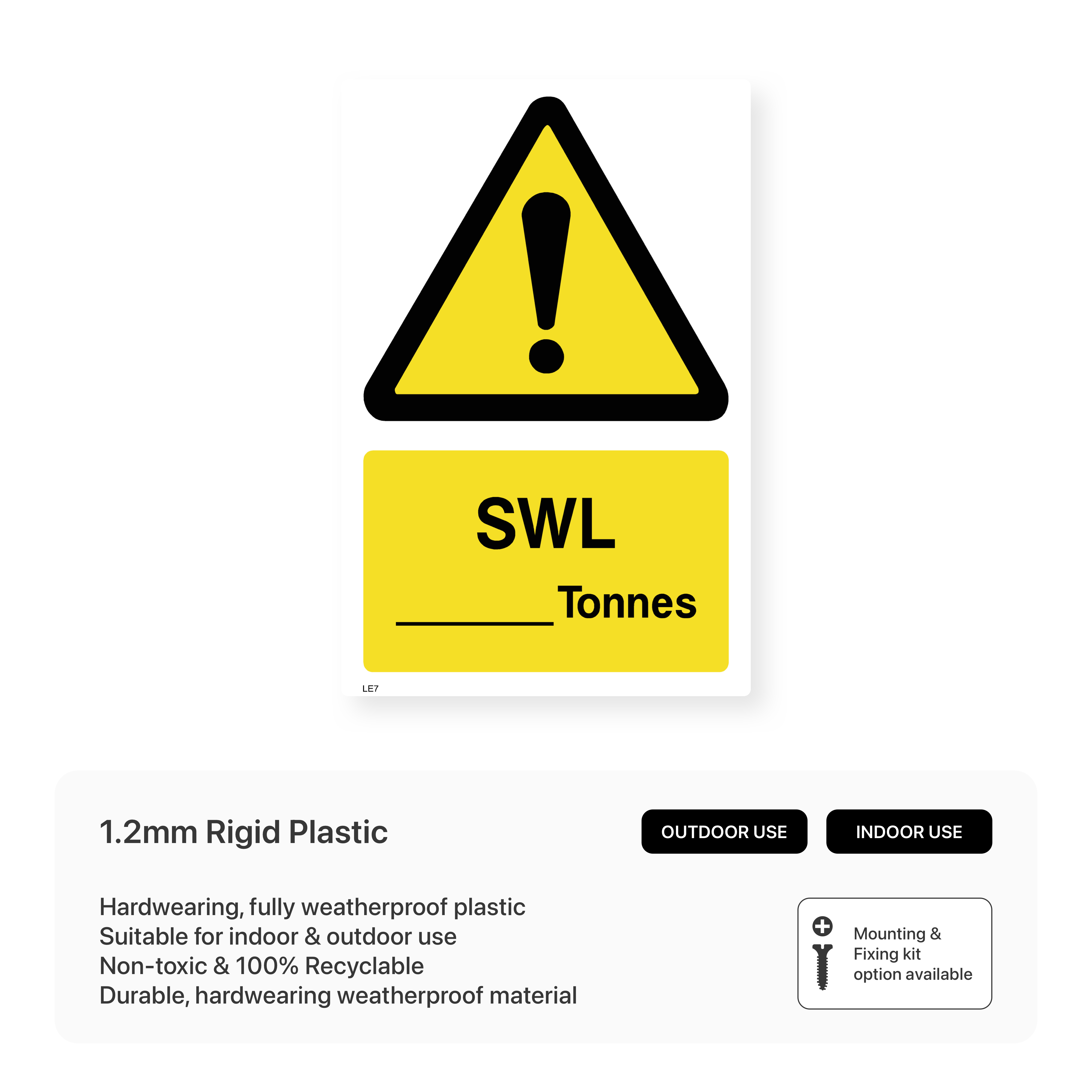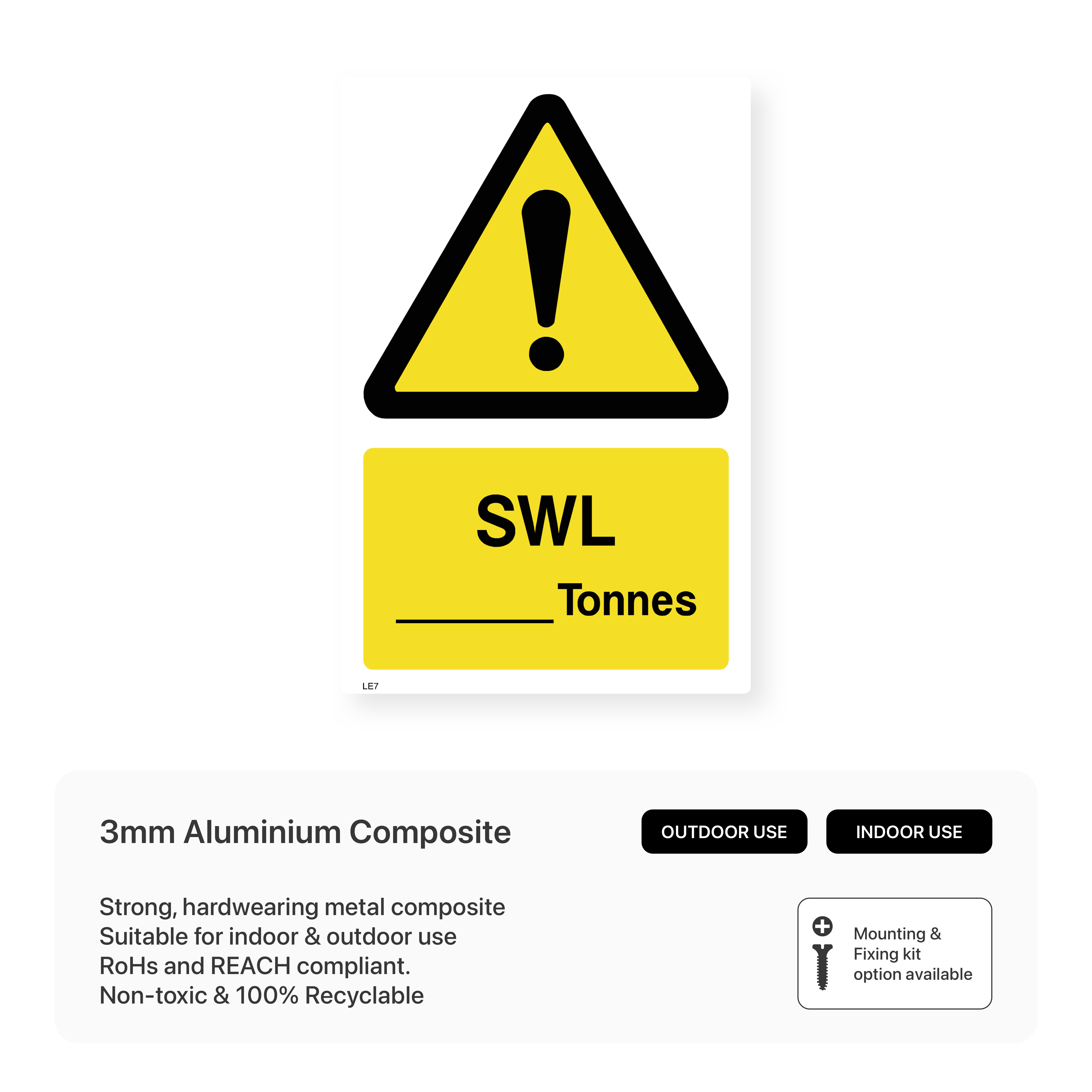 Clearly communicate the safe working load (SWL) in tonnes for lifts and other heavy machinery with this informative sign. Ensure compliance with safety regulations and prevent overloading with this customizable sign, displaying your specific SWL limit in a clear and visible format.