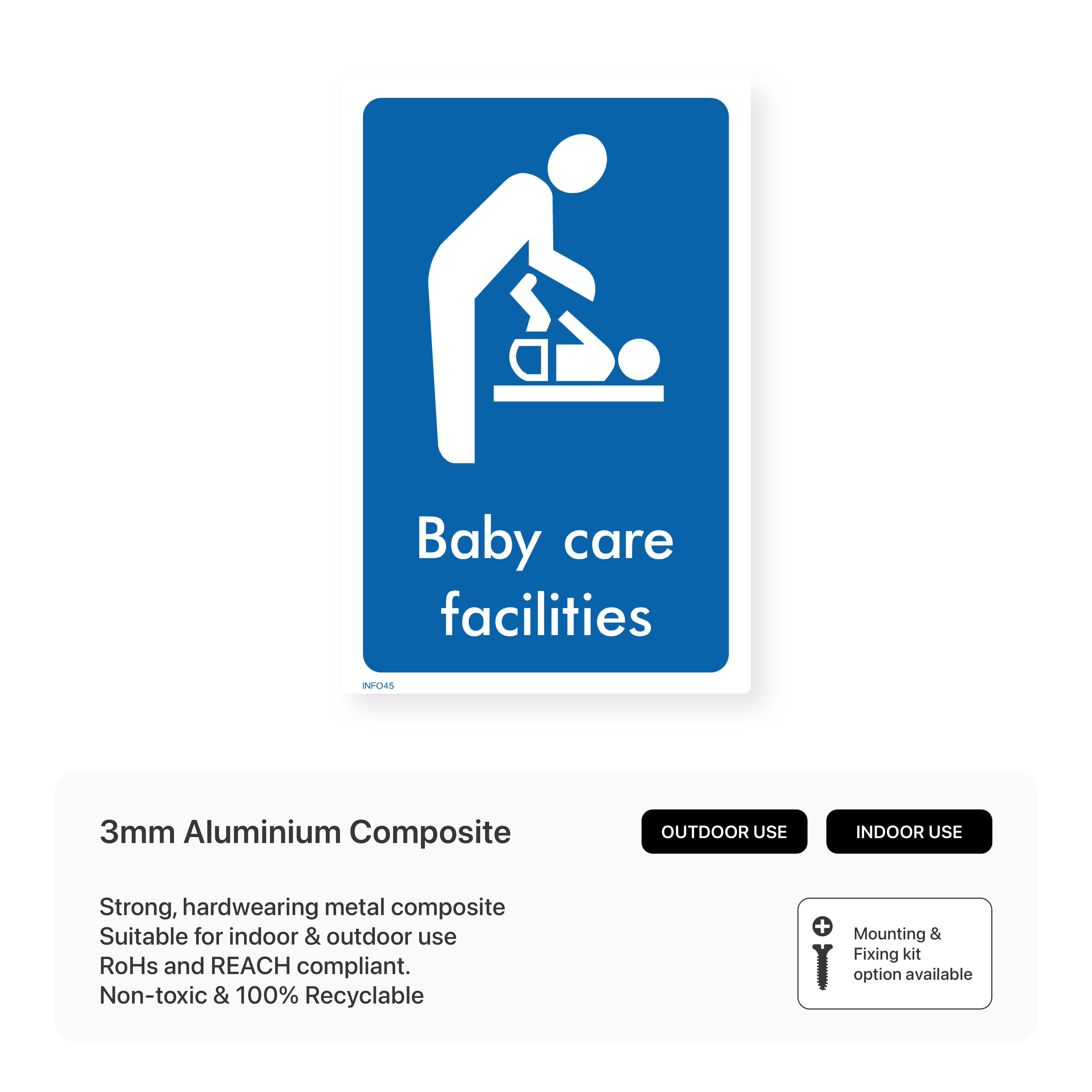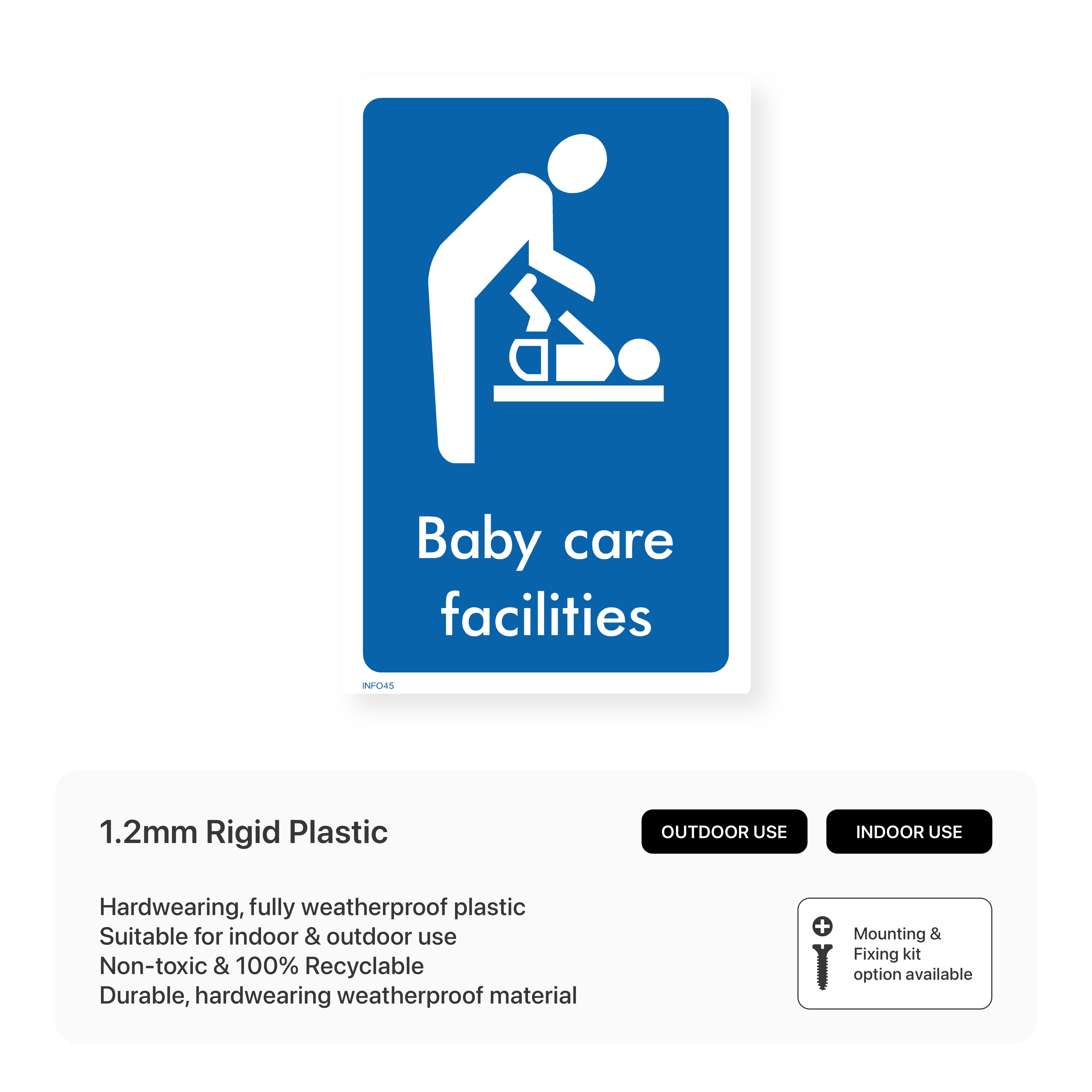 Clearly mark the location of baby care facilities with our "Baby care facilities" sign. This sign helps parents easily locate designated areas for baby care, providing convenience and comfort.